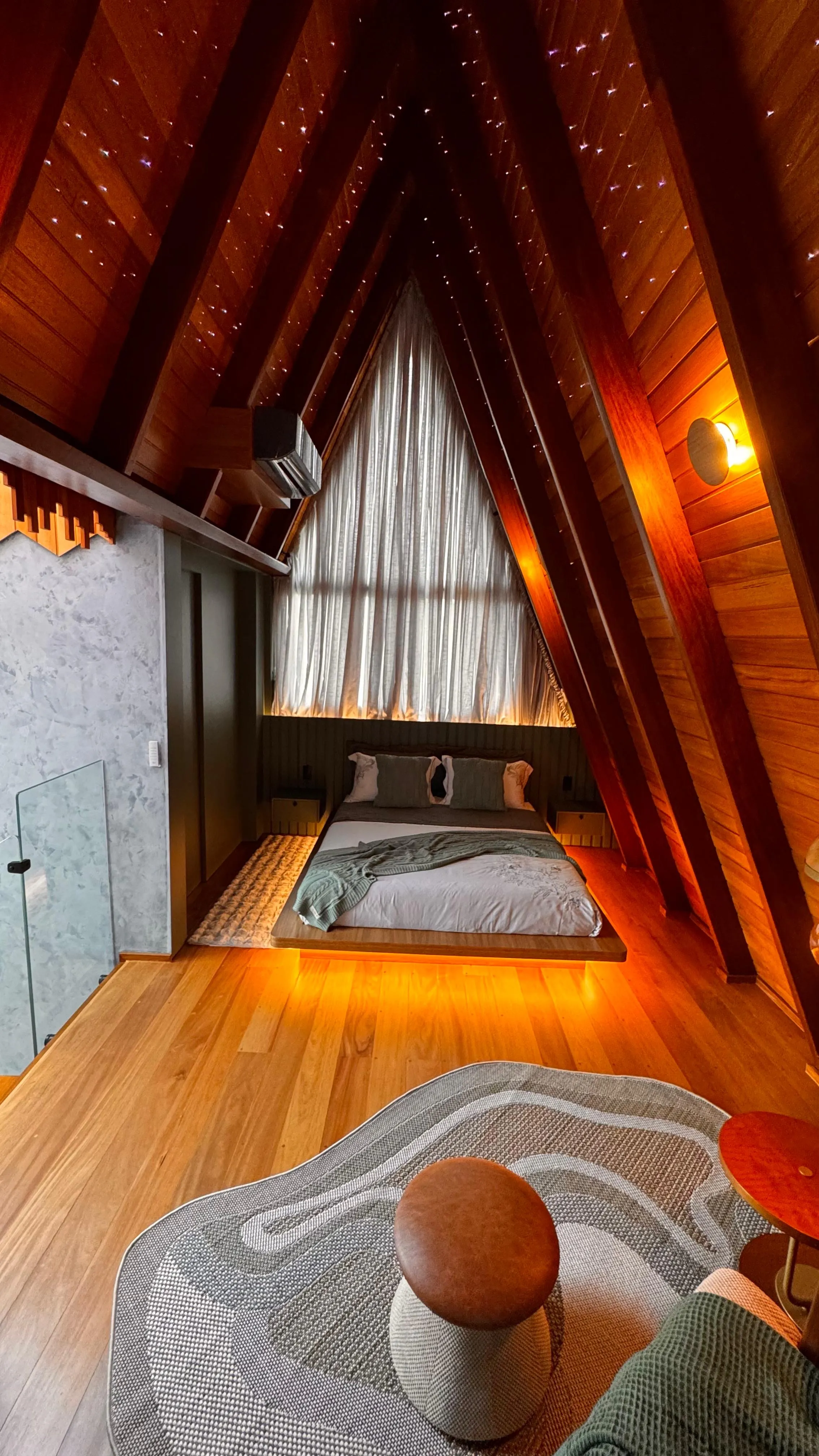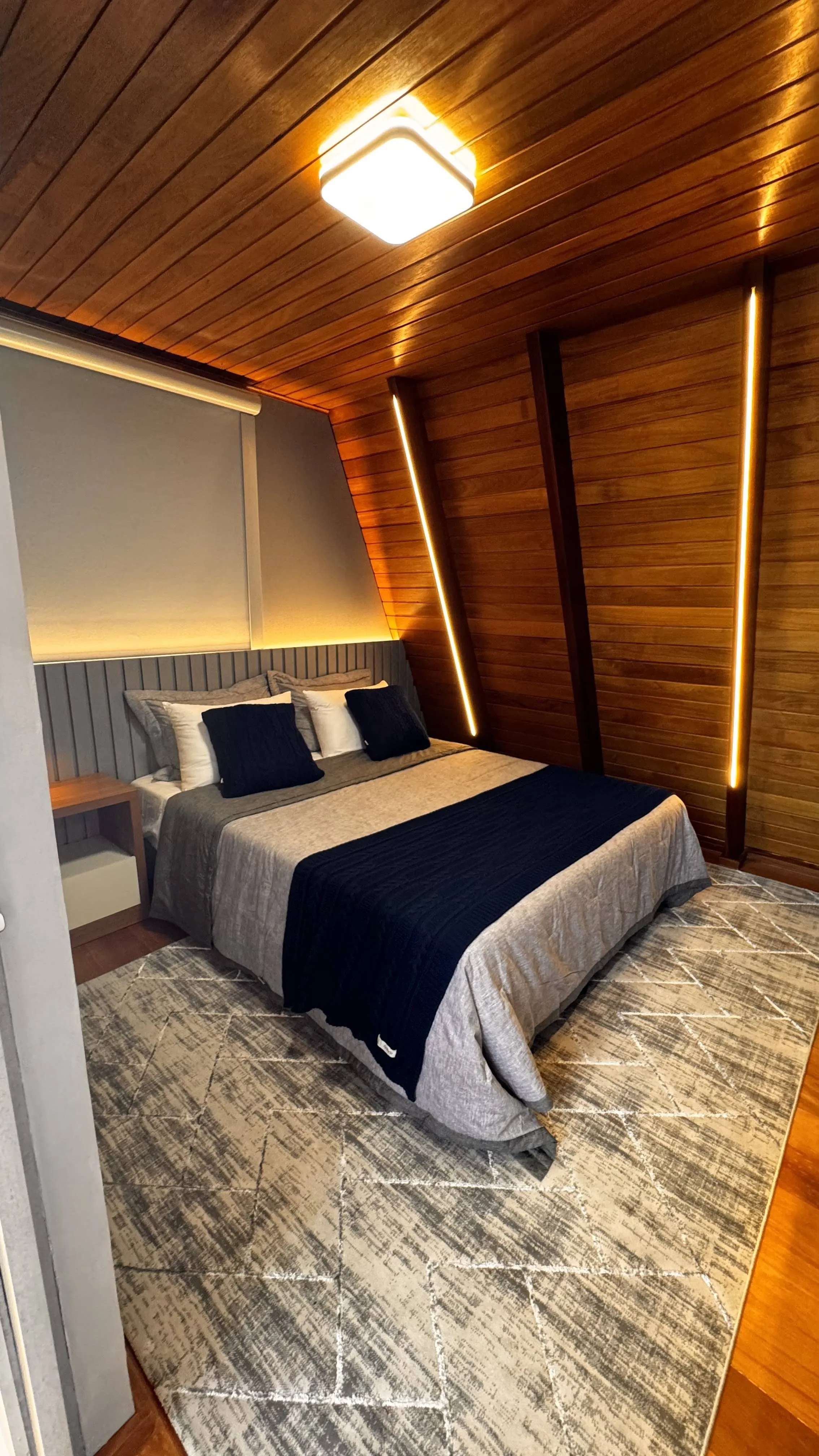 A acomodação conta com piscina e sauna, criando momentos ideais de descanso e bem-estar em qualquer horário do dia. A proposta é proporcionar uma estadia marcante, com atmosfera intimista, silêncio e contato direto com a paisagem natural da região.
