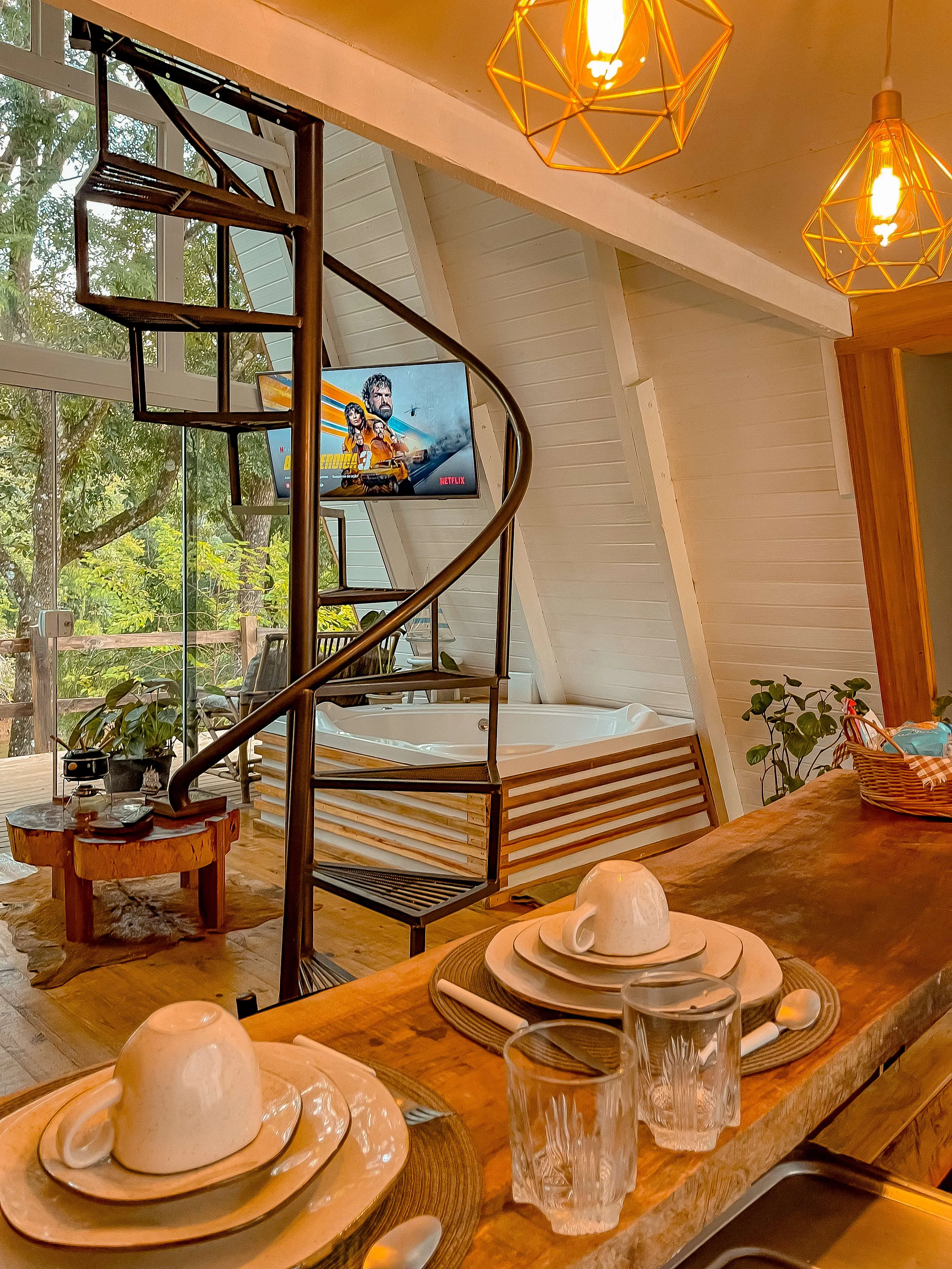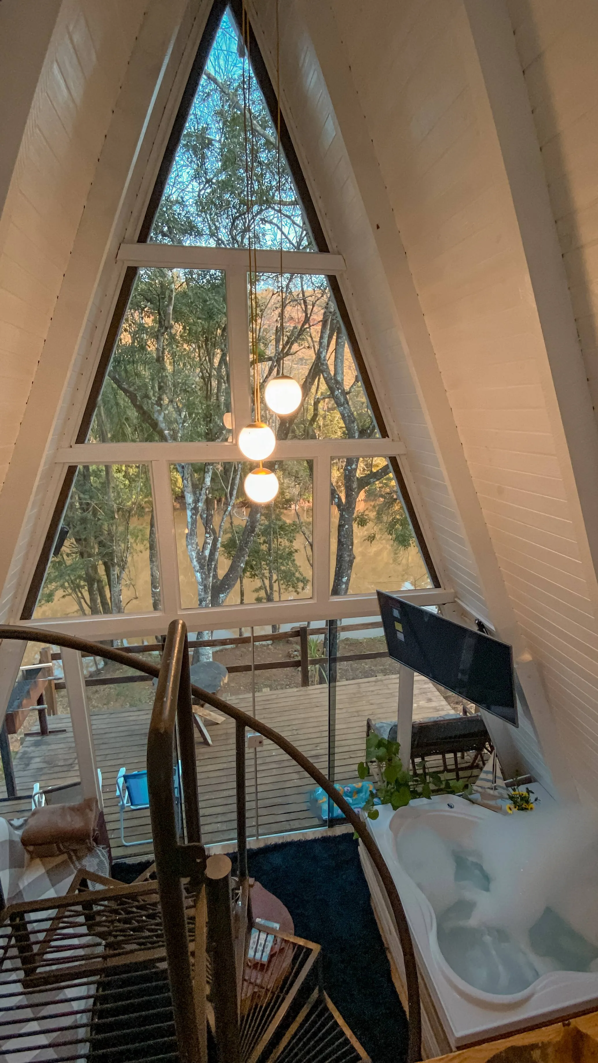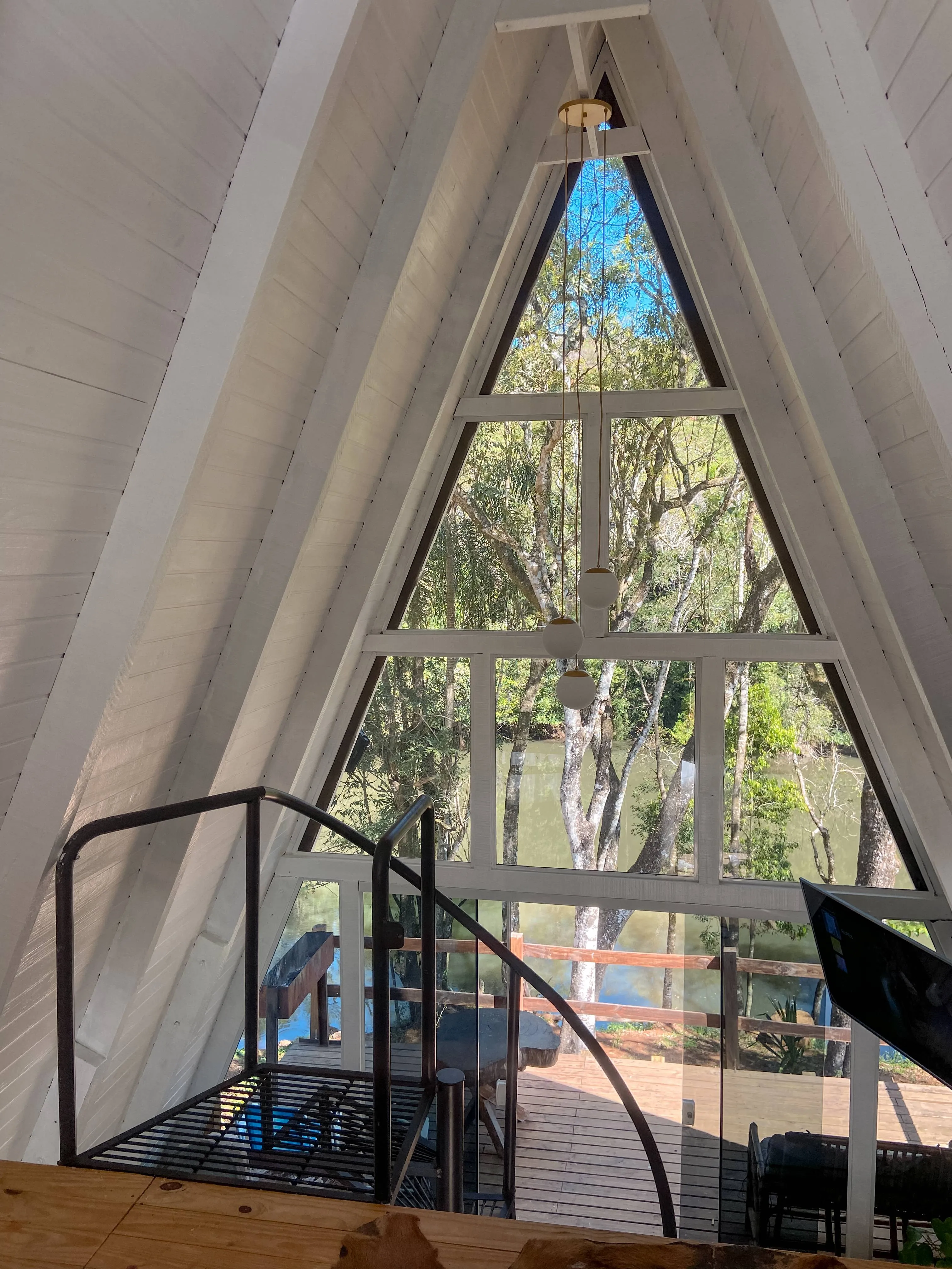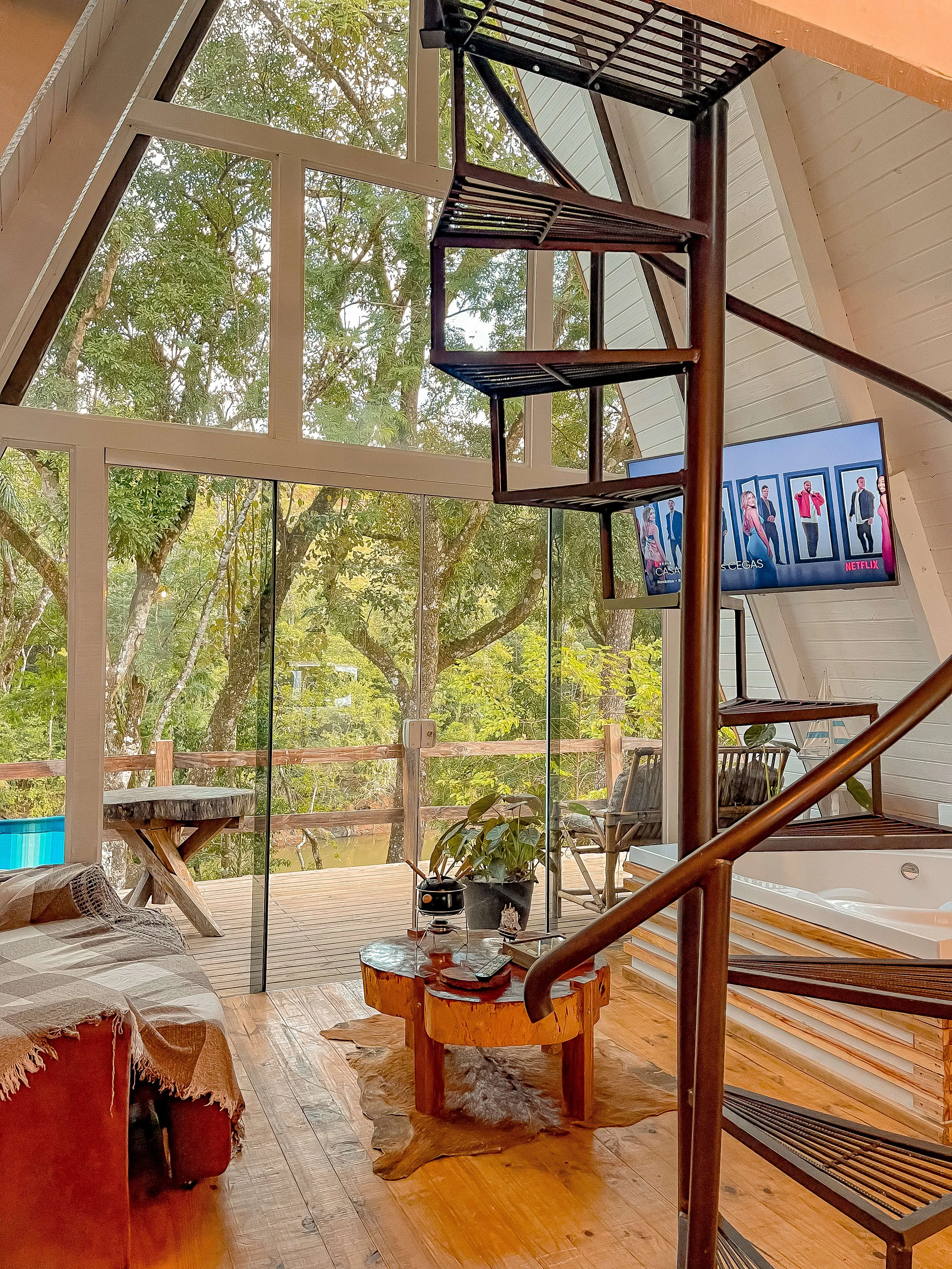Chalé A-Frame às margens de um rio, com banheira de hidromassagem, quarto no mezanino, sala e cozinha integradas, e banheiro. Na parte externa, um deck com vista para o rio. Próximo ao chalé, há uma cachoeira de fácil acesso, com dois caiaques disponíveis para os hóspedes, que podem usá-los para chegar até a cachoeira ou optar pelo acesso por terra. A experiência proporciona conexão plena com a natureza, com momentos de tranquilidade ao som dos pássaros, além de conforto e privacidade.