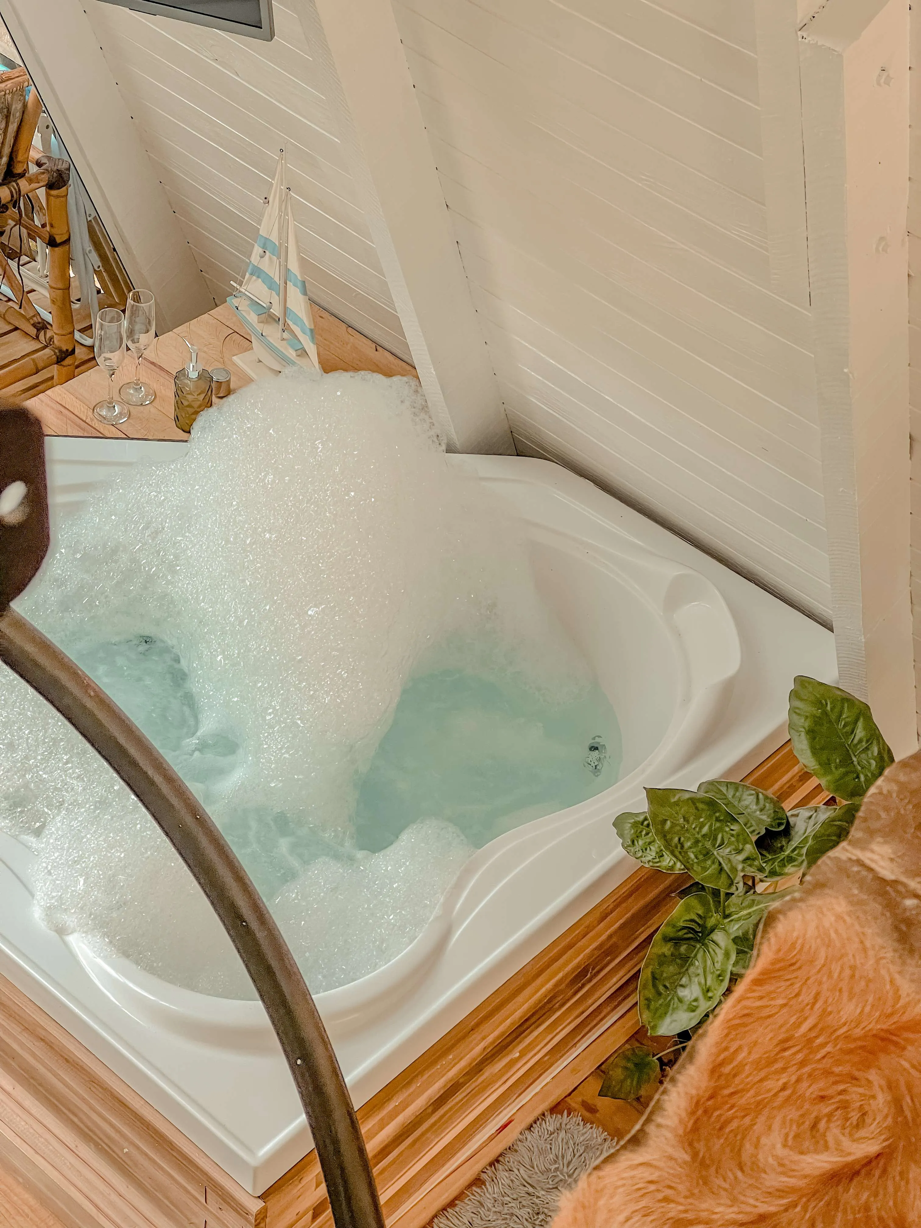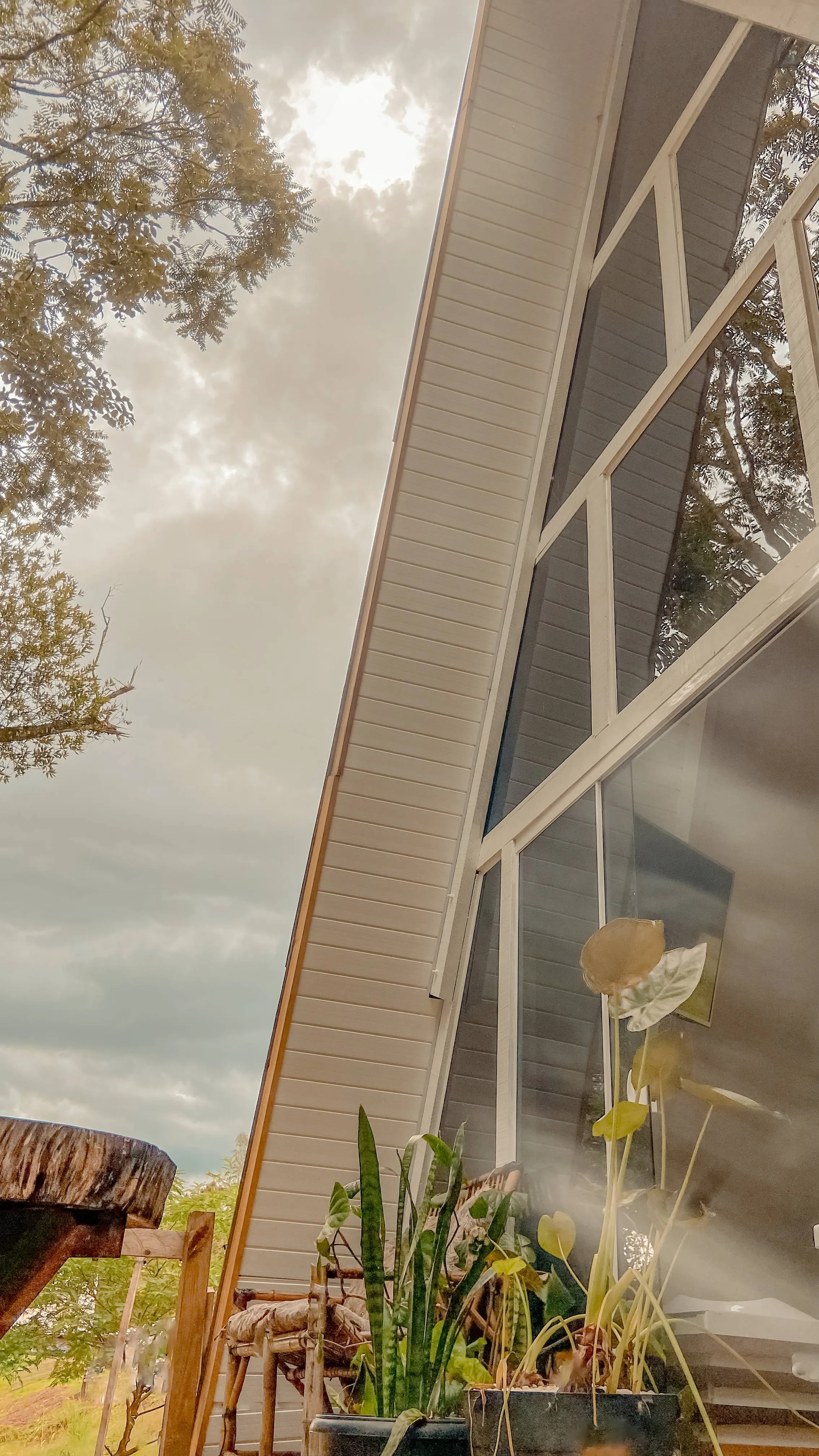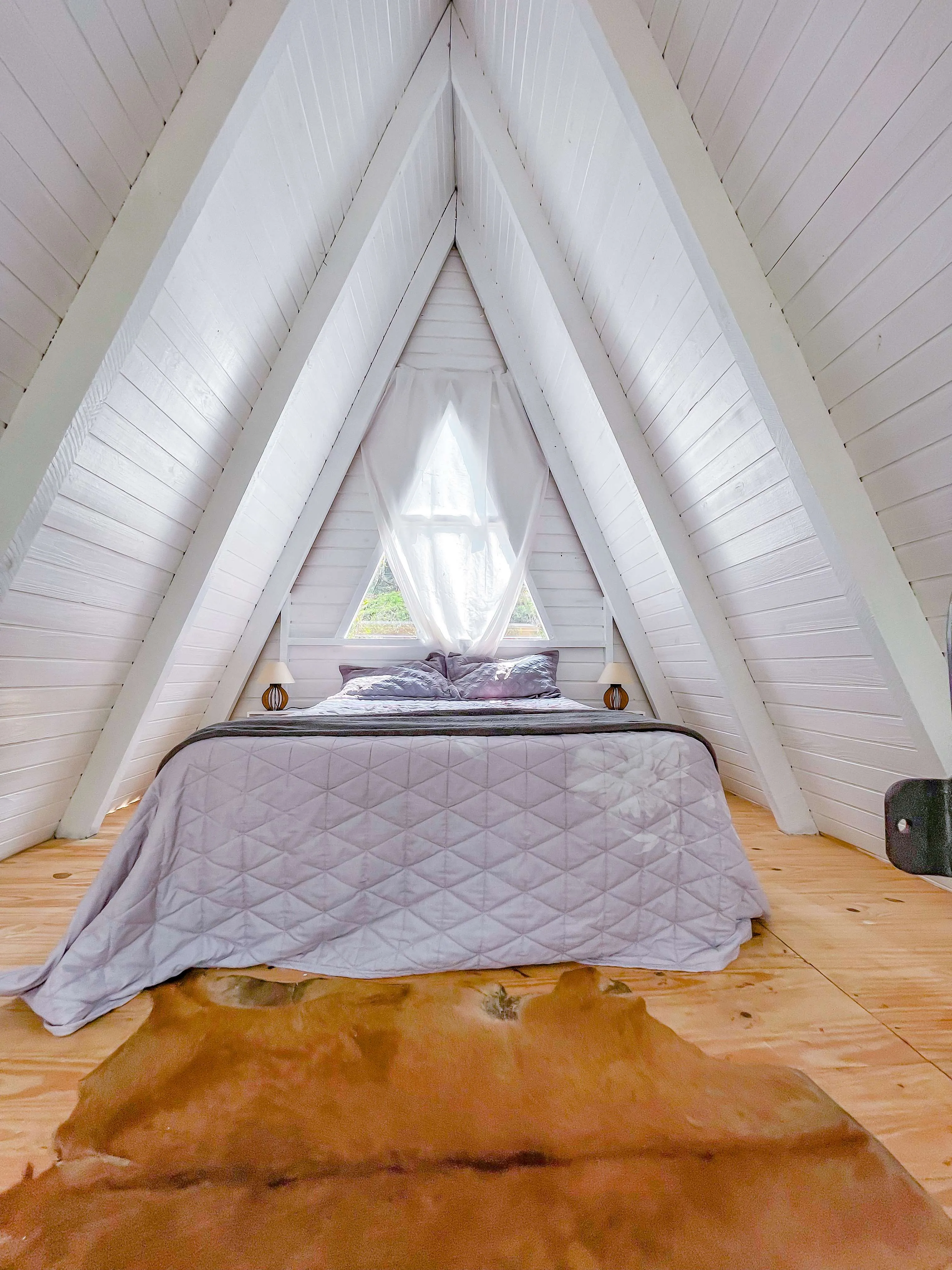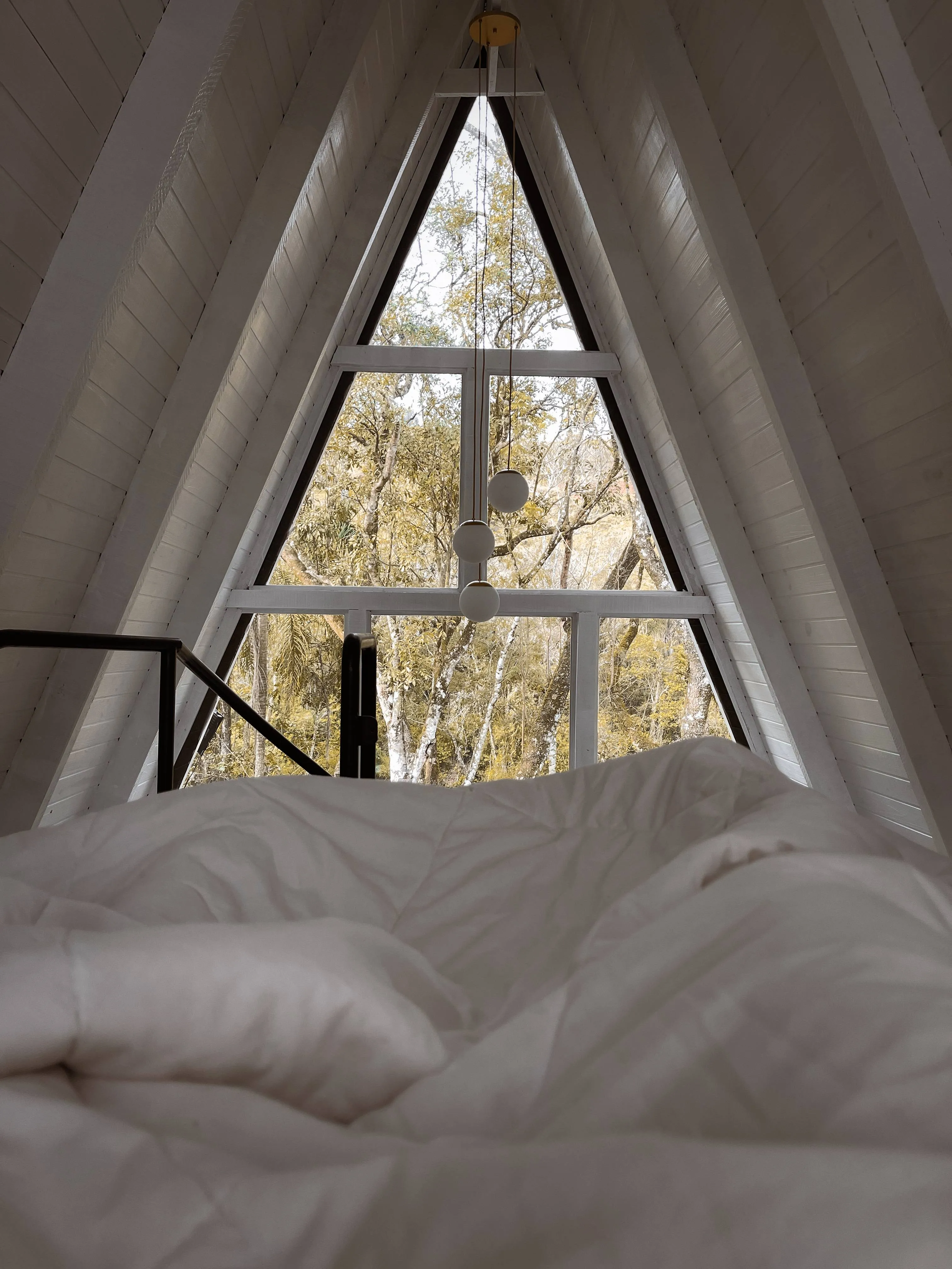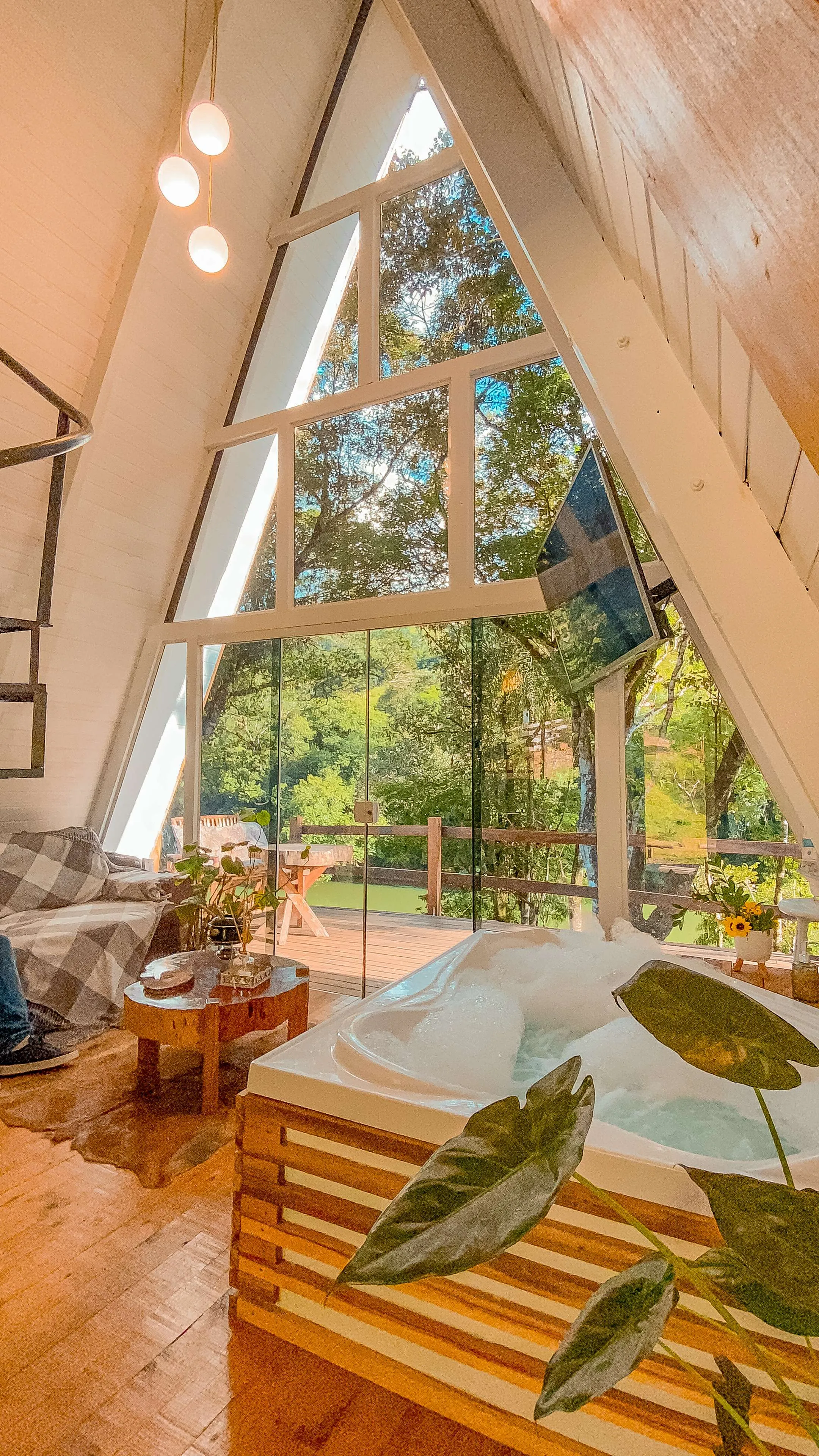 Chalé A-Frame às margens de um rio, com banheira de hidromassagem, quarto no mezanino, sala e cozinha integradas, e banheiro. Na parte externa, um deck com vista para o rio. Próximo ao chalé, há uma cachoeira de fácil acesso, com dois caiaques disponíveis para os hóspedes, que podem usá-los para chegar até a cachoeira ou optar pelo acesso por terra. A experiência proporciona conexão plena com a natureza, com momentos de tranquilidade ao som dos pássaros, além de conforto e privacidade.