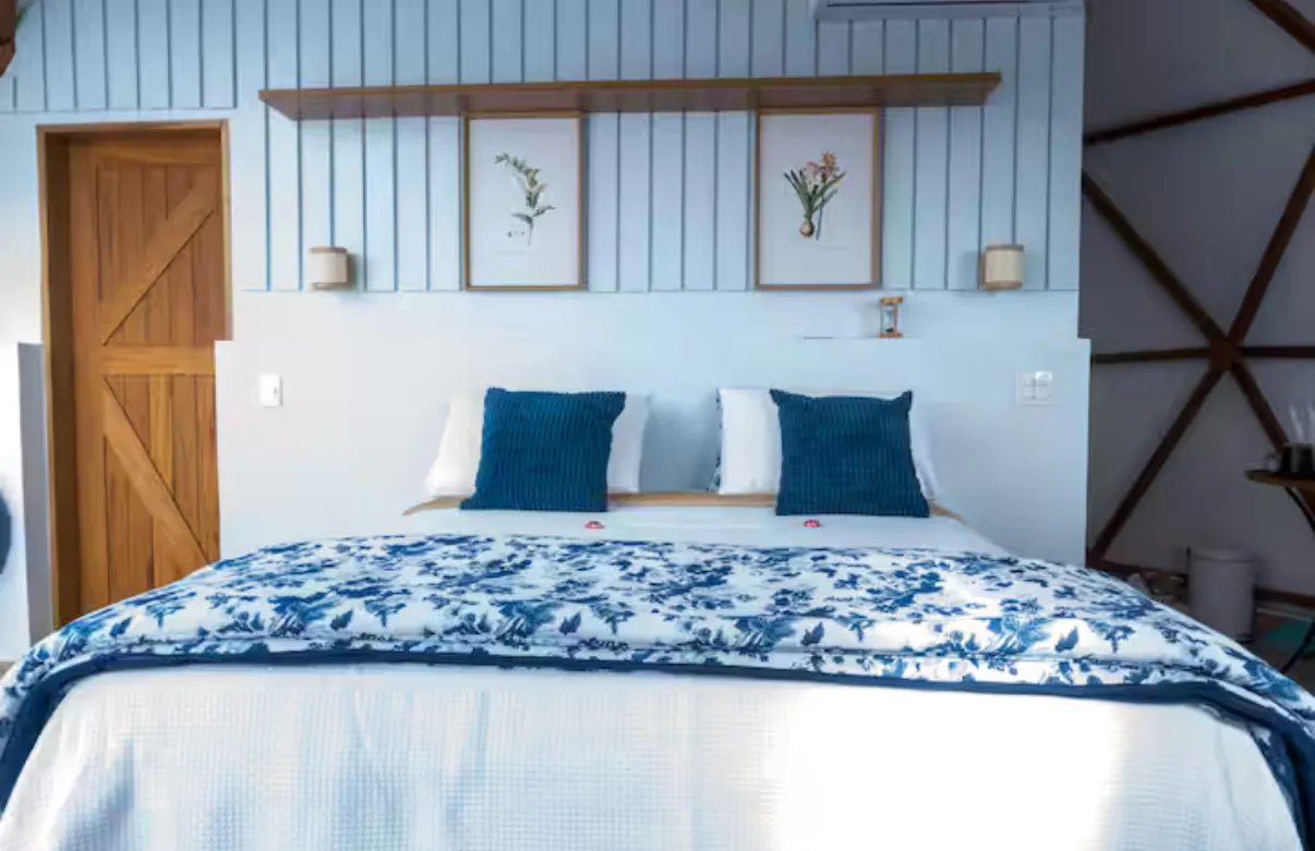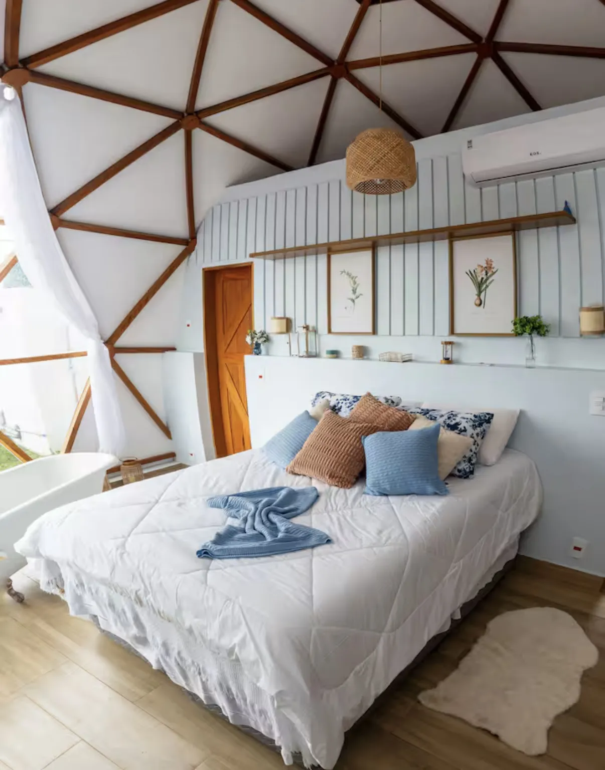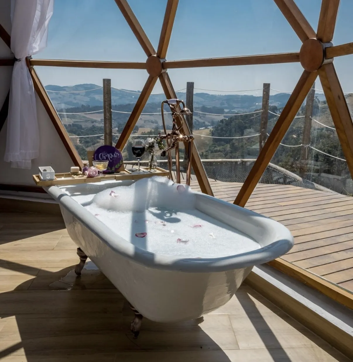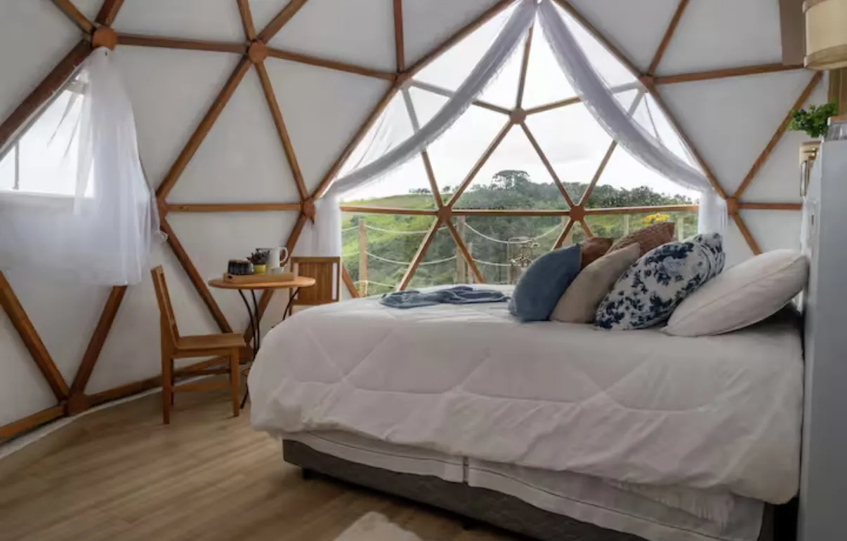 O domo é cuidadosamente decorado, mesclando estilo rústico e delicadeza, e proporciona experiências sensoriais que vão além da estadia: café da manhã com produtos locais, noites aquecidas à beira da fogueira, céu estrelado e paisagens de tirar o fôlego.
