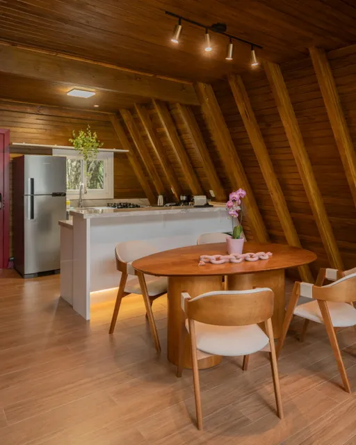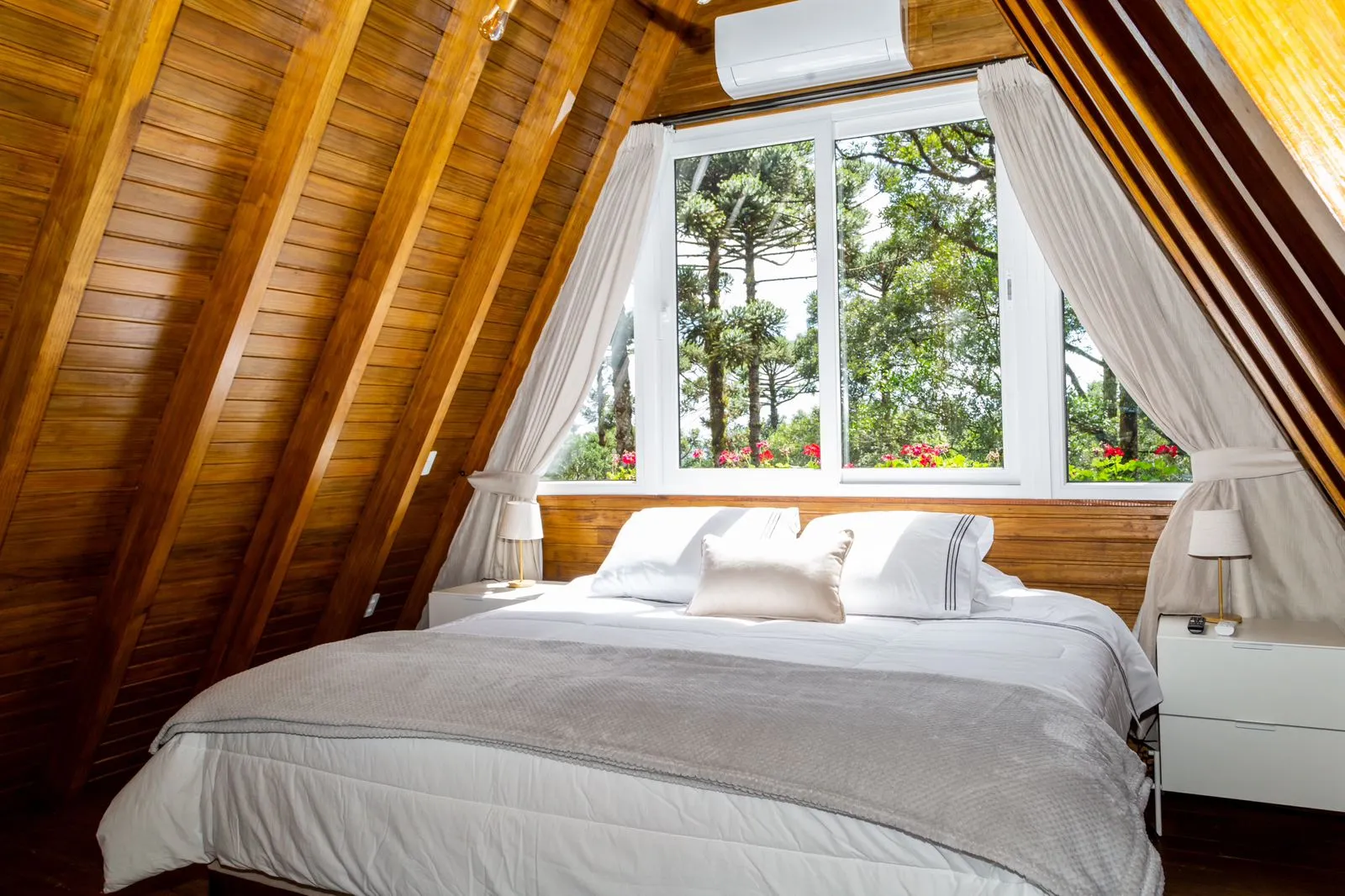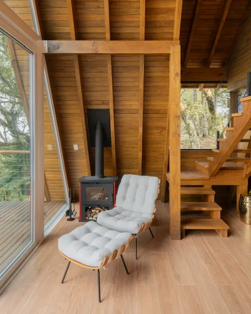 A Cabana Araucária oferece uma experiência exclusiva em meio à natureza, com estrutura de alto padrão e capacidade para até cinco pessoas. Ideal para casais, famílias e amigos que buscam conforto e uma vista deslumbrante das montanhas. Conta com dois quartos, um no primeiro pavimento com cama queen size e outro no mezanino com cama king size, ampla sala de estar, banheiro, lavabo e calefator para os dias frios. O deck possui banheira SPA de hidromassagem e cromoterapia. A cozinha está totalmente equipada, e a região oferece opções gastronômicas e serviços de entrega.