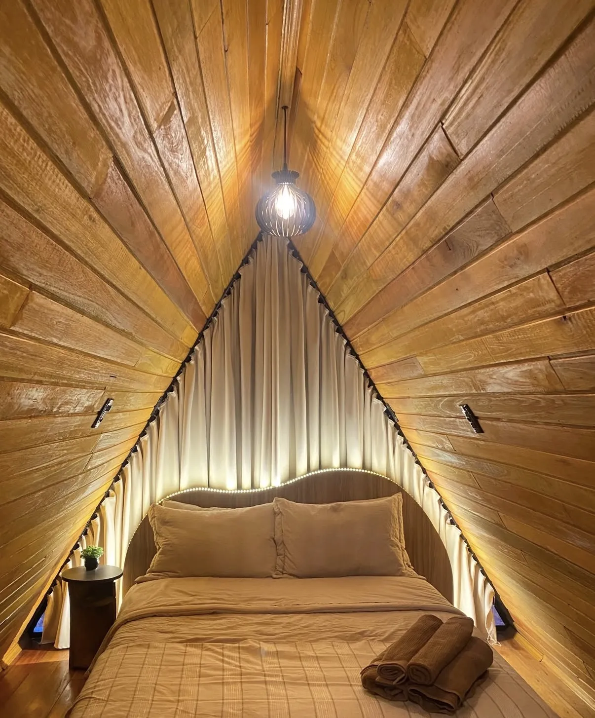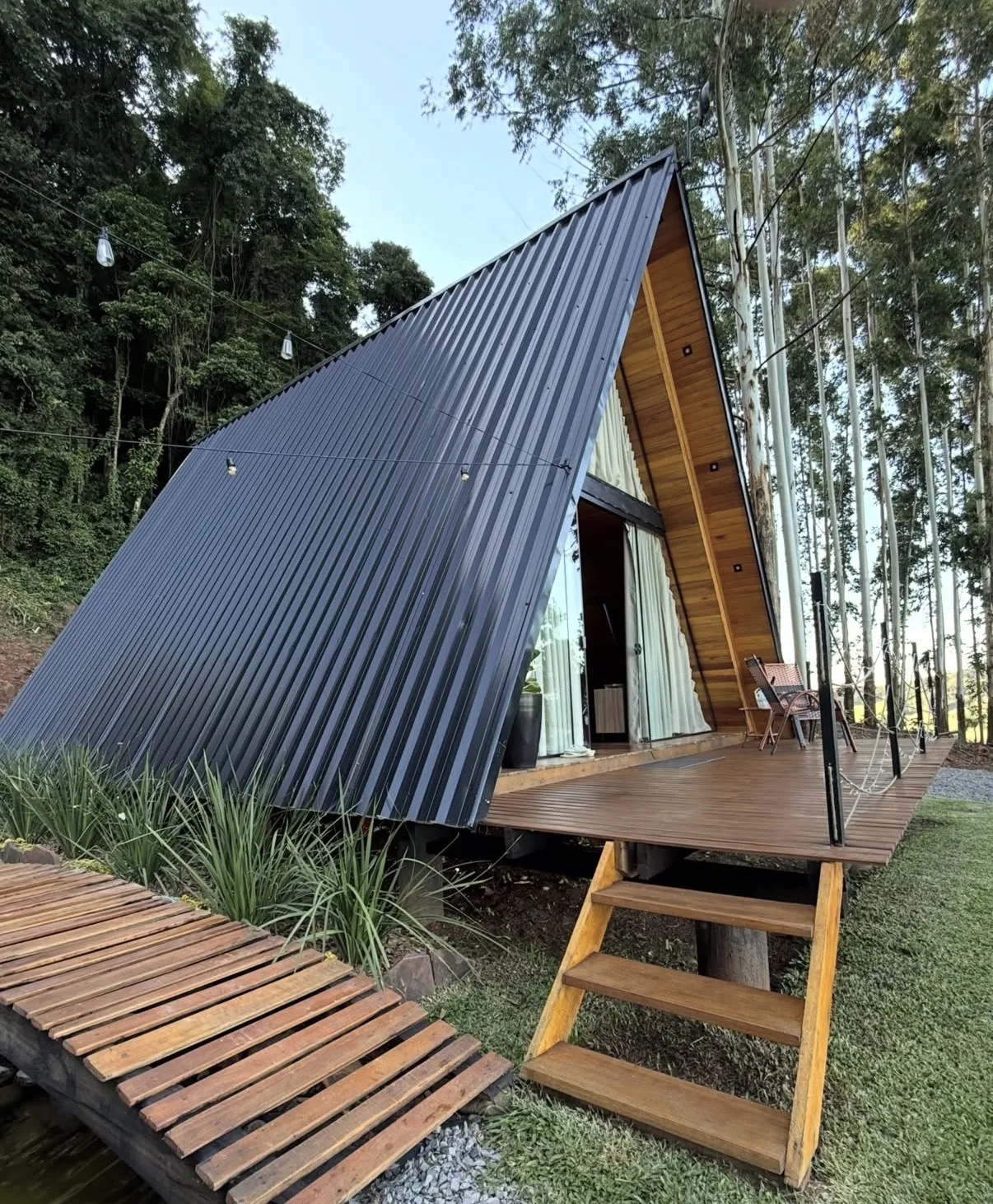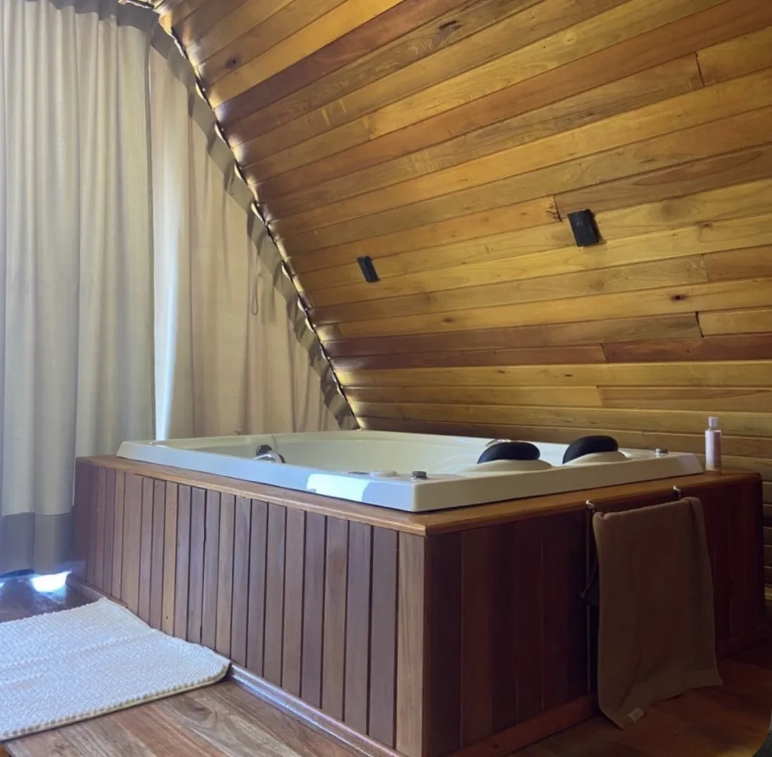 A Cabana Della Collina é um refúgio no estilo A-frame que se destaca pela arquitetura marcante e pela vista privilegiada da cidade. Com estrutura triangular e amplas aberturas em vidro, a acomodação proporciona luminosidade natural e integração com a paisagem, criando um ambiente acolhedor e sofisticado para momentos de descanso.