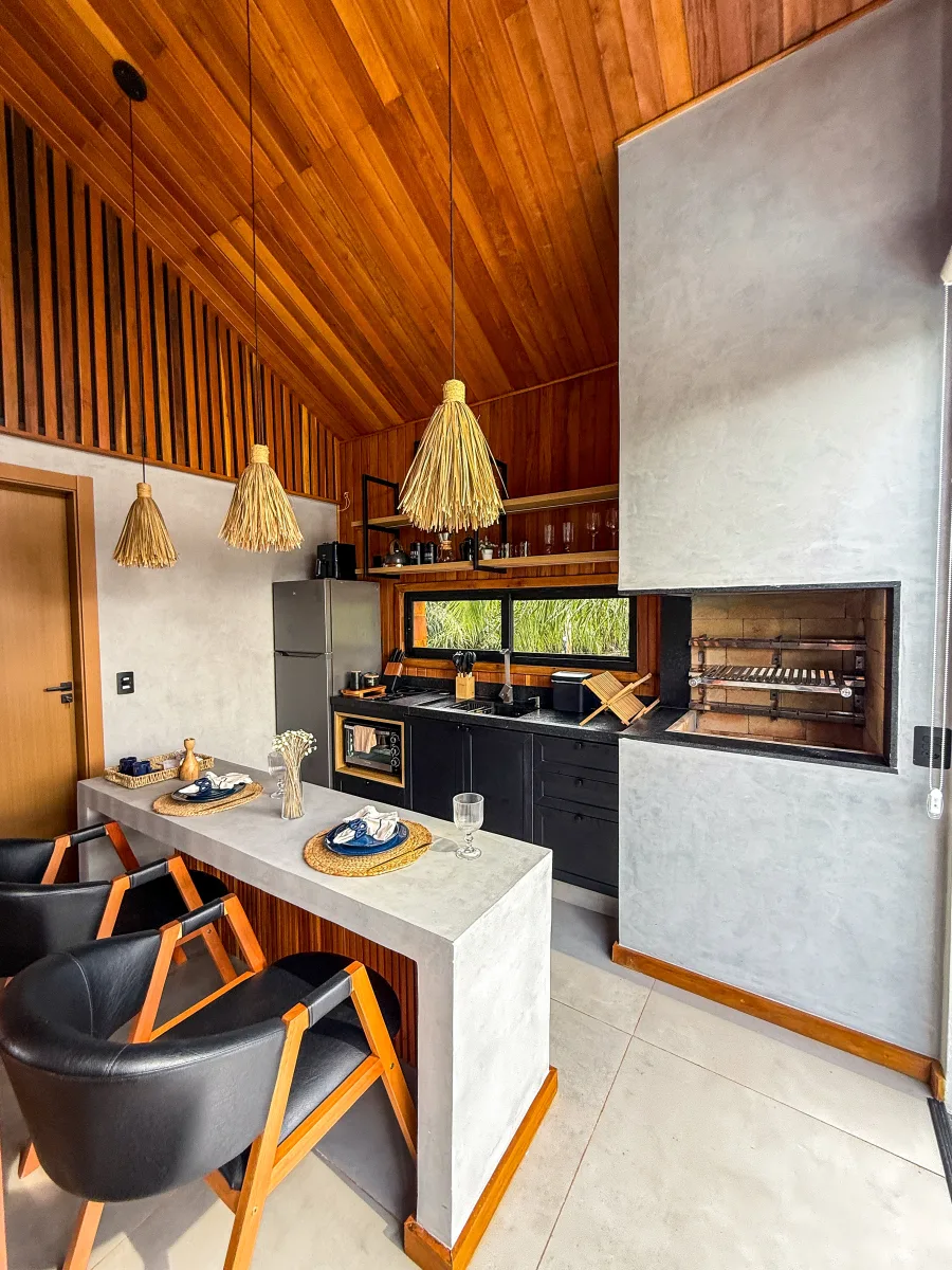 • Cozinha completa (com cooktop, forno, airfryer, geladeira e utensílios)