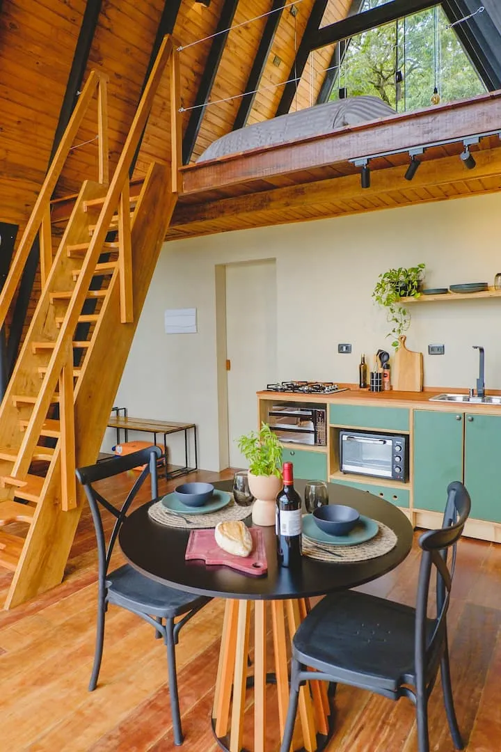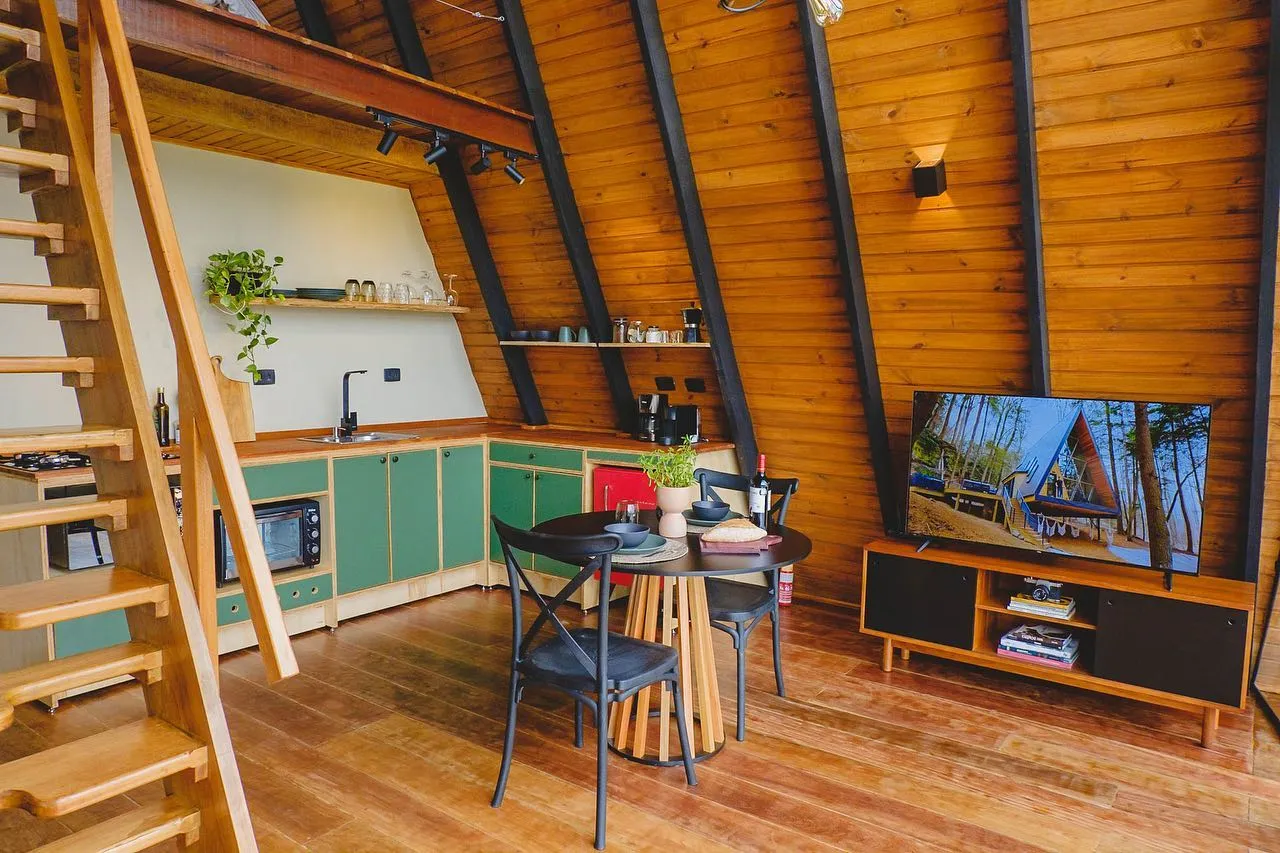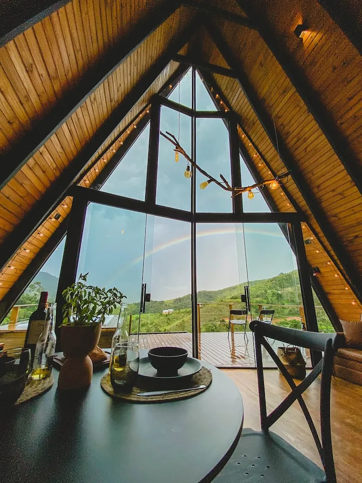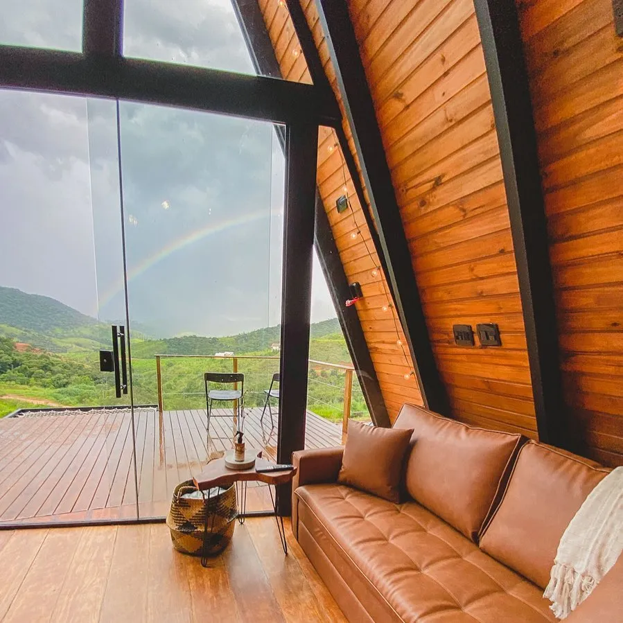 Uma cabana A Frame, no meio da Serra da Mantiqueira. Ela fica no meio do mato mas com todo conforto, um lugar calmo com uma vista incrível para a Pedra da Baú. A localização é excelente, está entre Santo Antônio do Pinhal e São Bento do Sapucaí, a 25km de Campos do Jordão. Ela oferece total privacidade. A cabana possui uma cozinha completa, ducha a gás bem quente. A banheira fica no deck, assim os hóspedes sempre terão a melhor vista o tempo todo. A cabana tem 50 metros quadrados. A sala e cozinha são integradas com toda a frente de vidro, assim sempre tendo vista para a Pedra do Baú. Pode ser aquecida com o calefator/lareira ou com o ar quente do ar condicionado. Situada dentro de um condomínio rural, os hóspedes terão toda privacidade e ao mesmo tempo segurança com outras pousadas e casas ao redor. No mezanino fica o quarto, com uma cama de casal e ar condicionado. Na parte externa os hóspedes podem aproveitar a rede elevada, curtir uma fogueira a noite e durante o tempo todo relaxar na hidromassagem.