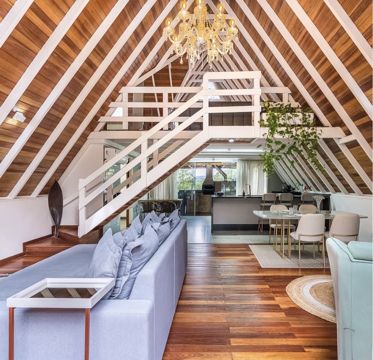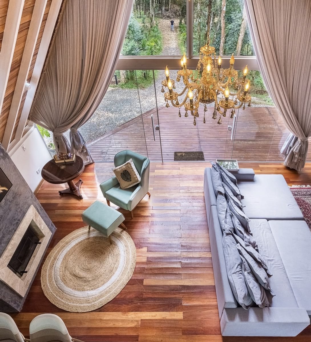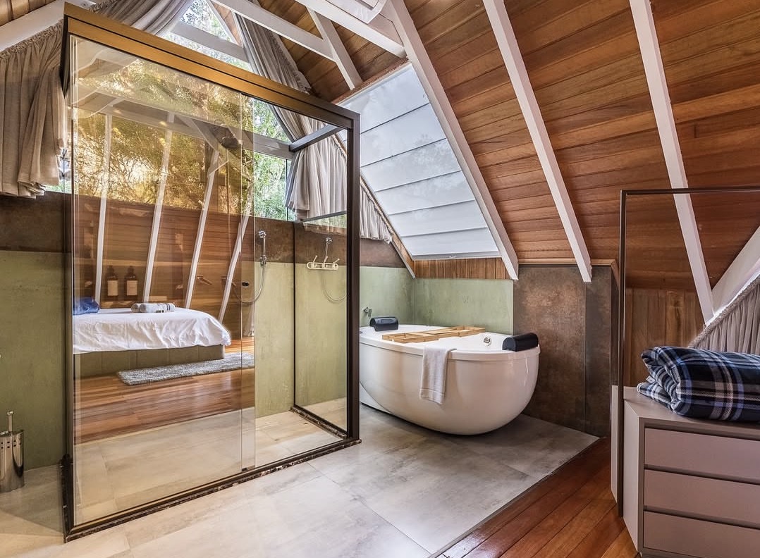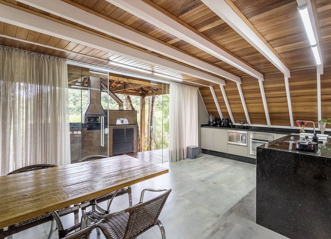O chalé está inserido em um cenário de natureza exuberante, ideal para quem deseja se afastar do ritmo urbano e vivenciar momentos de tranquilidade absoluta. A arquitetura valoriza a integração com o ambiente ao redor, com amplas superfícies envidraçadas que permitem contemplar a paisagem, a luz natural e o céu estrelado, criando uma atmosfera acolhedora e sofisticada.
