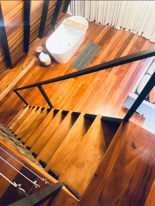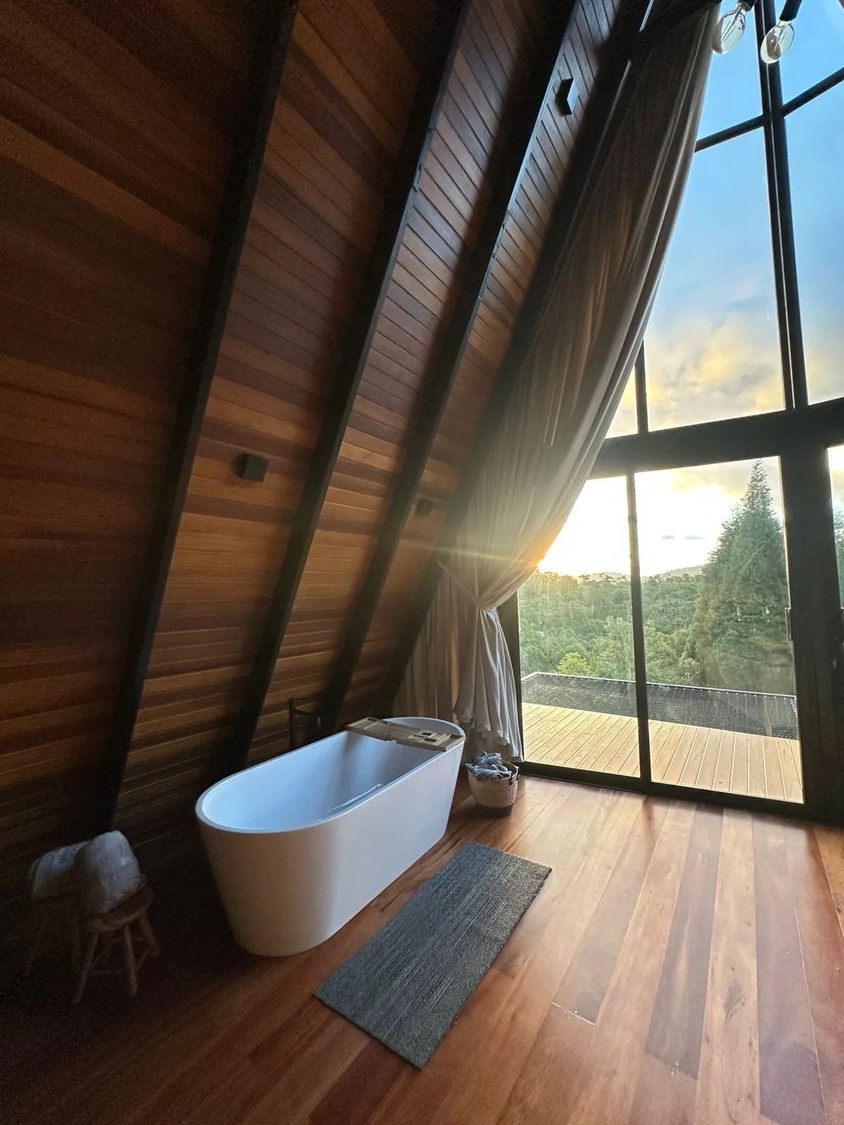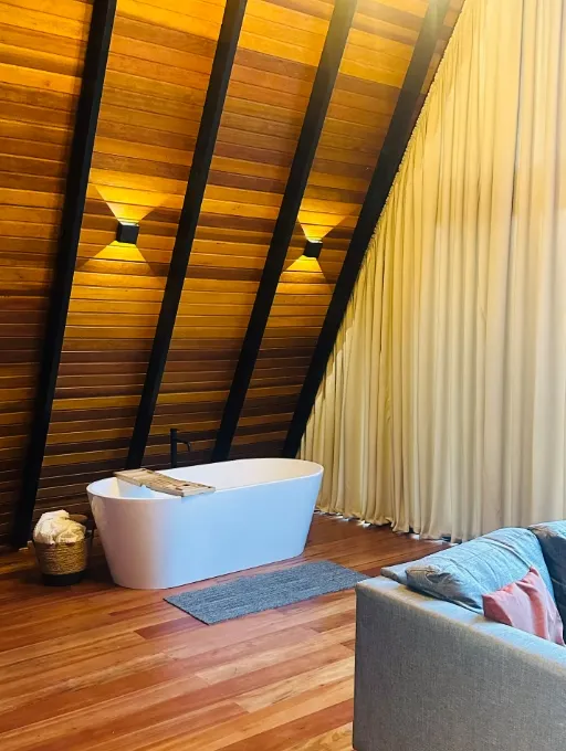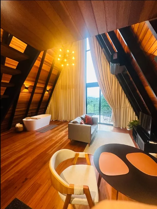 As Cabanas possuem cerca de 80m2 e contam com um quarto (Mezanino, acesso por escadas), com Cama Queen, Cozinha Completa (Forno, Microondas, Cooktop de duas bocas, Pia e Frigobar), além de uma Banheira de imersão incrível , sala completa com TV, mesa de jantar e wifi de alta velocidade, ar condicionado quente e frio na sala e no quarto.
