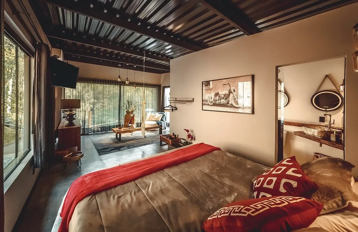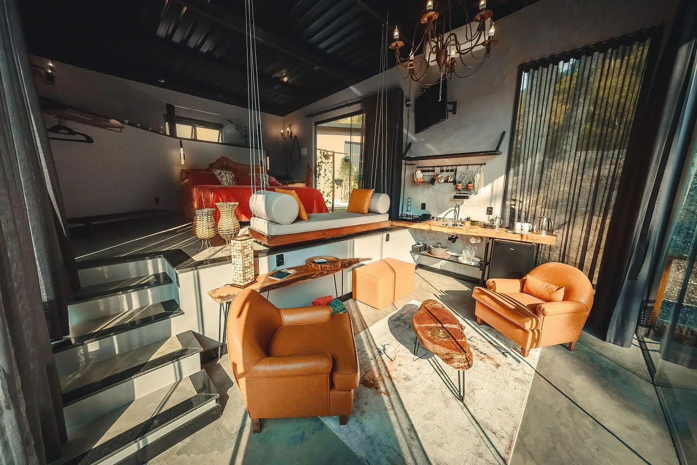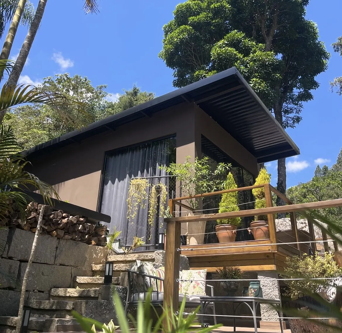 Uma cabana de estilo industrial que combina romance e aconchego no meio de um cenário exuberante. Situada em um condomínio fechado com segurança 24 horas, a cabana oferece um espaço íntimo e organizado para o total bem-estar dos hóspedes.