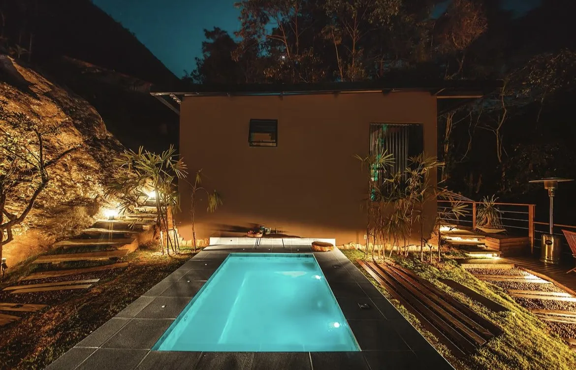 A hidro aquecida e iluminada, compartilhada entre as duas cabanas disponíveis, é perfeita para relaxar e apreciar a natureza ao redor. E para aqueles que desejam se refrescar, a mini cachoeira, com água da nascente, oferece um banho gelado revigorante e uma experiência única.