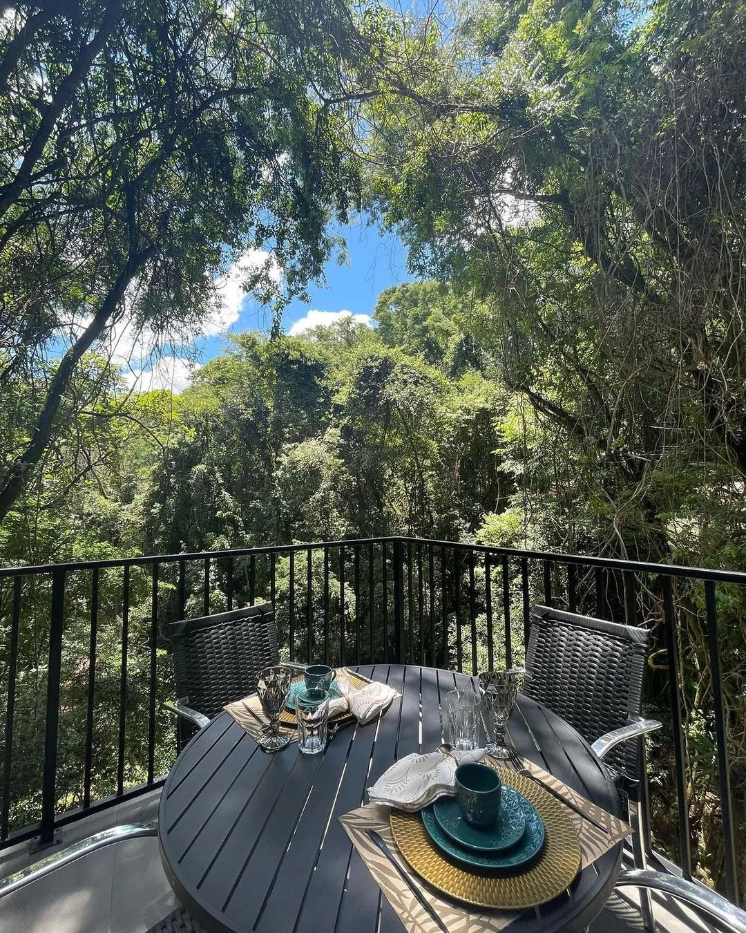 A cabana possui cozinha completa, hidromassagem com vista da mata, ar-condicionado, cama king size, sofá-cama e lareira interna.