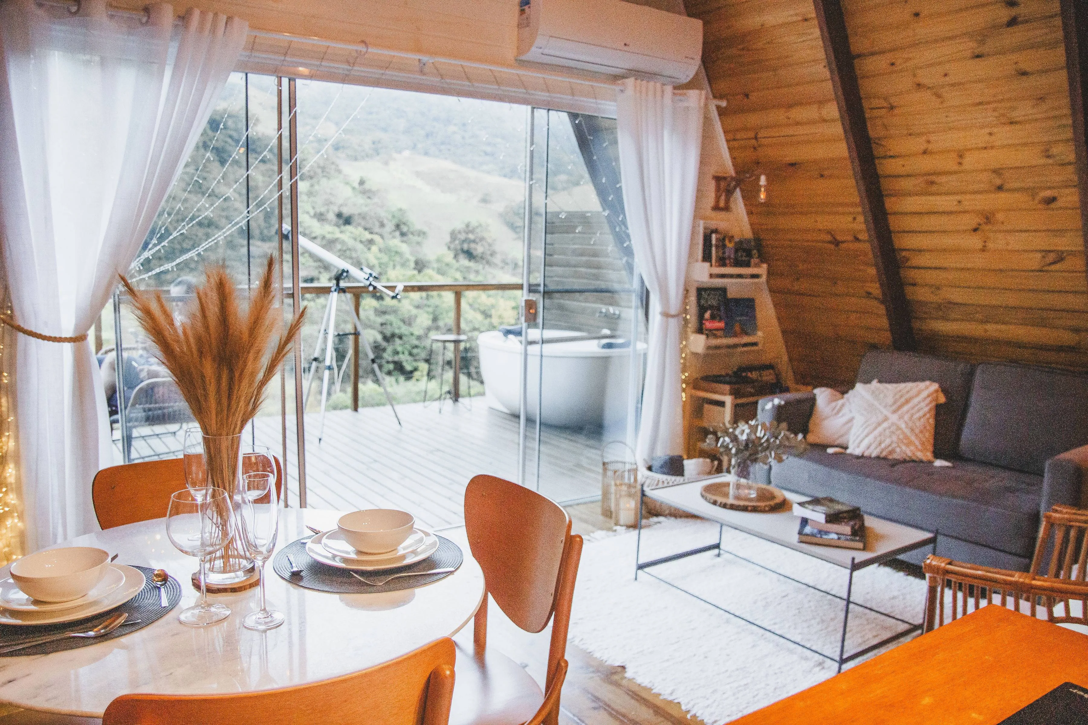O estilo arquitetônico em A-Frame, ainda muito raro no Brasil, fica evidente no projeto inspirado nas origens Nórdicas e Escandinavas. Em madeira, decorada em boho chic e com comodidades de um luxuoso glamping, busca oferecer uma experiência de hospedagem que pretende surpreender em cada detalhe.