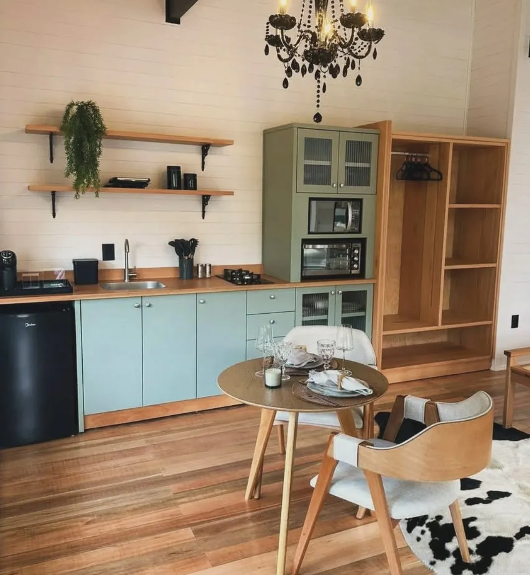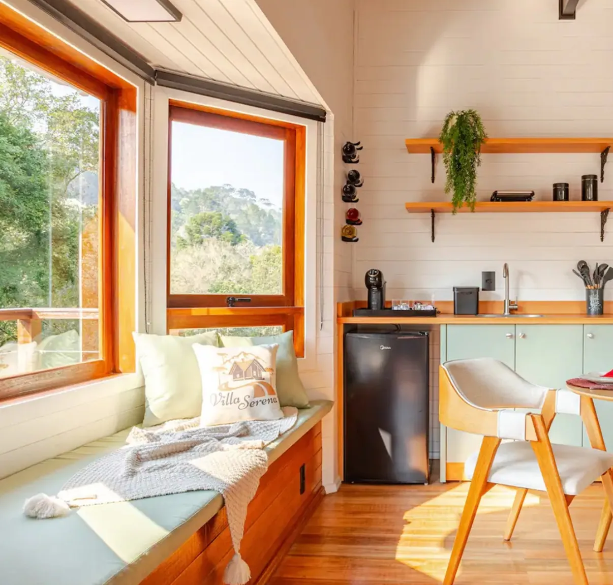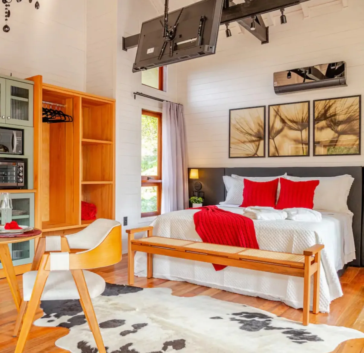A Villa Serena oferece uma experiência de hospedagem pensada para casais que buscam conforto, privacidade e contato direto com a natureza. O espaço conta com uma suíte acolhedora equipada com cama box king, lareira, banheira de hidromassagem e um ambiente cuidadosamente decorado para criar momentos únicos. A cozinha completa proporciona praticidade, com micro-ondas, sanduicheira, chaleira elétrica, fogão, frigobar e utensílios, além de uma charmosa cafeteira com cápsulas de cortesia.