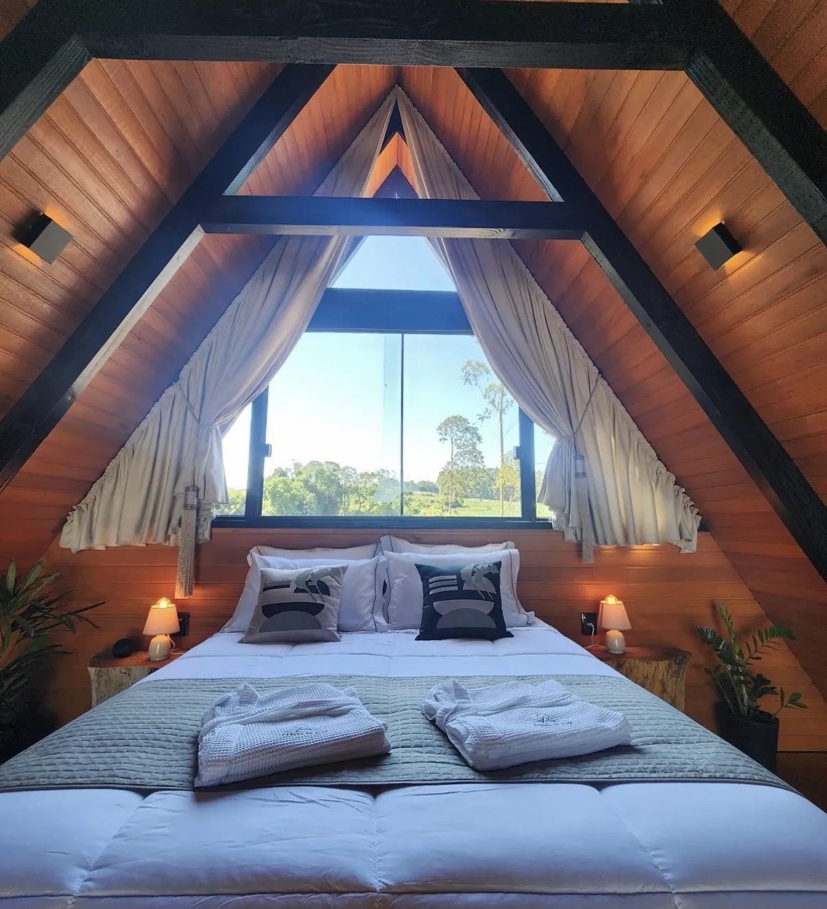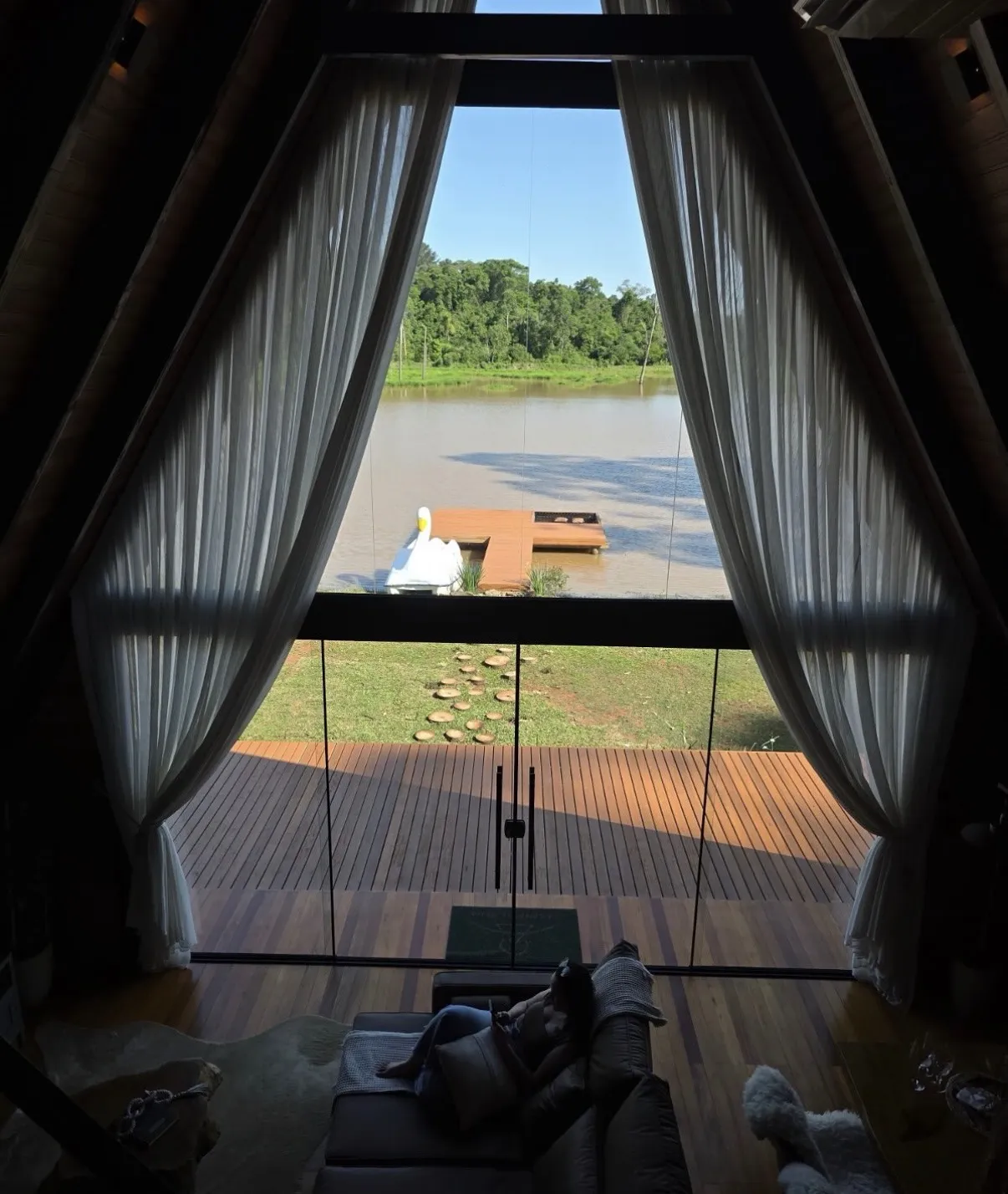 Cabana A-frame em ilha privativa, no centro de um lago de 7 hectares, ideal para quem busca tranquilidade, exclusividade e contato com a natureza. Vista para a água, deck para relaxar e privacidade total.