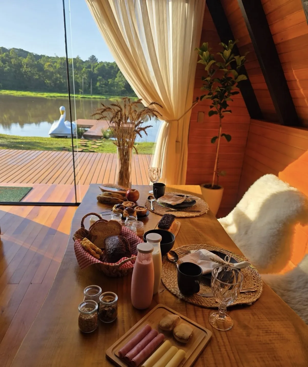 Conta com cozinha equipada, climatização, cama e sofá confortáveis, frigobar, adega, área gourmet externa com parrilla e cesta de boas-vindas com itens especiais para lanche da tarde e café da manhã. A experiência inclui kit de pesca esportiva, passeio de pedalinho e quadriciclo para explorar a propriedade.