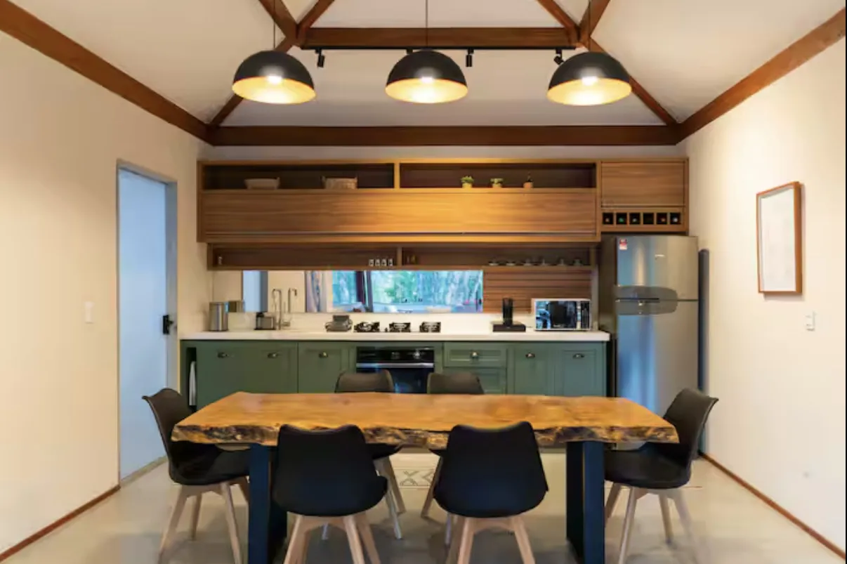 A Cabana da Serra é uma casa linear de alto padrão, construída no estilo rústico de cabana, ideal para quem busca conforto e contato com a natureza. Acomoda até 6 pessoas com tranquilidade e é composta por 3 quartos: uma suíte com cama de casal, um quarto com cama de casal e outro com duas camas de solteiro.