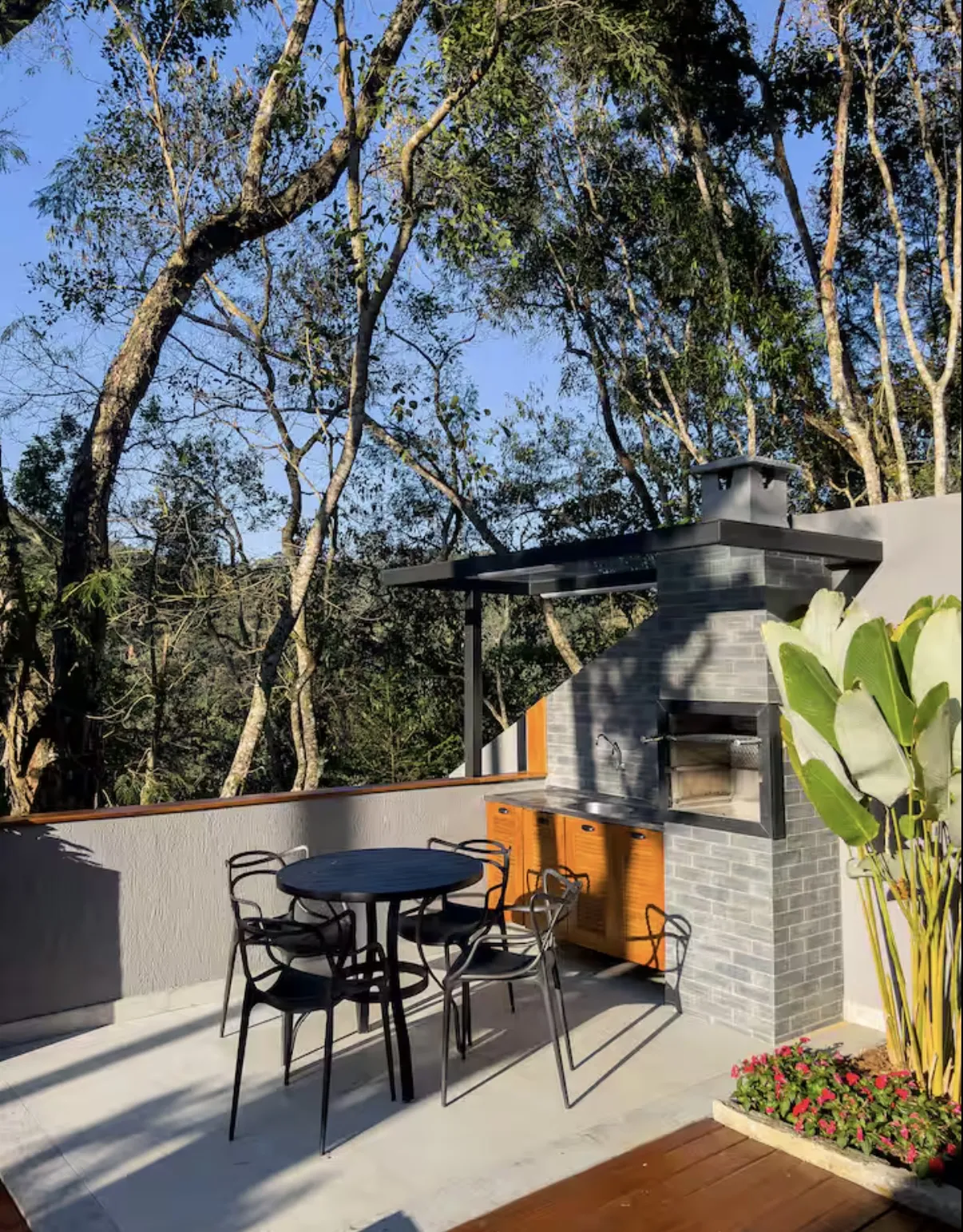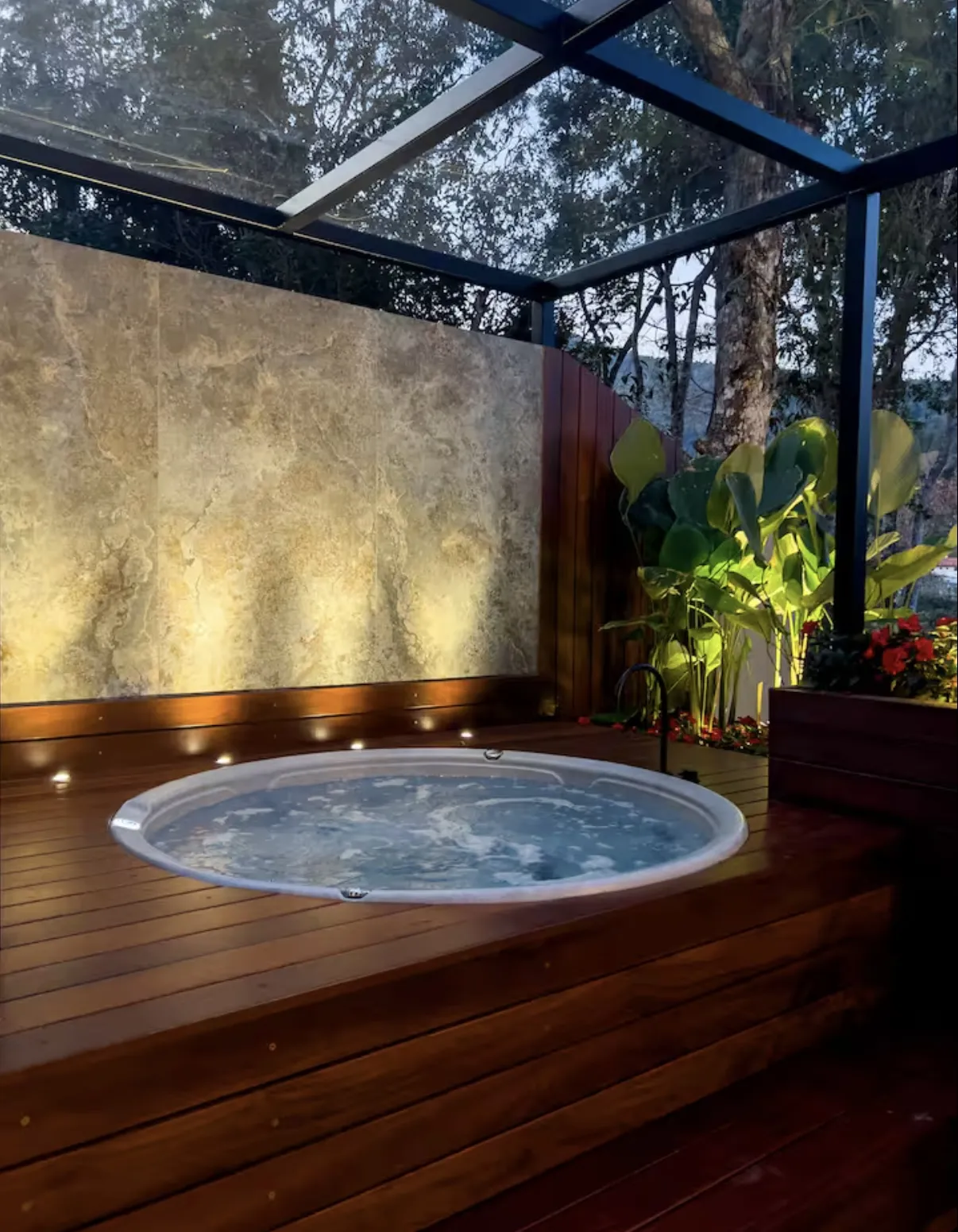 Um dos grandes diferenciais da casa é o cinema ao ar livre, localizado na área externa privativa, que também conta com um belo jardim, rede para contemplar o céu estrelado, hidromassagem e churrasqueira — o espaço perfeito para relaxar e curtir momentos especiais.