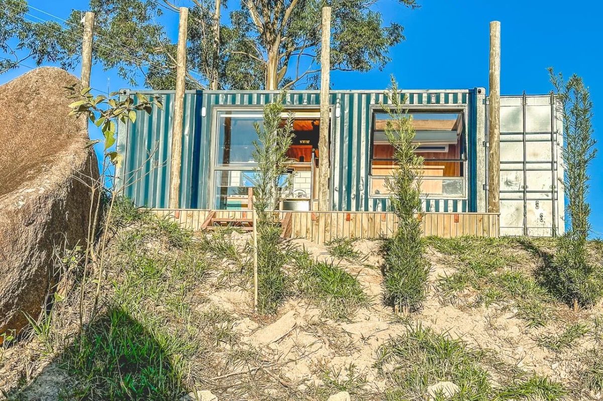 A vista da cabana é para uma floresta e rodeada de montanhas em um local muito seguro.