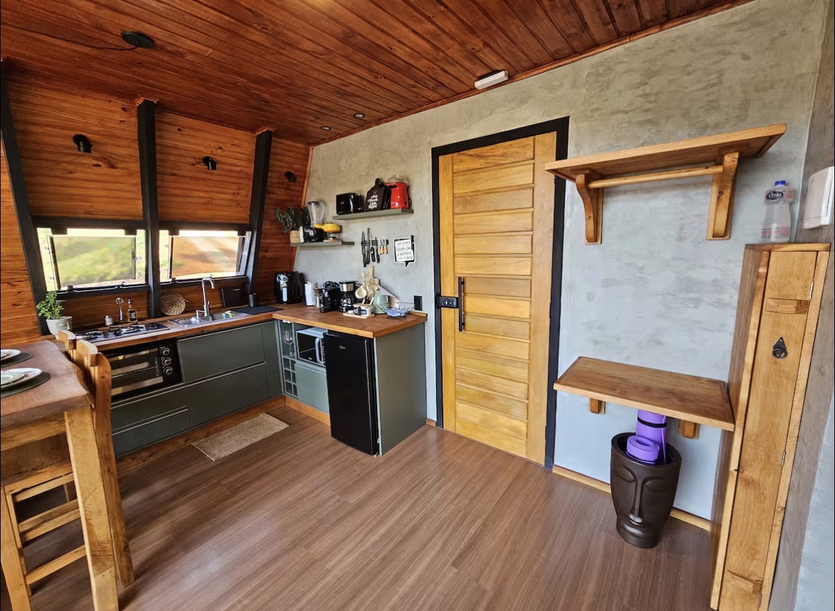 O interior apresenta um clima acolhedor e estrutura pensada para o conforto. O dormitório está localizado em um mezanino, acessado por escada em estilo marinheiro, garantindo amplitude ao espaço. Cada detalhe foi planejado para que o hóspede vivencie serenidade e possa se desconectar com qualidade durante toda a estadia.