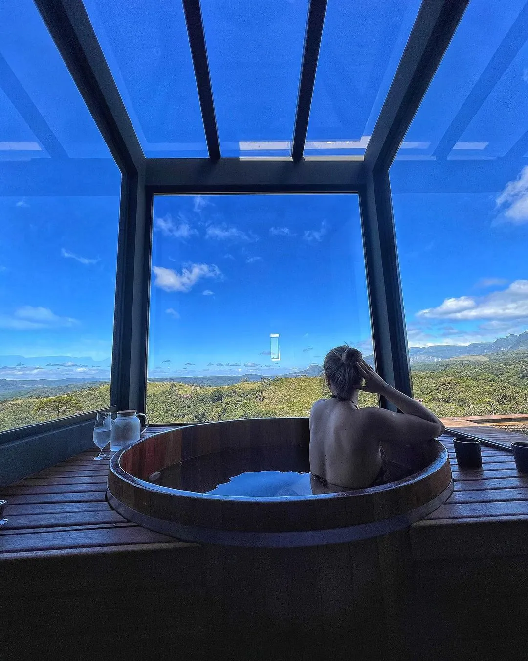 Uma cabana exclusiva e completamente privativa, isolada no topo das montanhas e aos pés da Serra, a 1037 metros de altitude, oferecendo uma vista deslumbrante. A união perfeita entre o rústico e o moderno, onde cada detalhe foi pensado para uma experiência única.