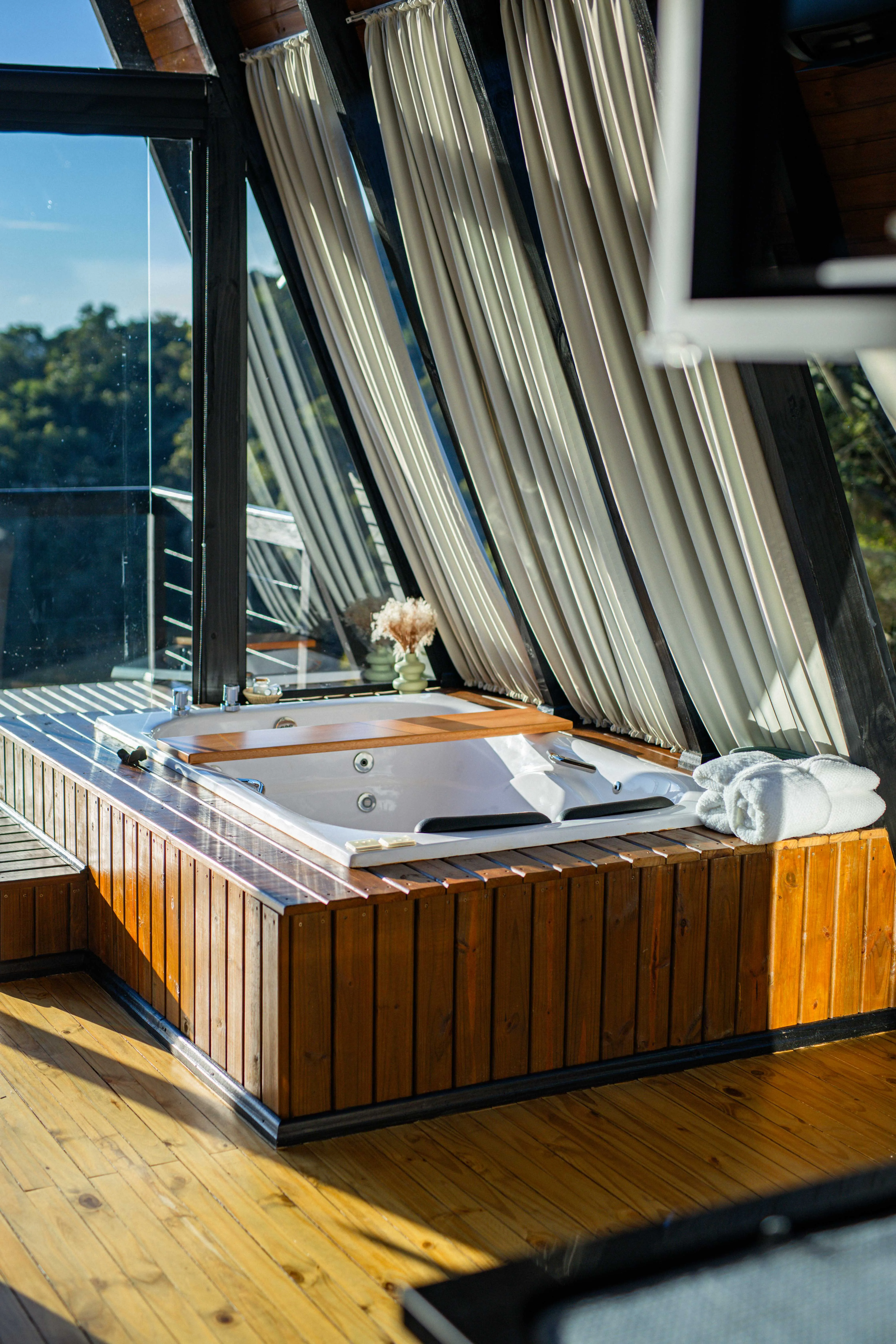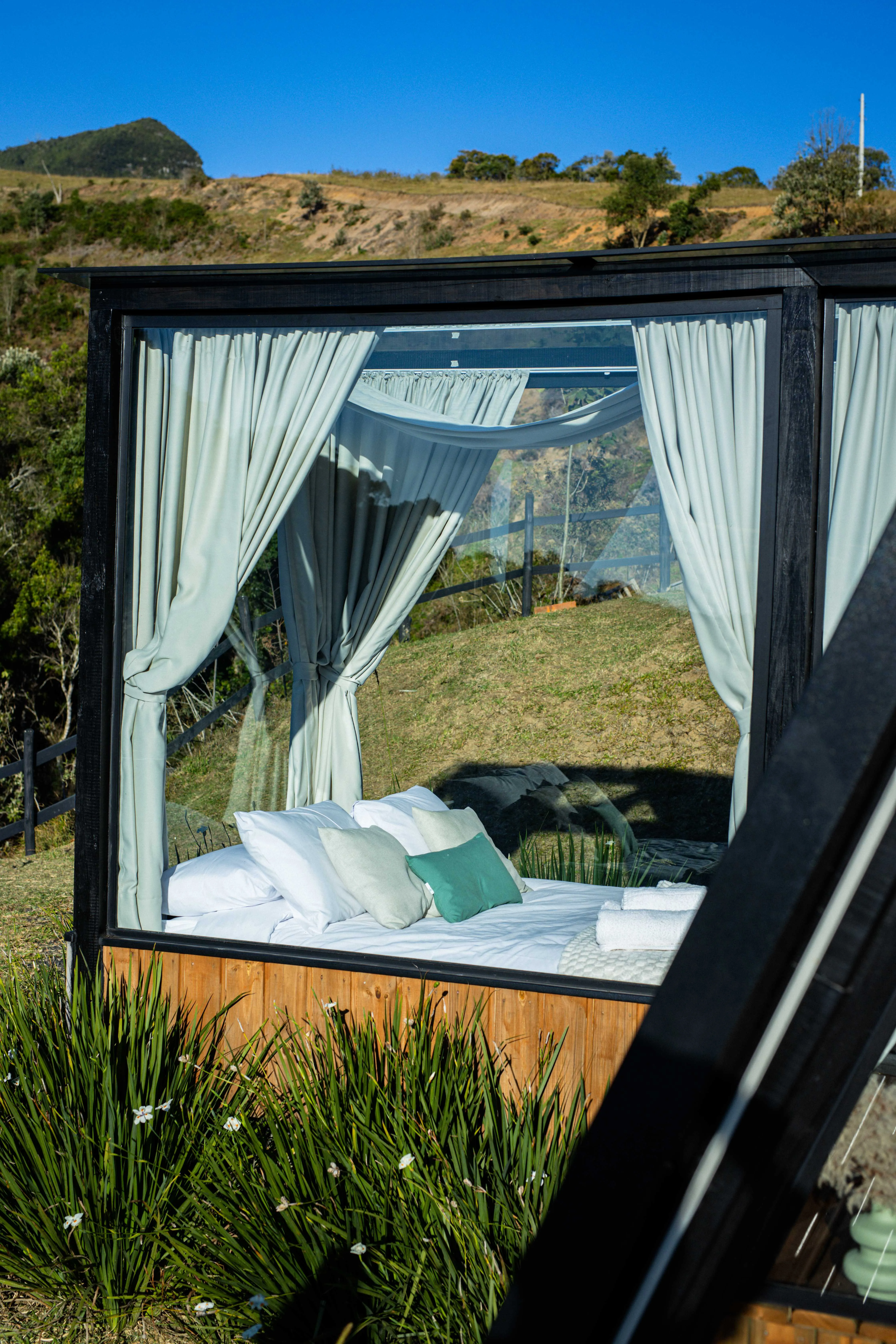 • Quarto de vidro: durma sob as estrelas e acorde cercado pela natureza. O ambiente é equipado com cortinas blackout, garantindo privacidade e conforto.