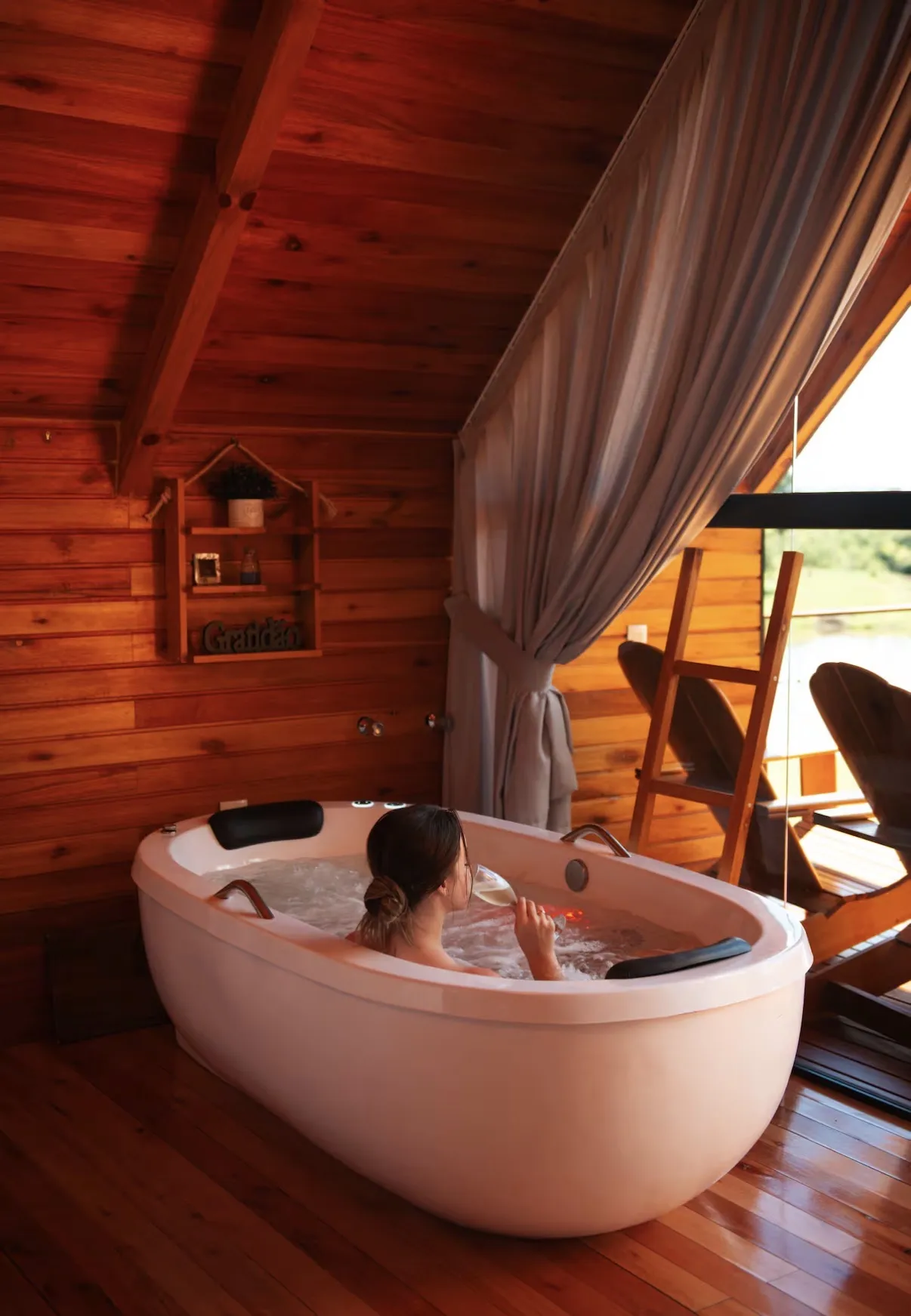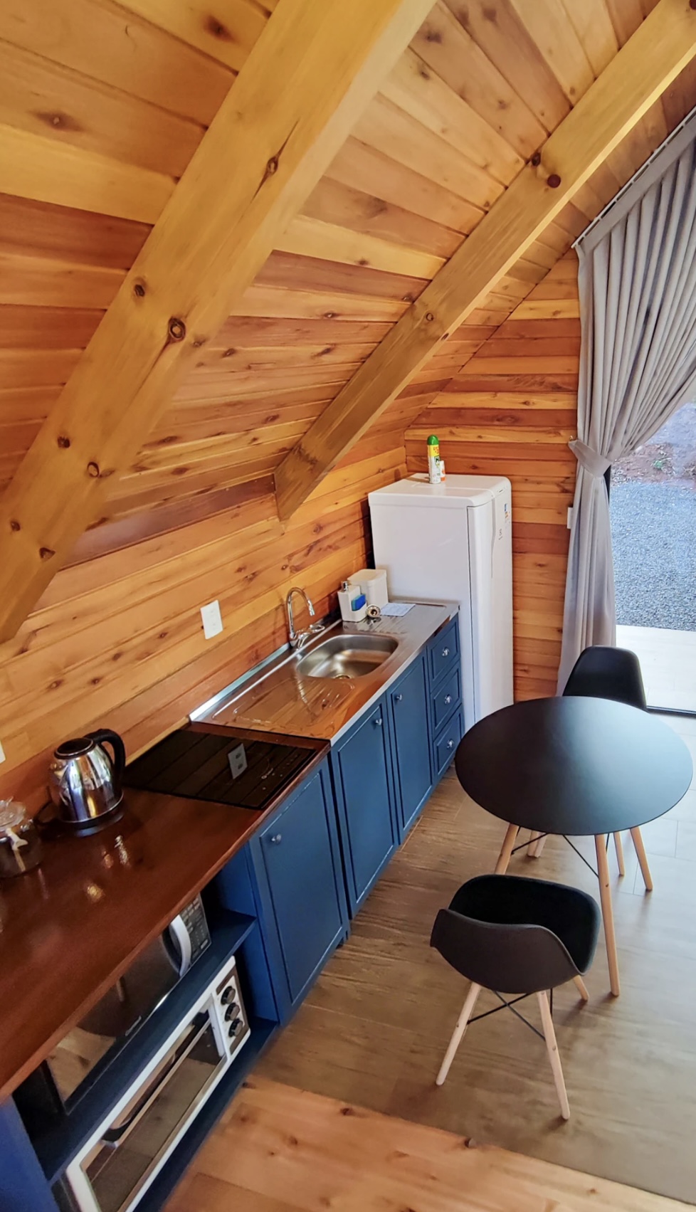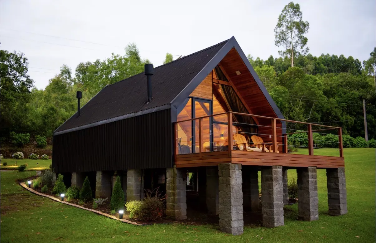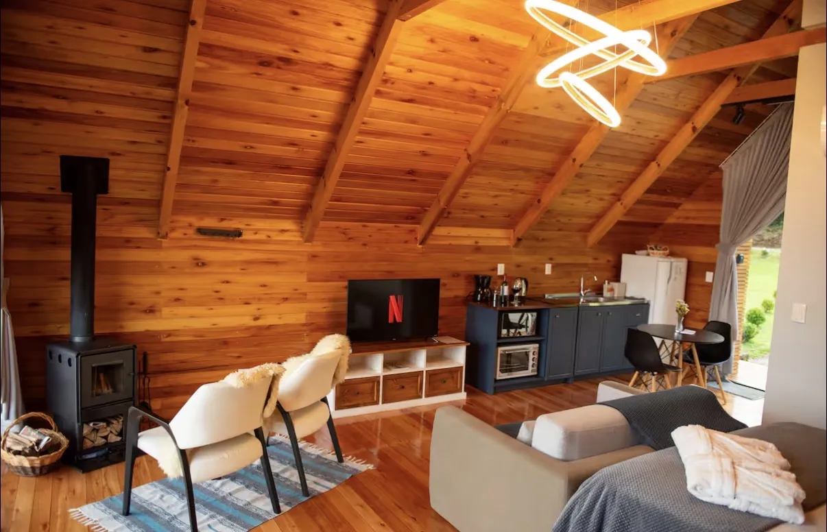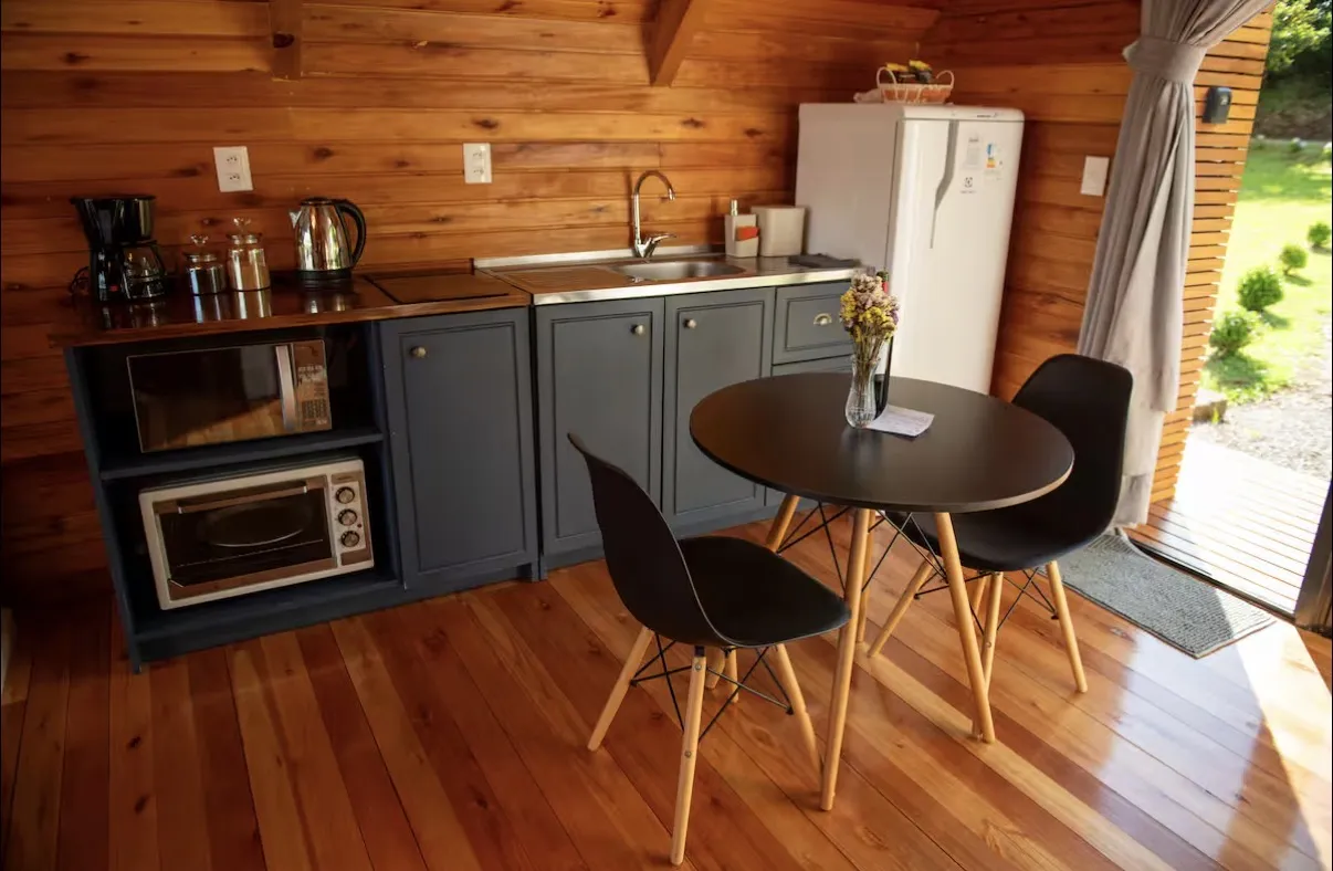 A cabana oferece o equilíbrio perfeito entre o charme rústico e o conforto do moderno, criando um refúgio acolhedor em meio à natureza da Serra Gaúcha. O espaço conta com cozinha completa, equipada com fogão por indução, micro-ondas, forno elétrico, geladeira, cafeteira, chaleira elétrica, torradeira e utensílios diversos, além de taças para vinho, espumante e cerveja. A sala ampla e aconchegante possui smart TV, calefator chileno e um ambiente que convida a momentos românticos e de descanso.