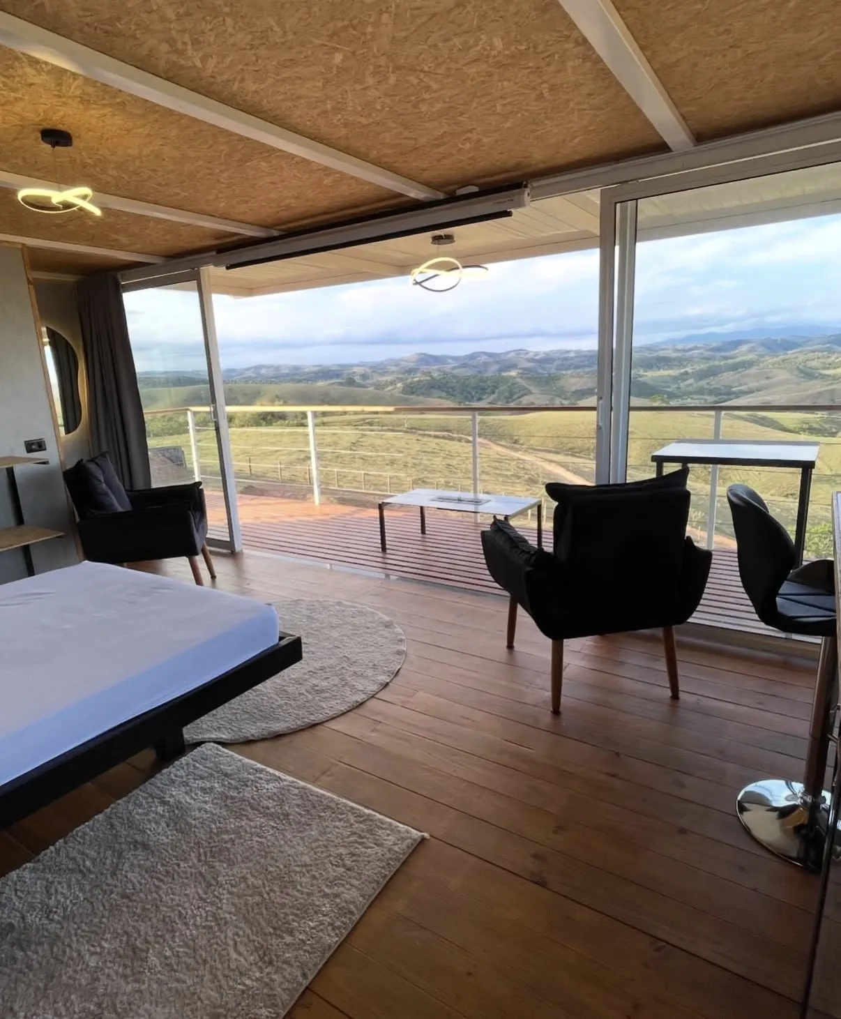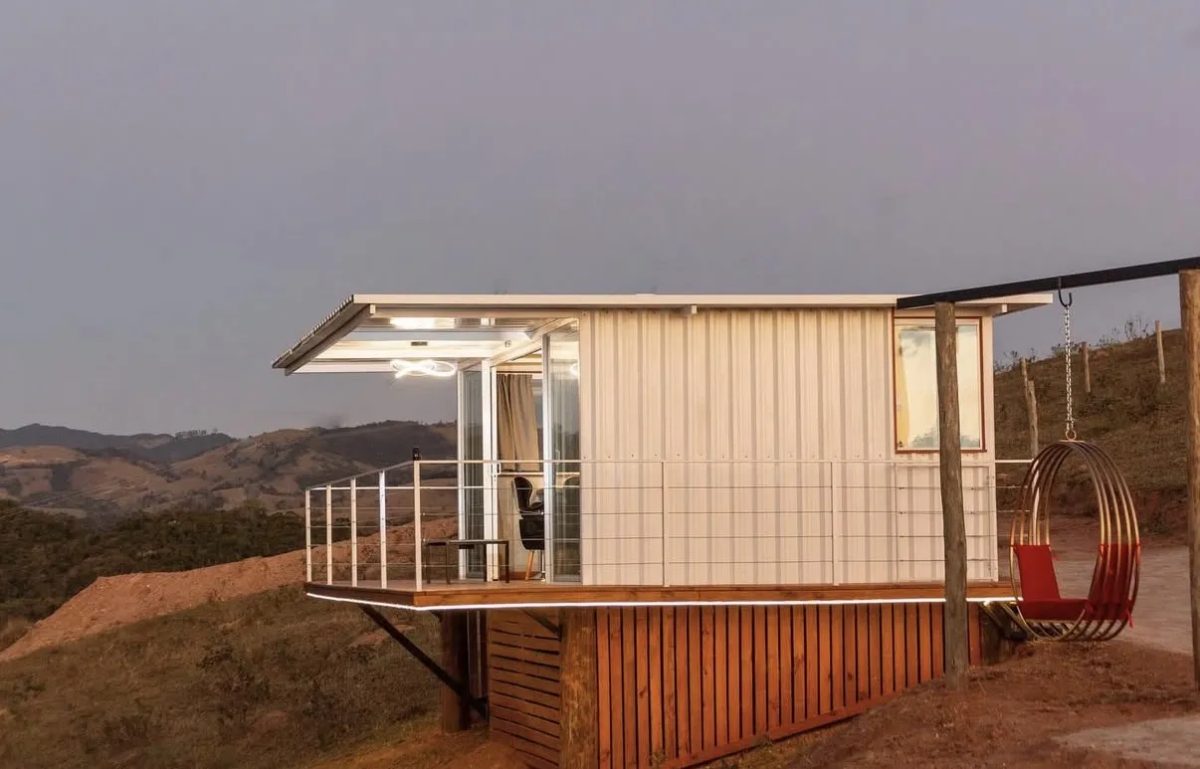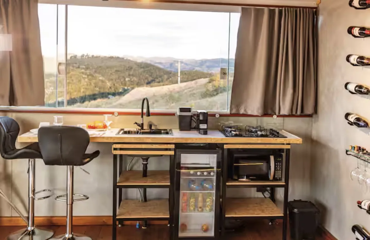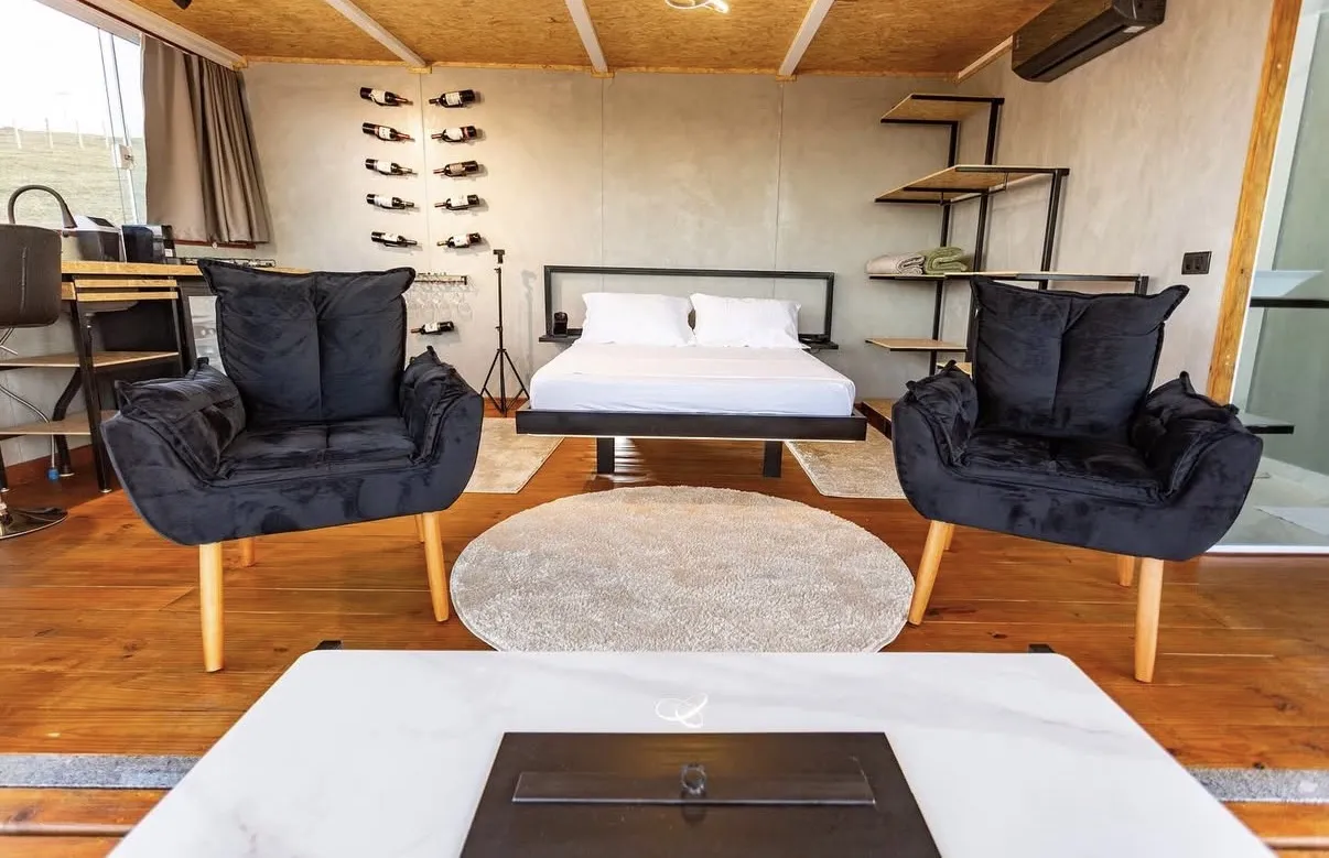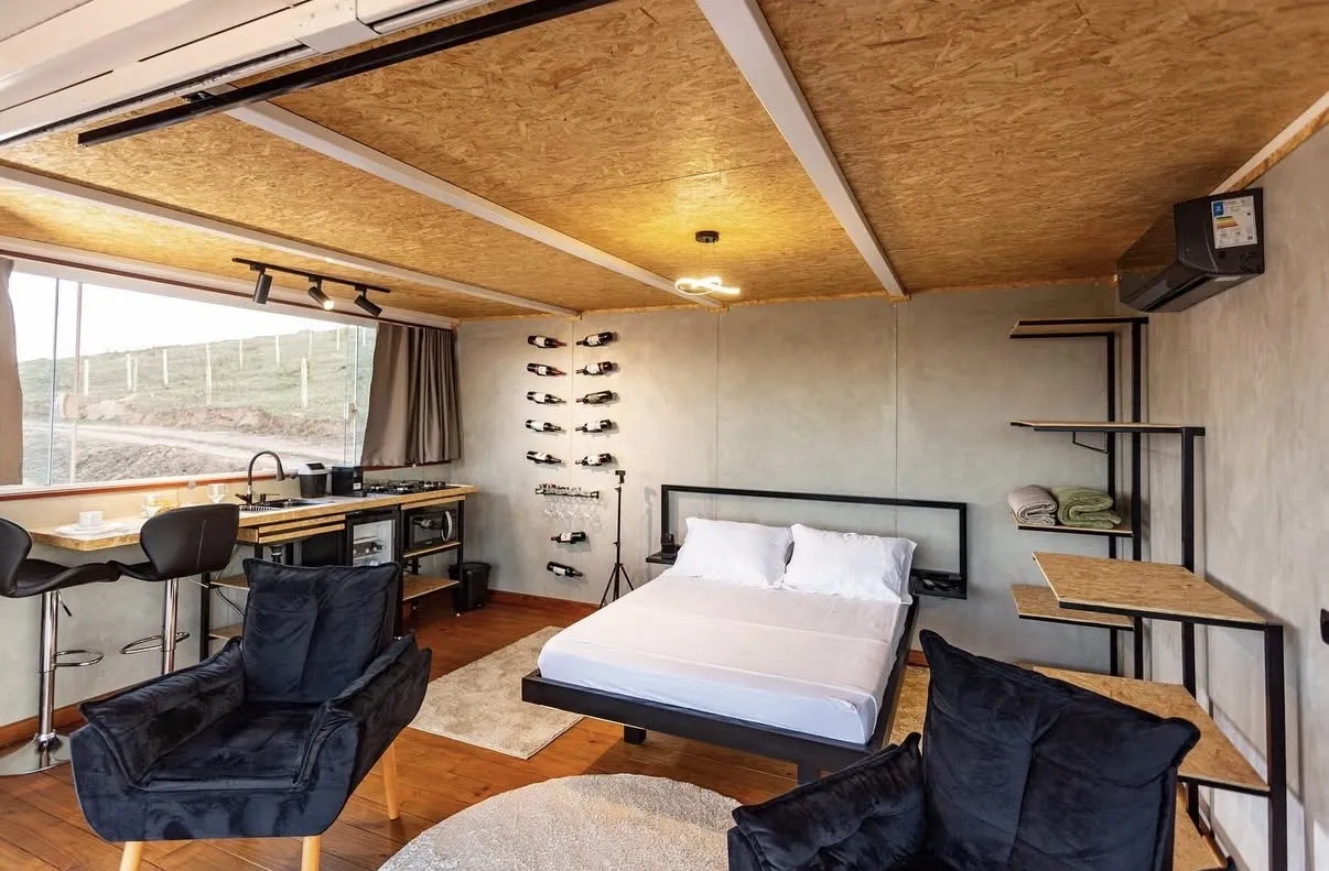 Uma cabana modular charmosa e aconchegante, cercada pelas montanhas e com vista panorâmica para um pôr do sol inesquecível. O ambiente foi pensado para proporcionar uma estadia tranquila e inspiradora, onde o conforto moderno se encontra com a natureza e a história local. O quintal abriga antigos trechos das trincheiras de 1932, construídas em pedra, criando um cenário singular e cheio de significado.