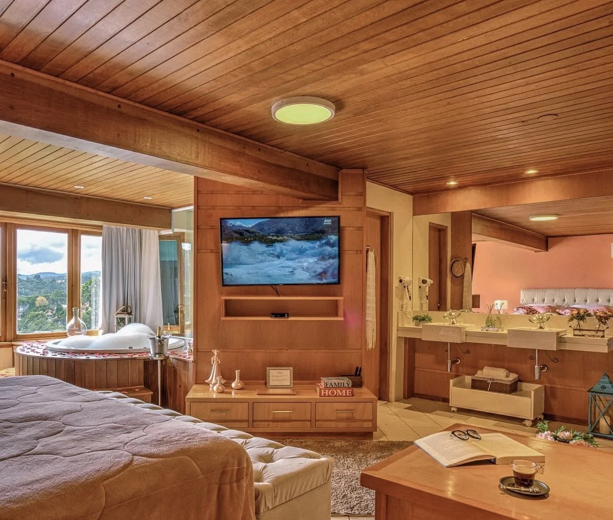 Ar condicionado Secador de cabelo TV a cabo / Smart TV Jacuzzi / Ofurô / Banheira Coberta Frigobar Lareira Máquina de Café Enxoval de Luxo (+ Roupão e Pantufa) Sauna Cozinha Estação de trabalho (mesa e cadeira) Piscina Aquecida ou climatizada Borda Infinita Coberta