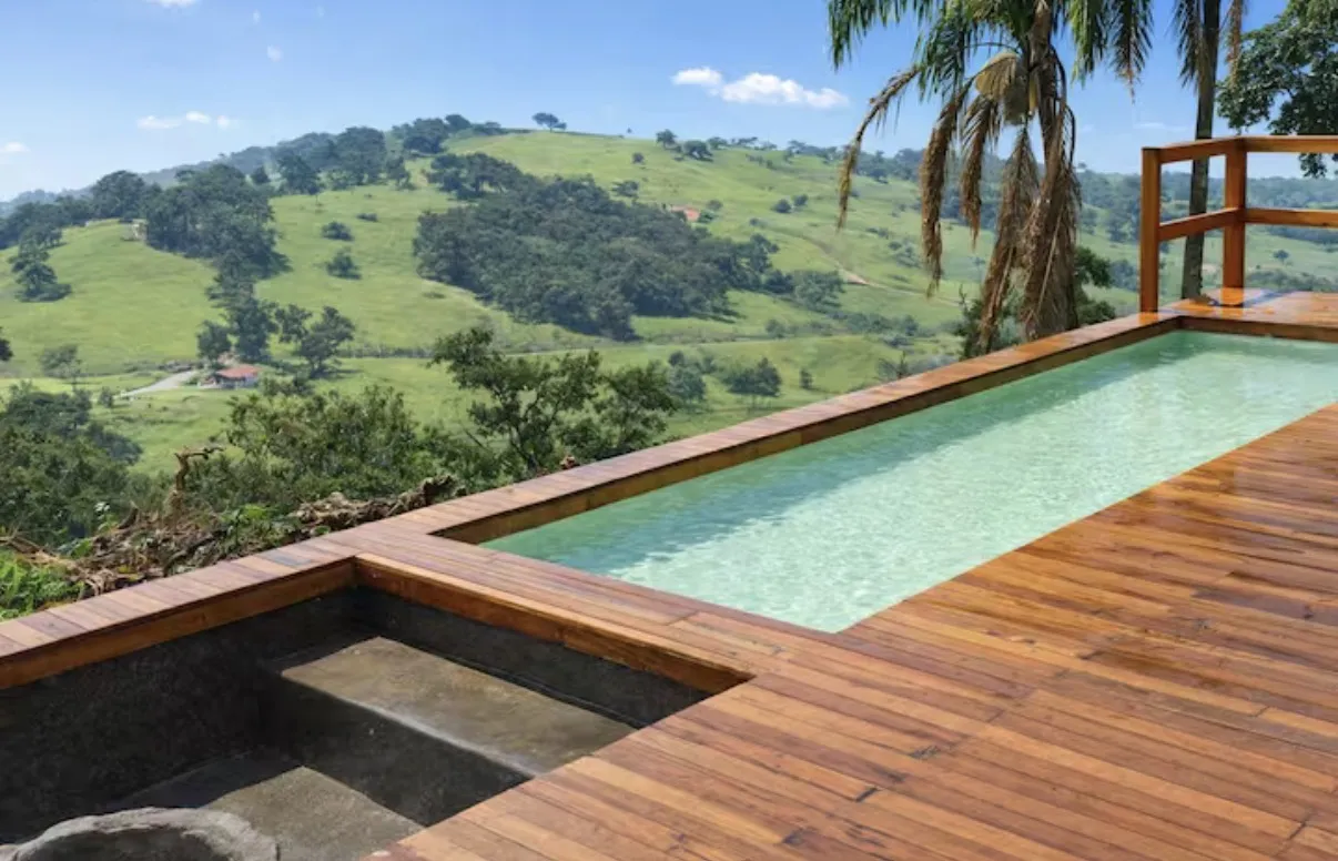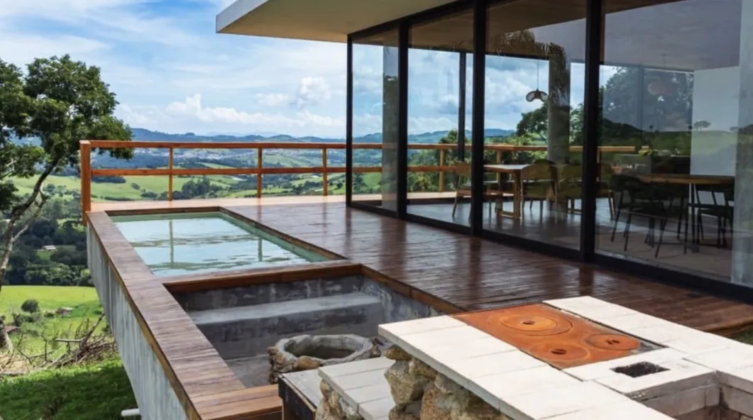 A área externa é o grande destaque, com piscina aquecida, churrasqueira e fogão a lenha, perfeitos para momentos compartilhados em meio ao campo. Os ambientes internos são amplos e confortáveis, acomodando até dez hóspedes com privacidade e bem-estar. Trata-se de uma experiência exclusiva para quem deseja viver o campo com charme, tranquilidade e conexão verdadeira com a natureza.