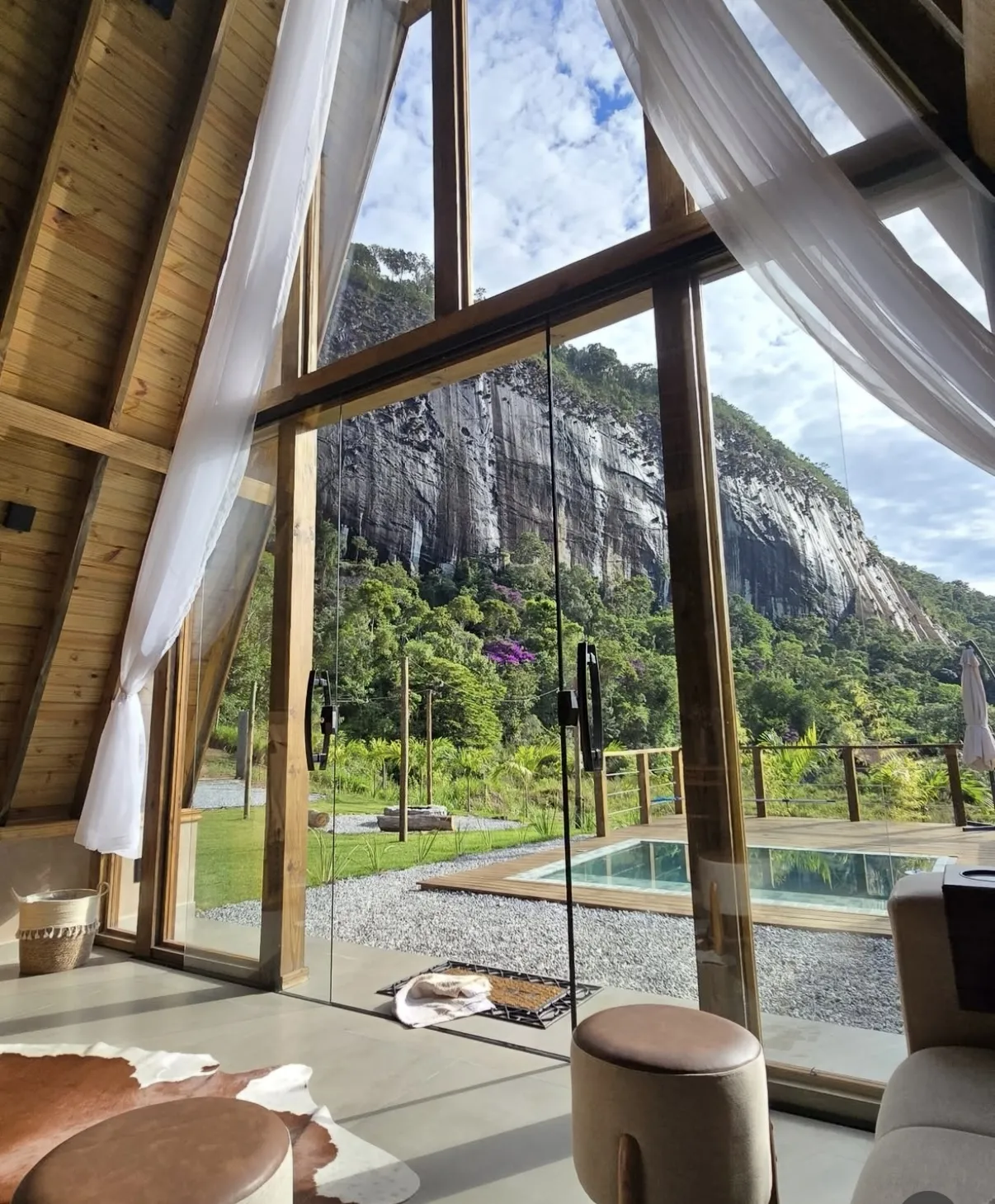 Com arquitetura A-frame e rodeado pelas montanhas, este chalé exclusivo proporciona uma experiência acolhedora e tranquila em meio à natureza. Ideal para casais, o espaço foi projetado para oferecer conforto em cada detalhe, com lareira, cama aconchegante e vista deslumbrante que convida à contemplação. A atmosfera serena e o design sofisticado tornam a estadia envolvente e memorável.