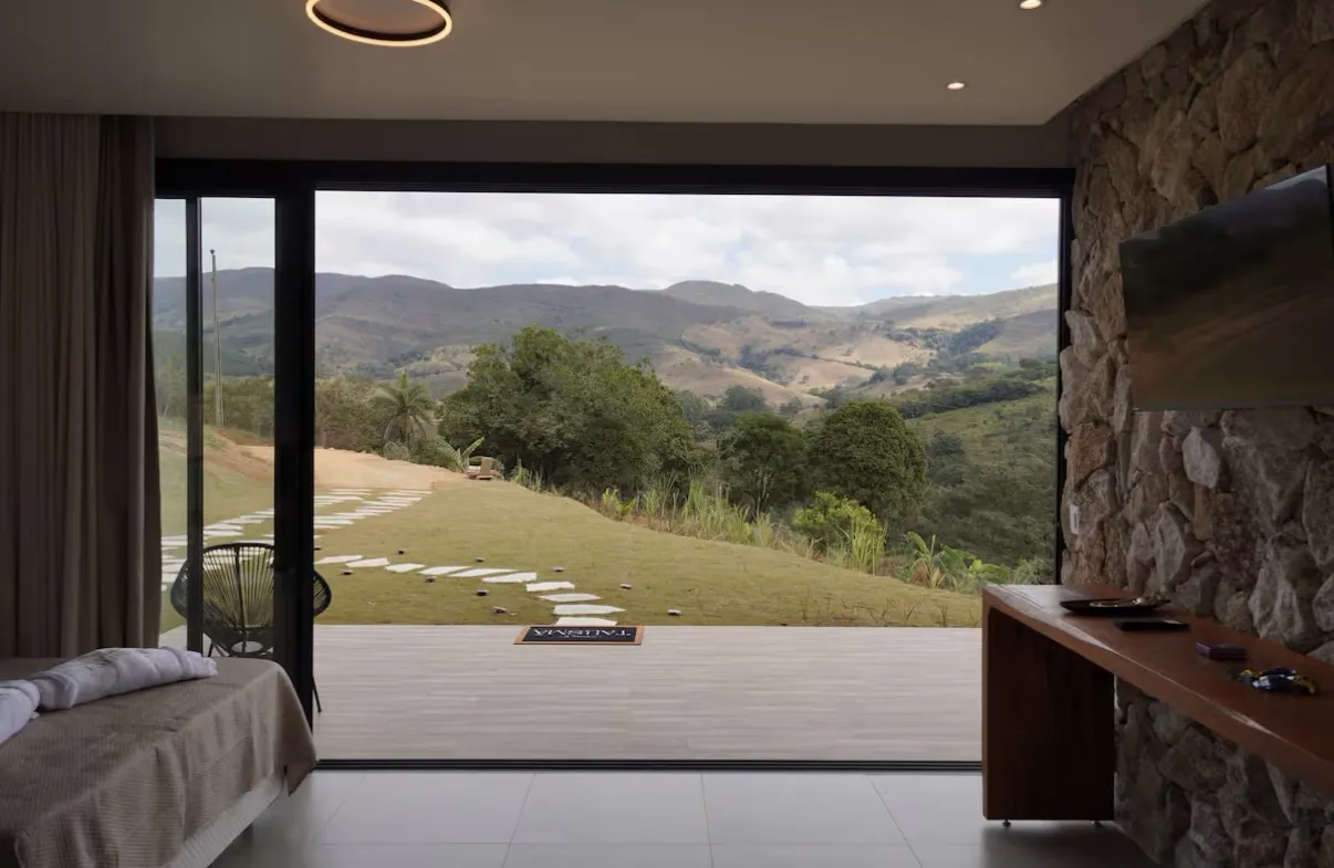 O Chalé Talismã proporciona uma experiência de aconchego e bem-estar em meio à natureza, com destaque para a vista deslumbrante que emoldura o cenário como um quadro. O ambiente integrado reúne cama de casal, cozinha equipada, smart TV, hidromassagem, área de churrasco e espaço com fogueira, criando o equilíbrio perfeito entre conforto e charme rústico.