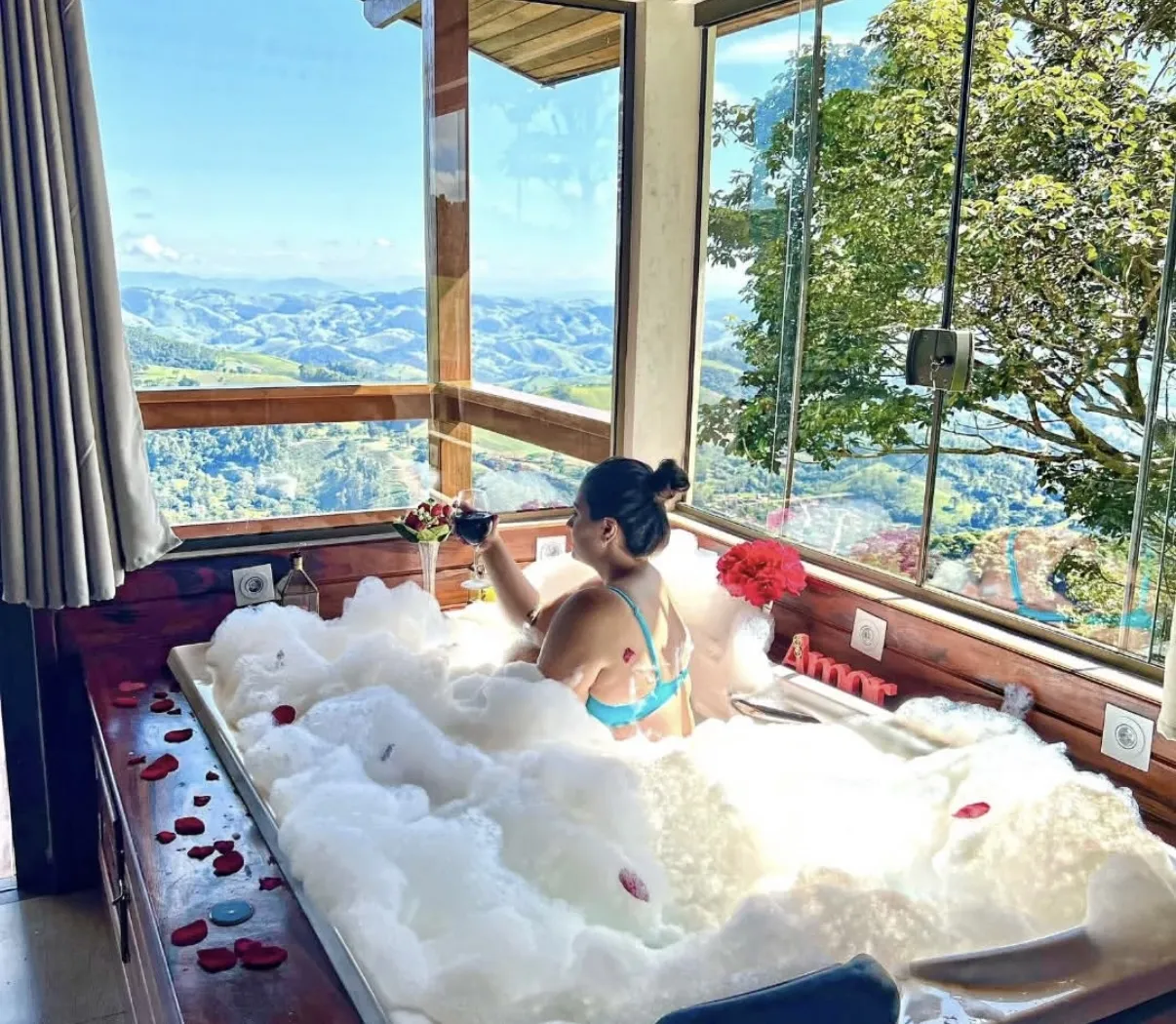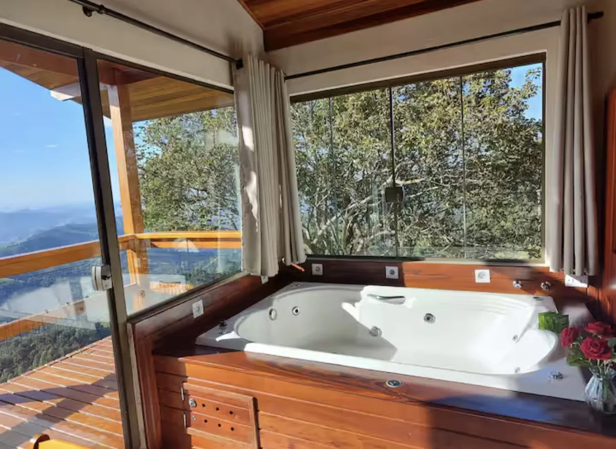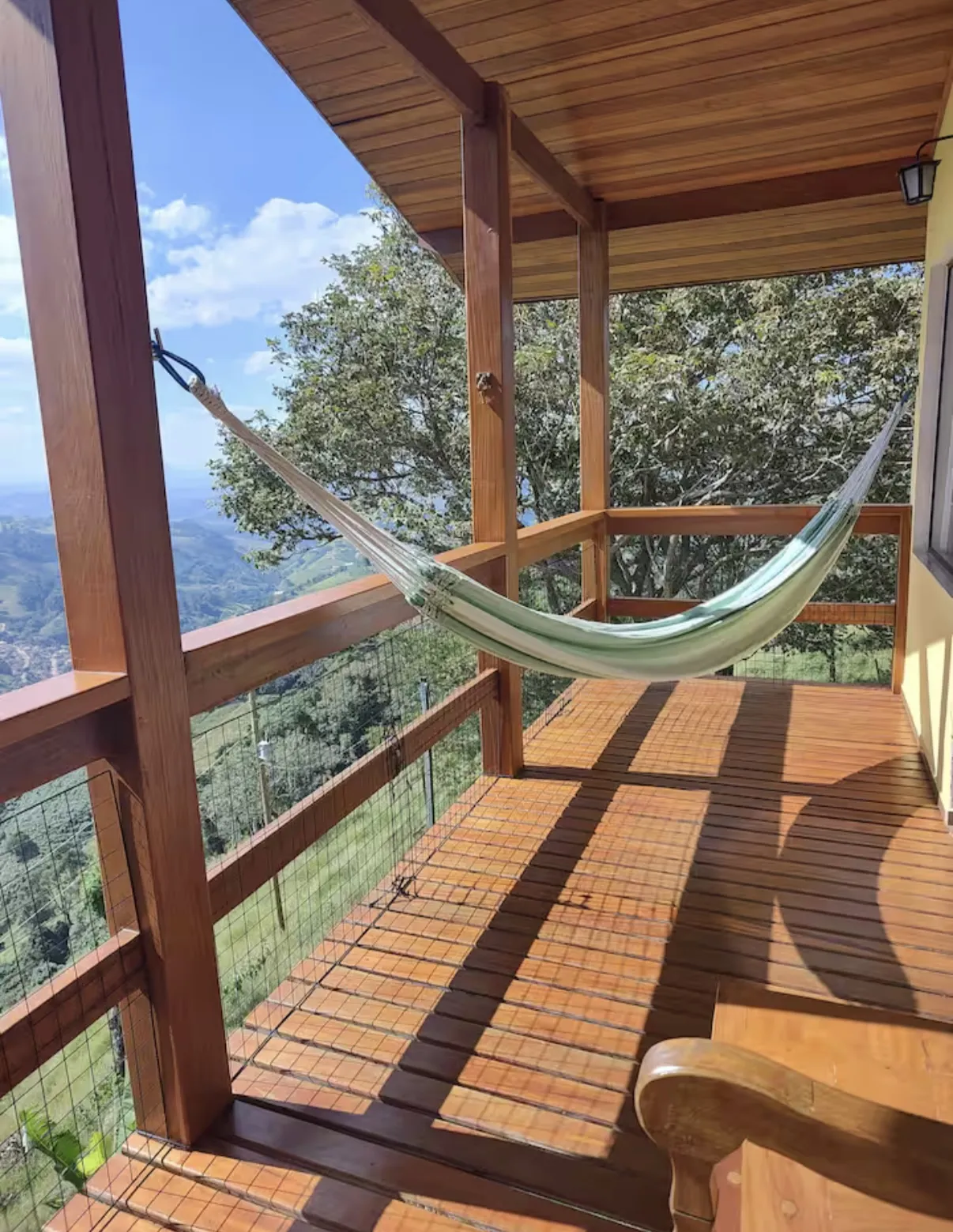 Trata-se de um chalé completo, com cozinha equipada, quarto com cama Queen, uma smartv, lareira, uma banheira de hidromassagem com água quentinha e o mais interessante: uma vista incrível, de tirar o fôlego! Todos que já passaram pelo chalé se encantaram com a beleza da natureza à sua volta. O local é visitado sempre por várias espécies de aves como seriema, tucanos, canário da terra, pica pau, entre outros.