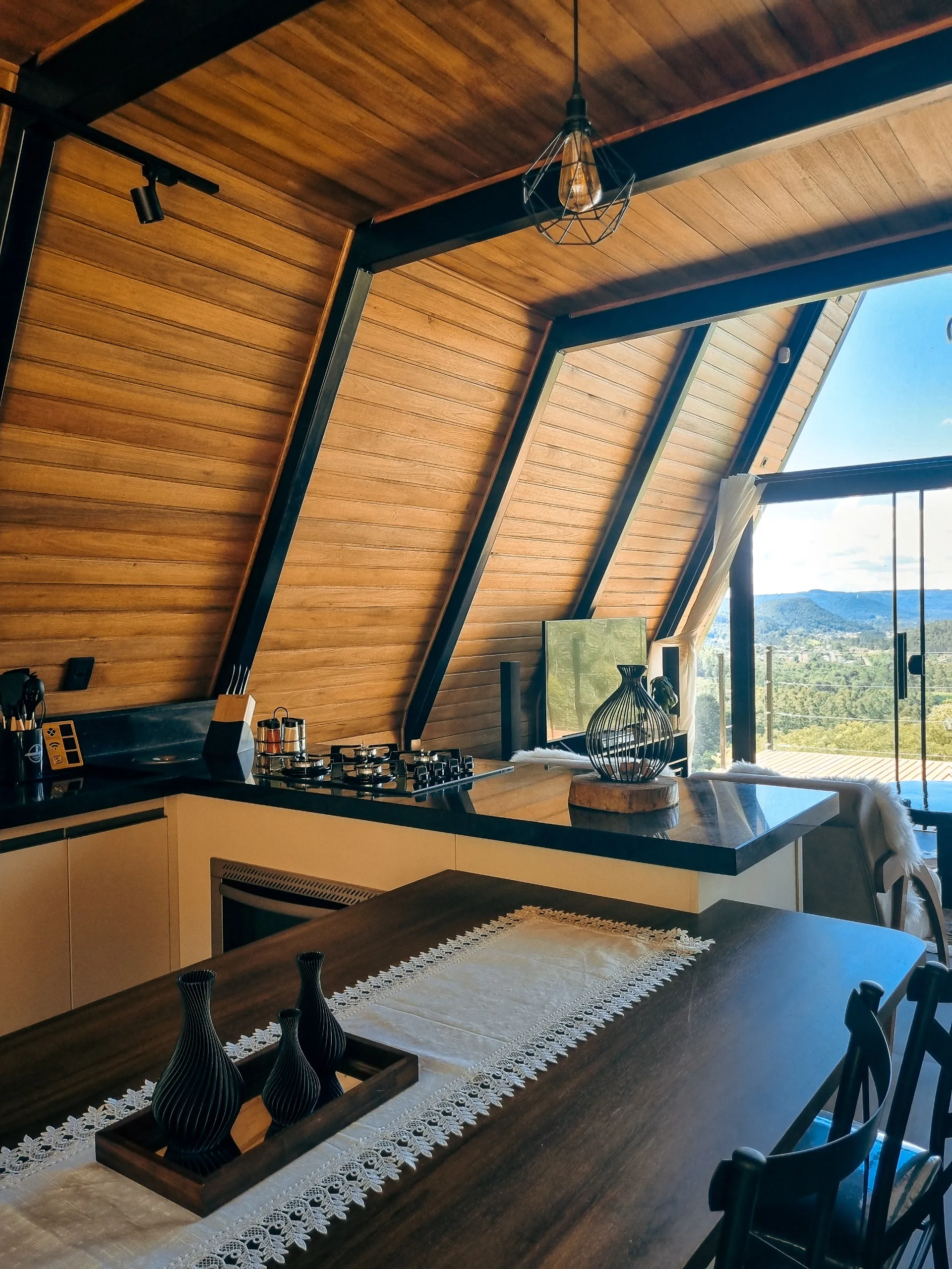 Chalé romântico de Altitude para casais. Banheiro completo com Hidromassagem, toalhas, roupões, chinelos e amenities. Cozinha completa e equipada com louças e eletroportáteis. Sala ampla com pé direito duplo, TV smart 50', sofá cama, calefator e uma vista espetacular. Quarto no mesanino com cama queen, ar condicionado, roupas de cama e cobertas. Deck frontal com vista panorâmica. Área externa conta com: gazebo, mesa, cadeiras, churrasqueira gourmet, balanço duplo e um lago de carpas ornamentais com cascata.