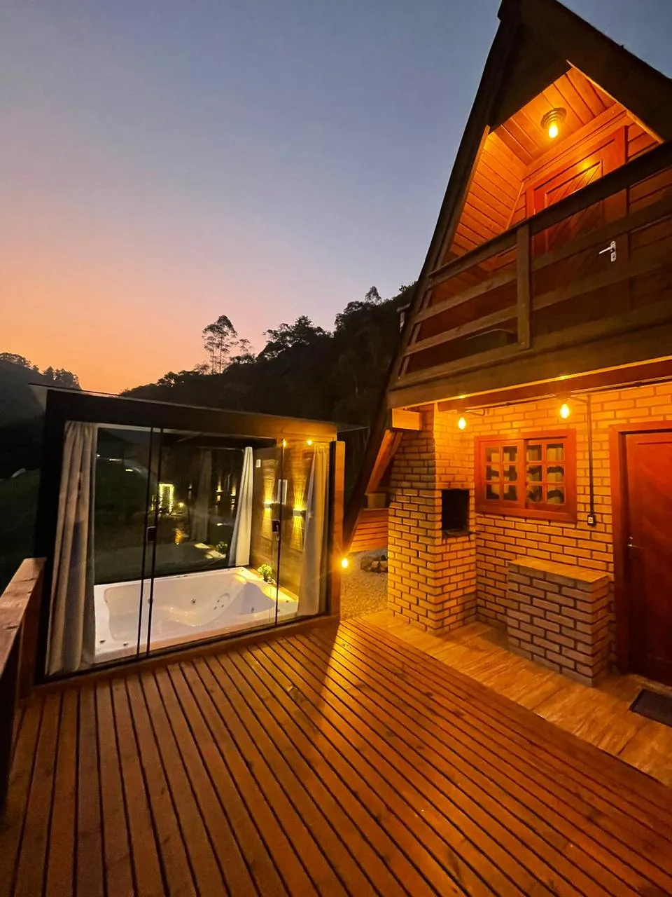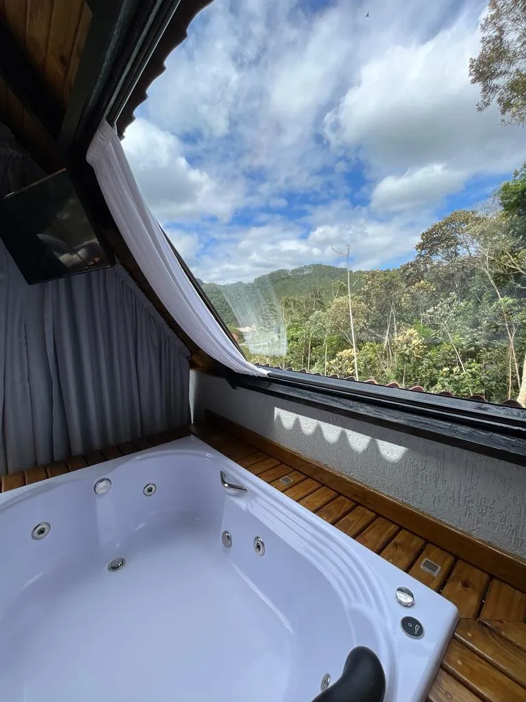 O chalé 1 conta com ampla variedade de equipamentos e utensílios de cozinha, além de roupas de cama e uma linda vista da sacada do quarto e do deck, que contempla com uma jacuzzi com hidromassagem aquecida! Possui 2 andares, na qual no piso superior possui 2 quartos, ambos com 1 cama de casal e é disponibilizado 1 colchão de solteiro extra!