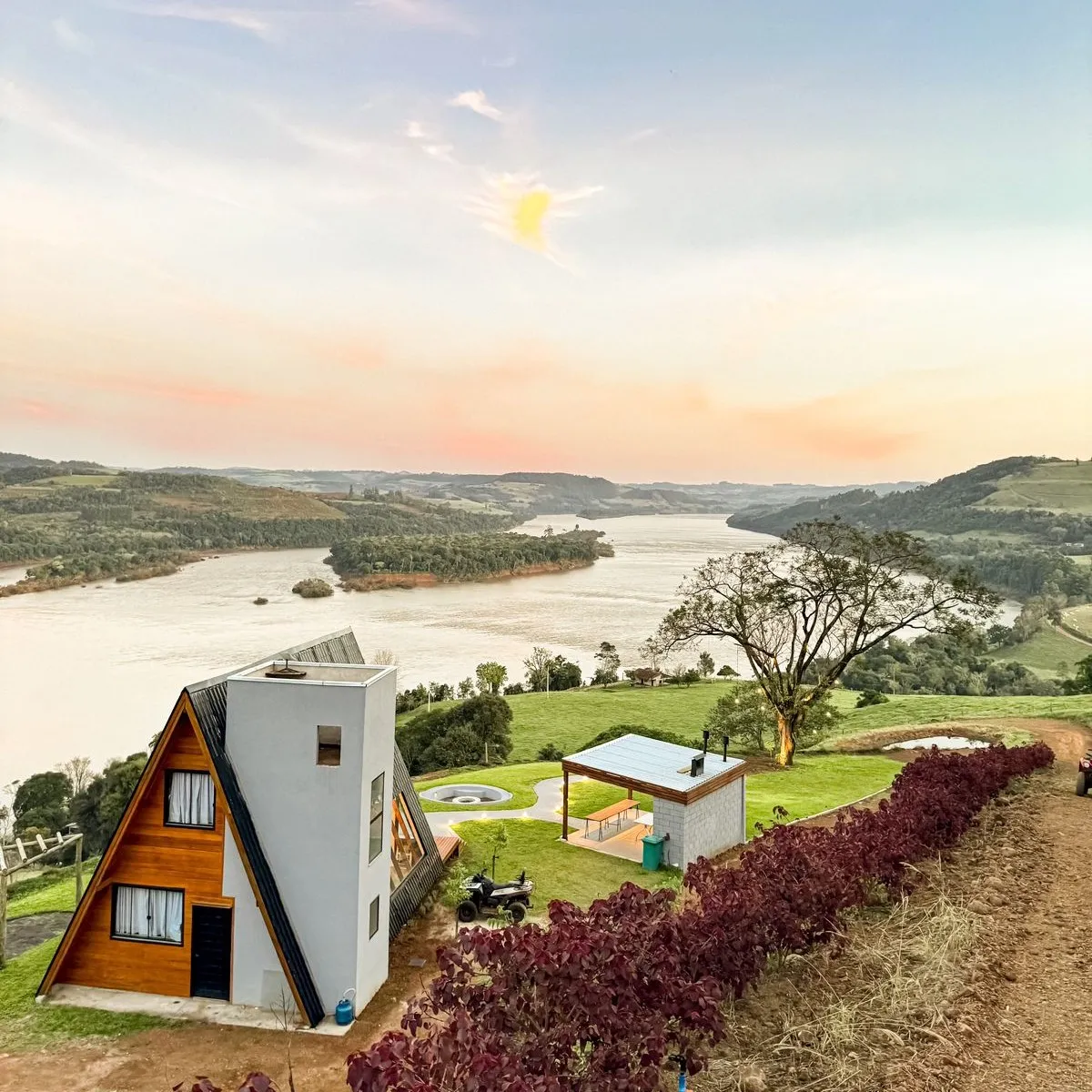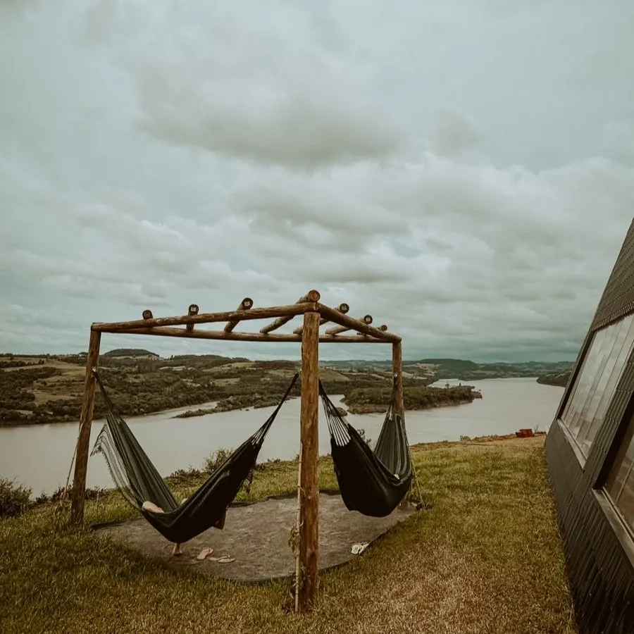 O Chalé da Árvore, localizado em Palmitos, Santa Catarina, oferece um refúgio acolhedor com vista espetacular para o Rio Uruguai. Cercado pela natureza e em um ambiente tranquilo, o chalé garante privacidade e segurança. Com dois quartos equipados com camas queen, dois banheiros espaçosos, uma cozinha completa e uma sala de estar com grandes janelas de vidro, é possível desfrutar de uma vista deslumbrante do rio. A área externa conta com uma charmosa lareira, espaço gourmet com churrasqueira, forno de pizza e fogão a lenha, além de hidromassagem ao ar livre para momentos de relaxamento. A internet via satélite Starlink garante conectividade, permitindo que o conforto se combine com a tranquilidade do lugar.