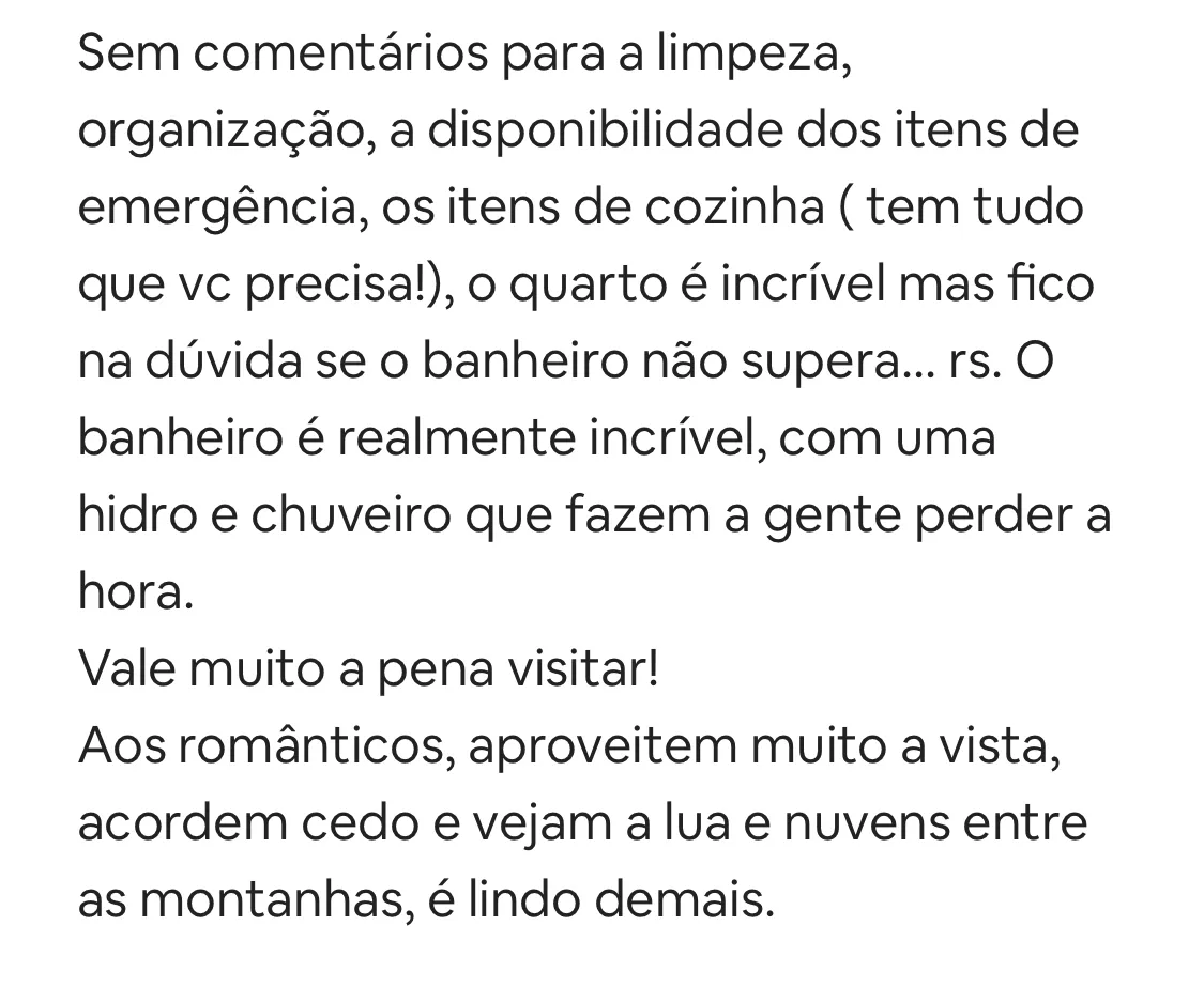 O local conta com segurança 24h em um condomínio fechado, está localizado a 12 minutos do centrinho de Itaipava, com acesso pavimentado. Os hóspedes têm à disposição uma piscina e um rooftop de uso exclusivo, além de Wi-Fi em toda a casa, filtro de água, facilidade para serviço de delivery e serviços adicionais que podem ser contratados à parte. Também possui um gerador de energia elétrica.
