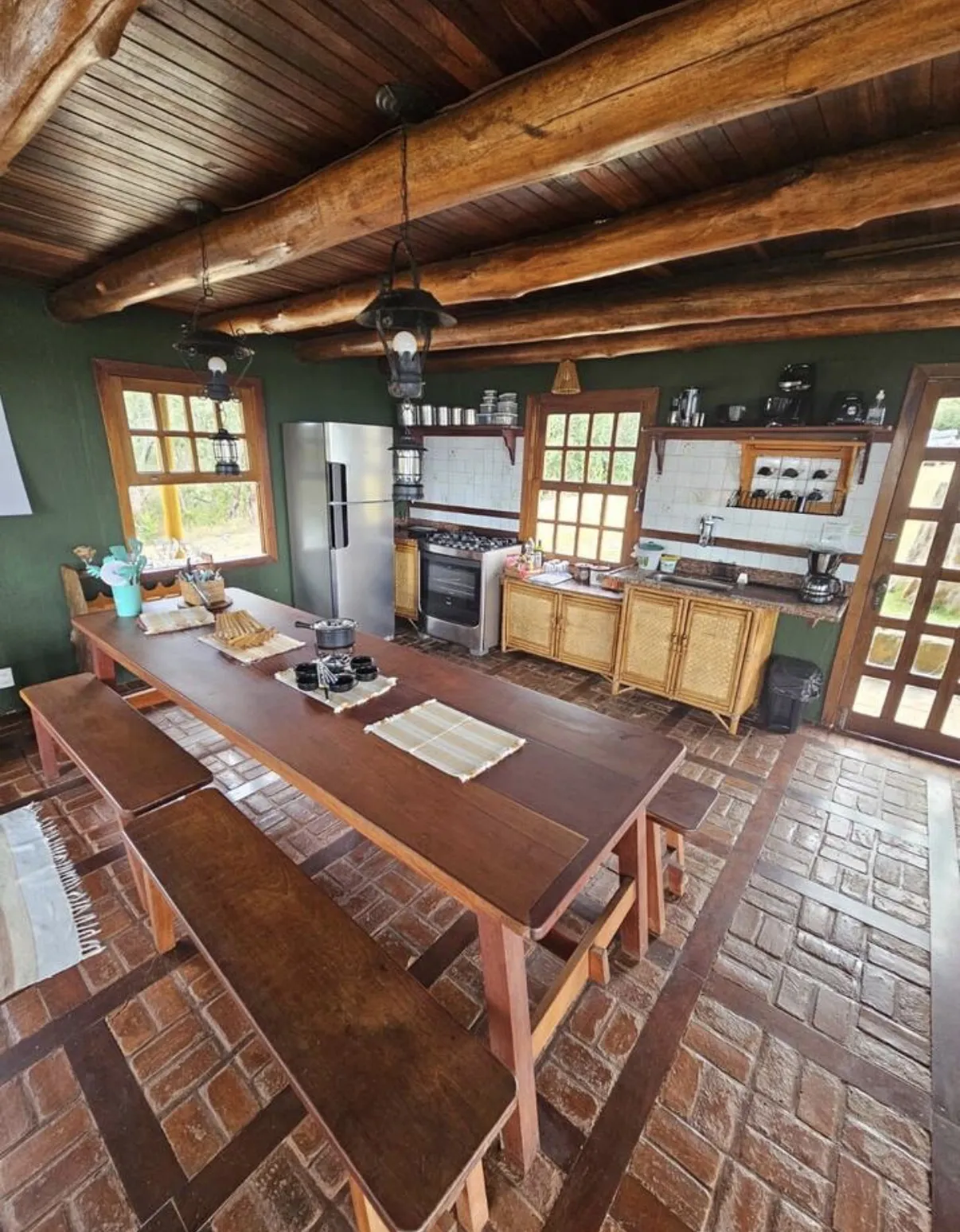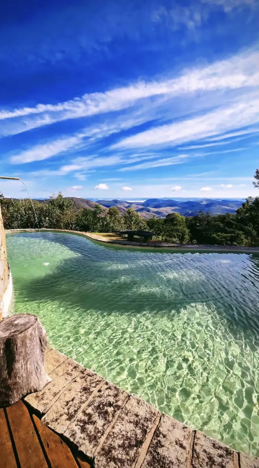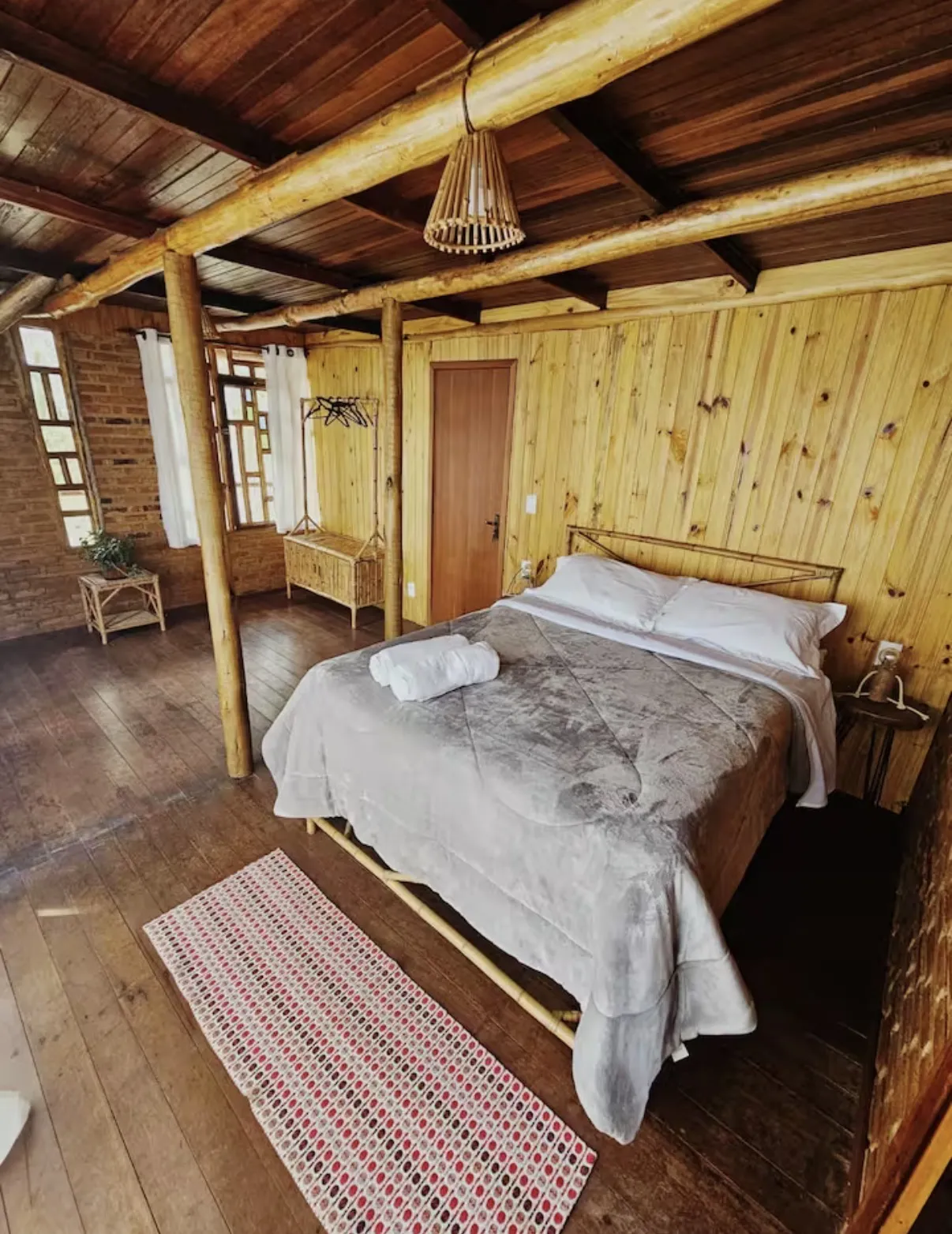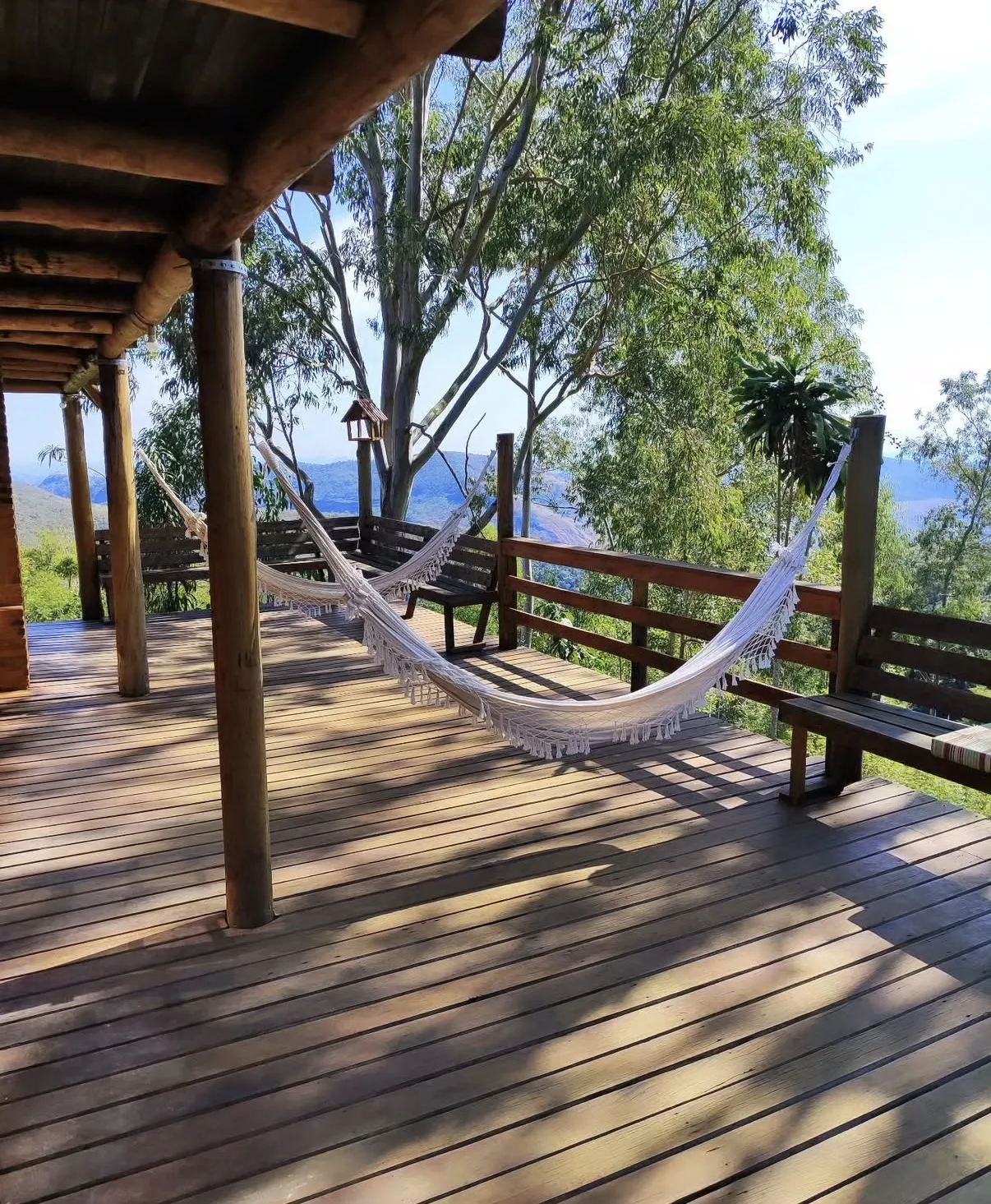 Distribuído em dois pavimentos, o chalé conta com uma suíte, um quarto de casal e um quarto de solteiro no andar superior, enquanto o térreo reúne sala integrada à cozinha, lavabo, varanda e piscina natural abastecida por água de nascente. O espaço dispõe de aquecimento a gás nos chuveiros e estrutura pensada para conforto em meio à natureza, mantendo o equilíbrio entre rusticidade e funcionalidade, em um refúgio seguro e reservado para estadias tranquilas e autênticas.