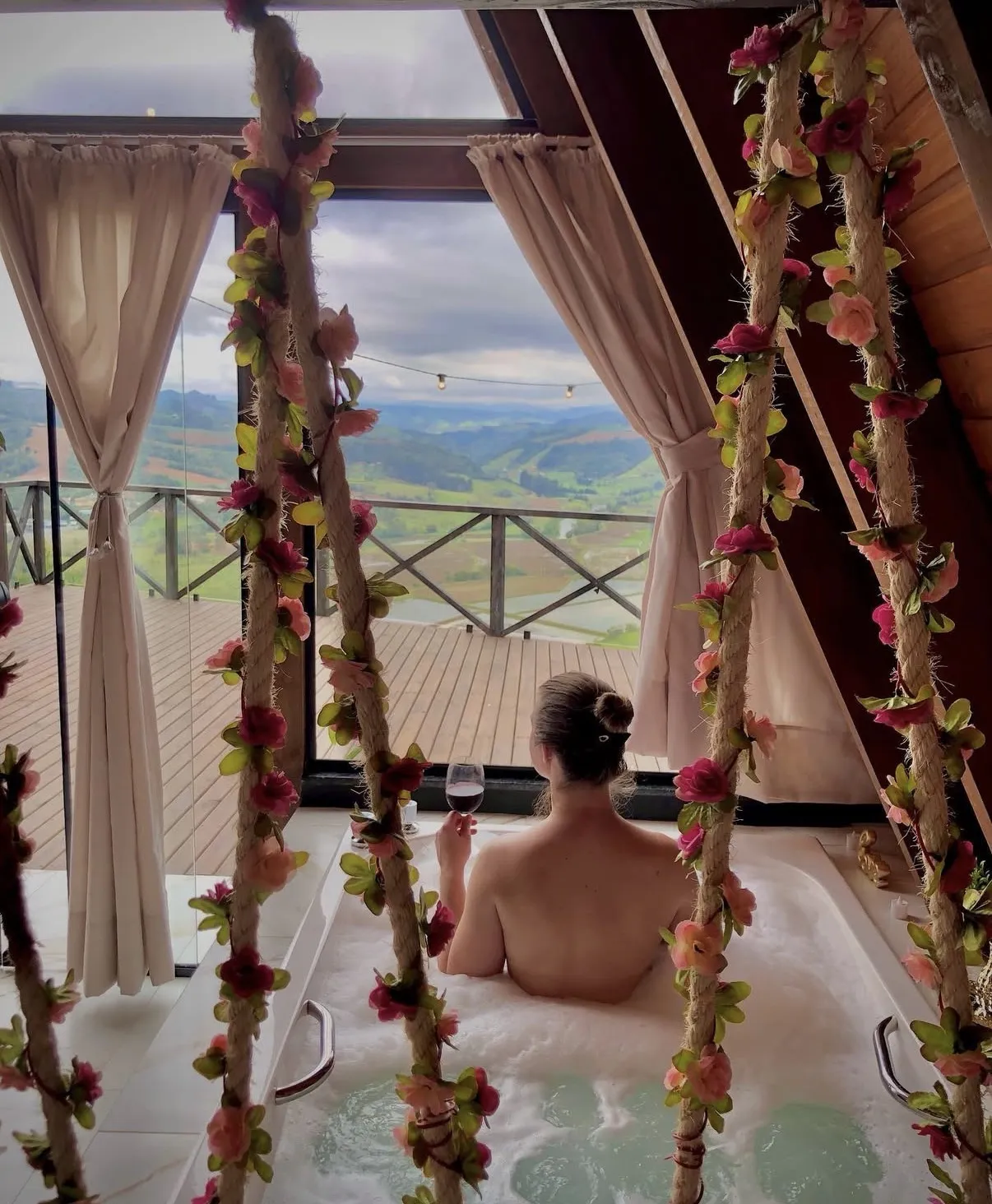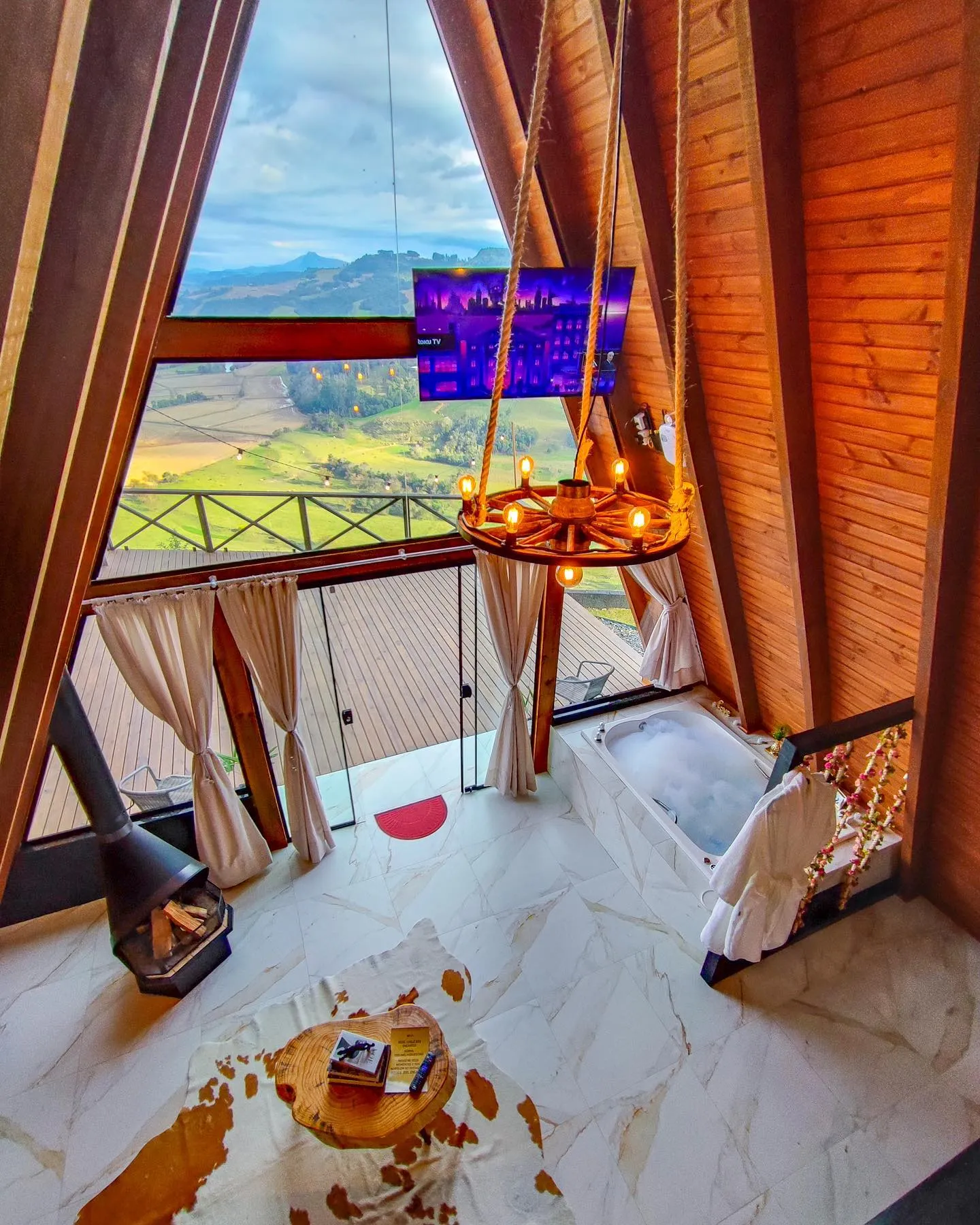 O local é perfeito para quem procura um ambiente aconchegante, uma vista de tirar o fôlego e deseja curtir um lugar com muita paz e ar puro. A hospedagem conta com uma incrível hidromassagem com cromoterapia, ideal para relaxar e ter momentos únicos e inesquecíveis. Além disso, possui uma lareira e fogo de chão para os hóspedes se aquecerem nos dias mais frios. O local também conta com um balanço do infinito, perfeito para tirar fotos incríveis.