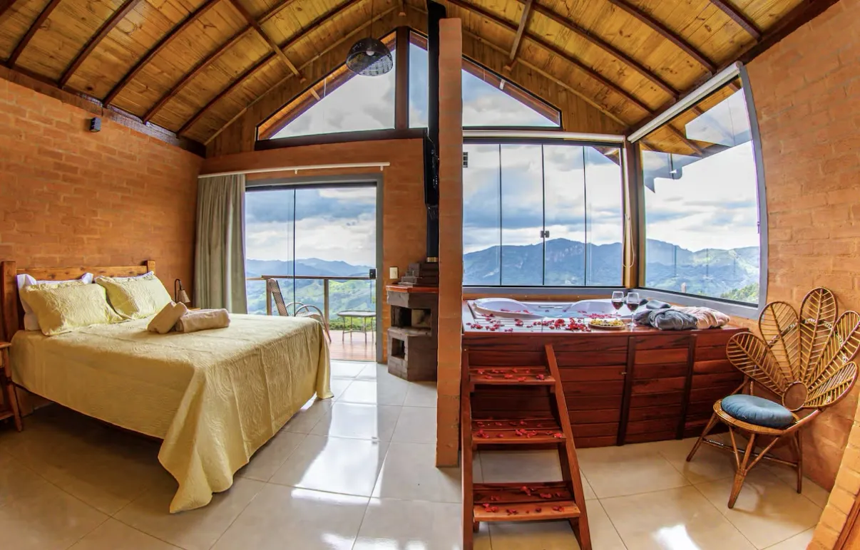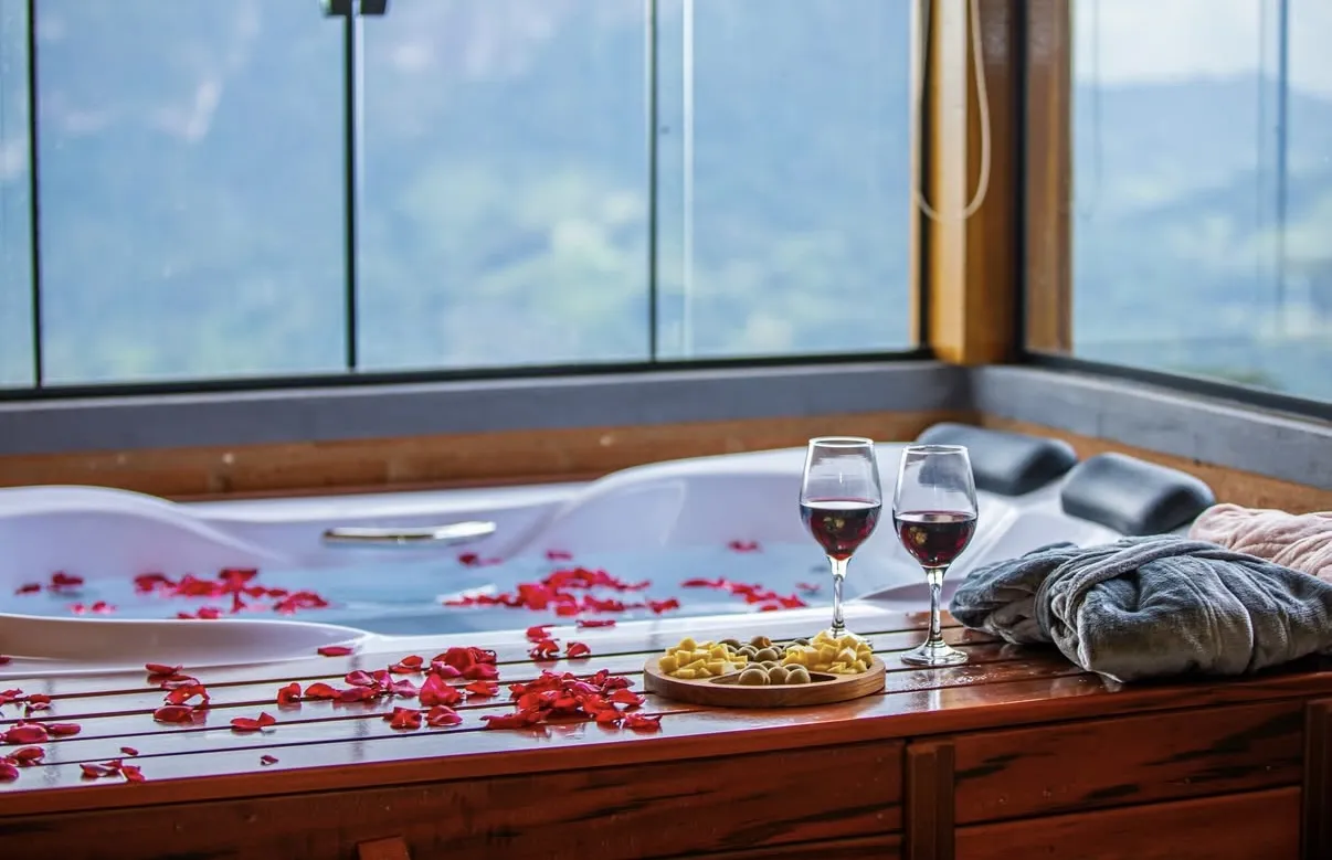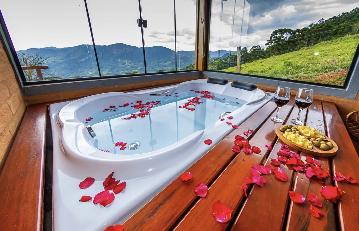 Uma hidromassagem com vista para as montanhas, o silêncio da natureza e o calor de uma lareira, só pra você e pra quem ama!