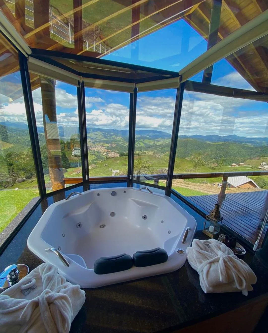 São 3 chalés, todos privativos, com banheira de hidromassagem, cozinha equipada e vista para as montanhas.