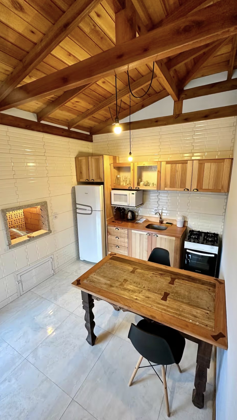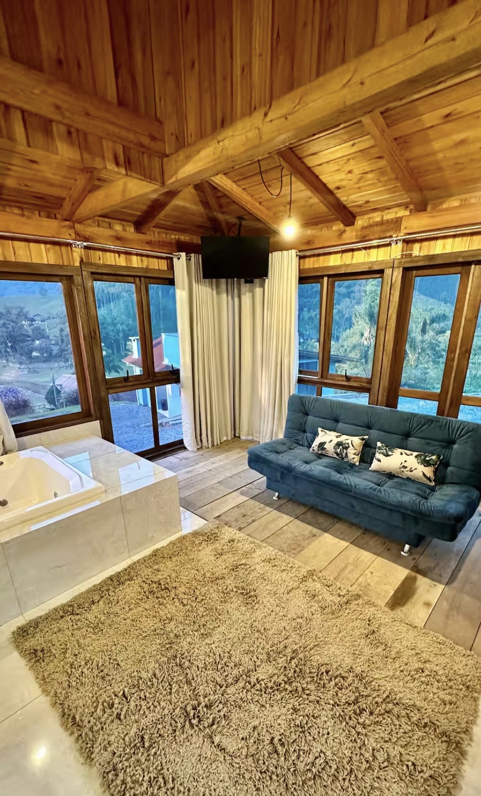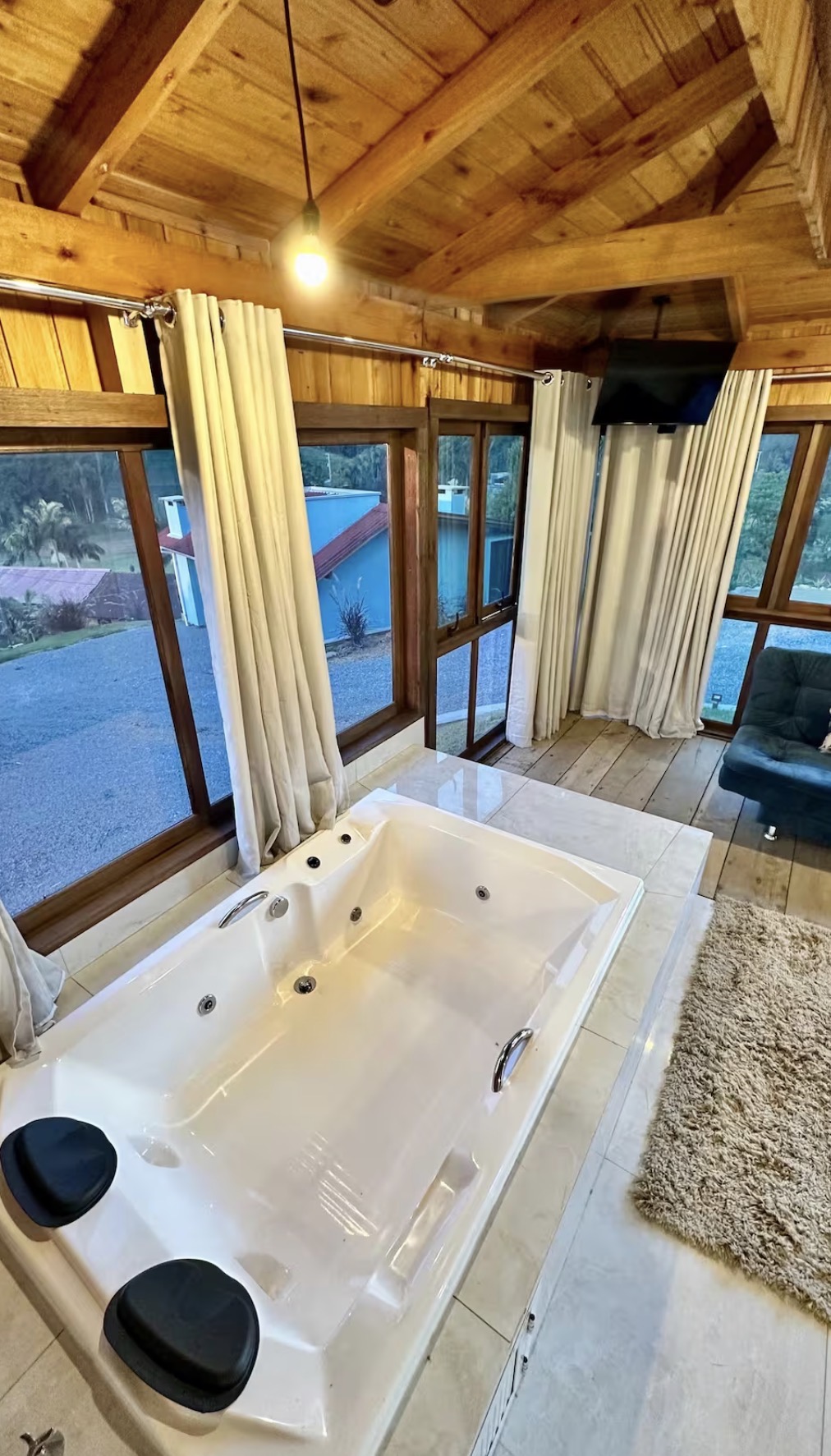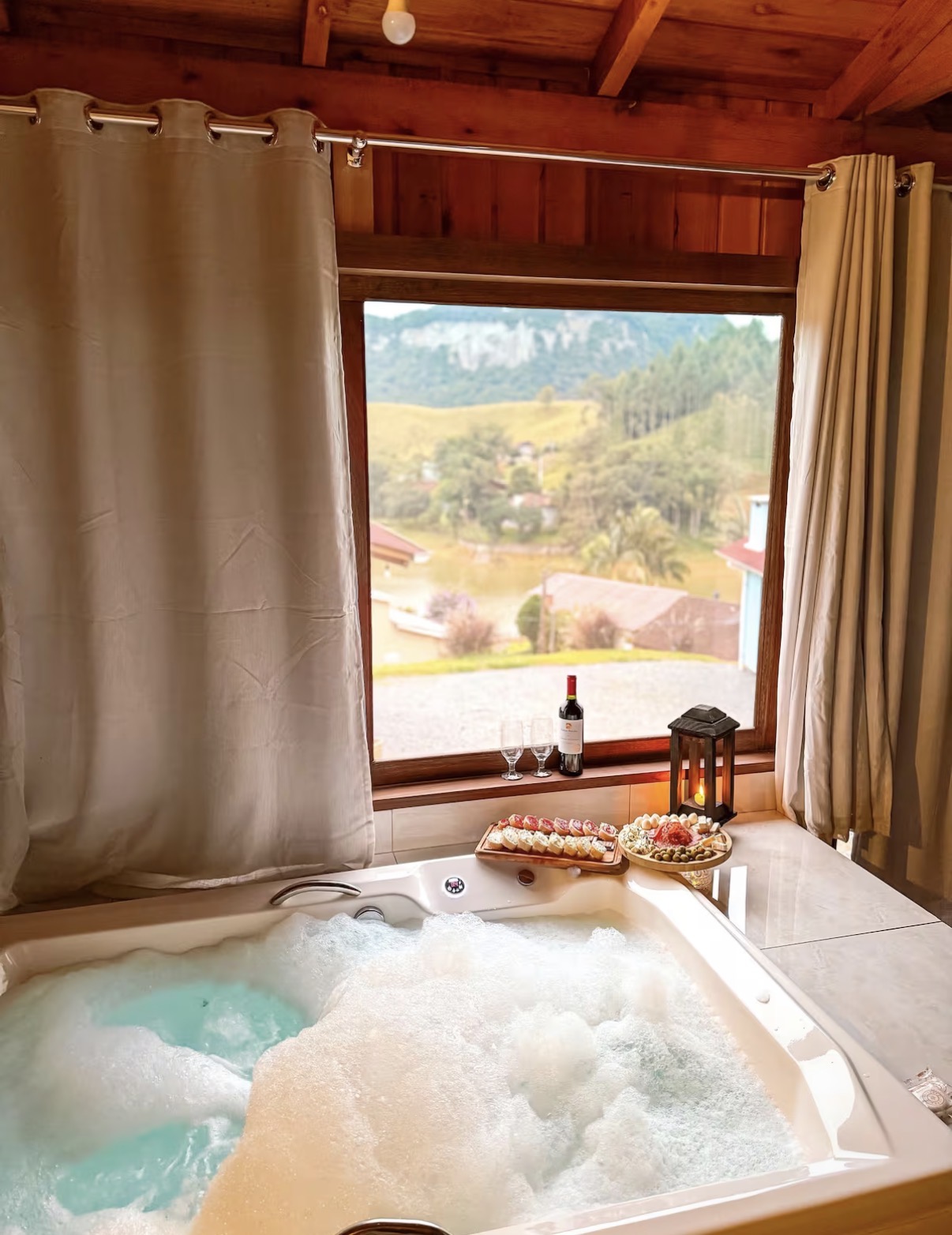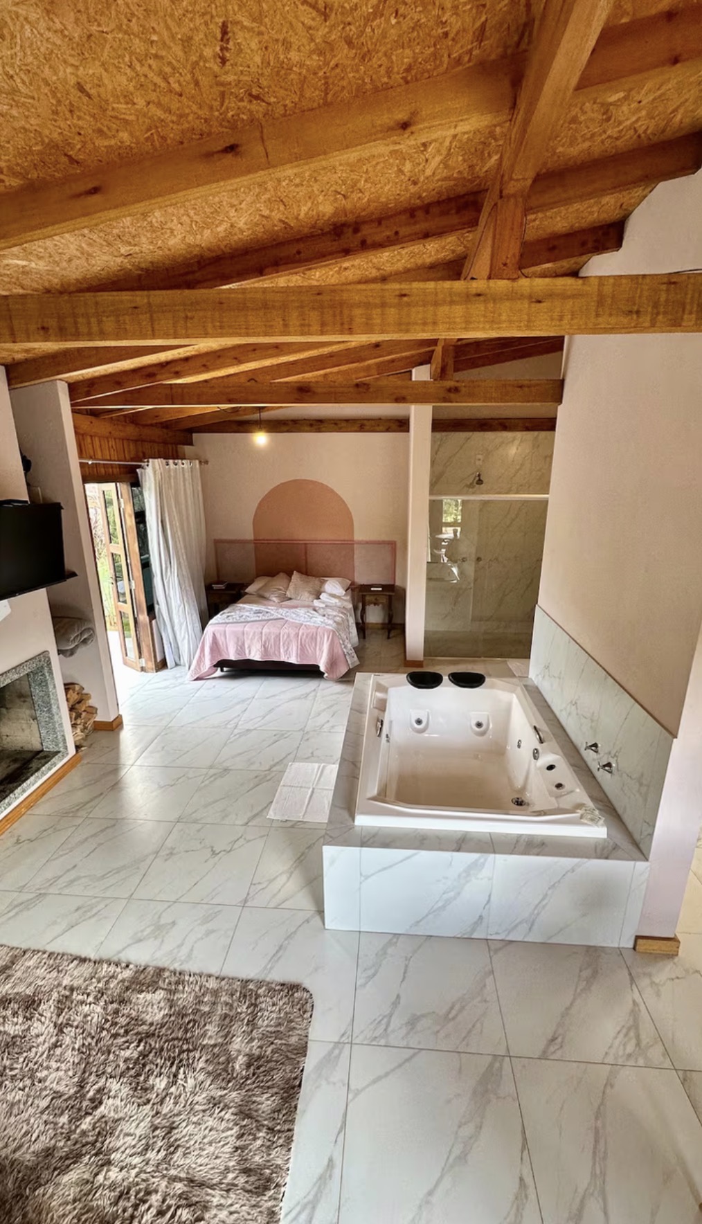 A cabana apresenta ambientes integrados e bem equipados, incluindo cozinha completa com utensílios essenciais e itens básicos para preparo de refeições. A cama possui enxoval de qualidade e a lareira cria um clima acolhedor nos dias frios, com lenha disponibilizada para uso. O banheiro conta com banheira de hidromassagem para casal, sais de banho, além de chuveiro e aquecimento a gás voltado para a natureza.