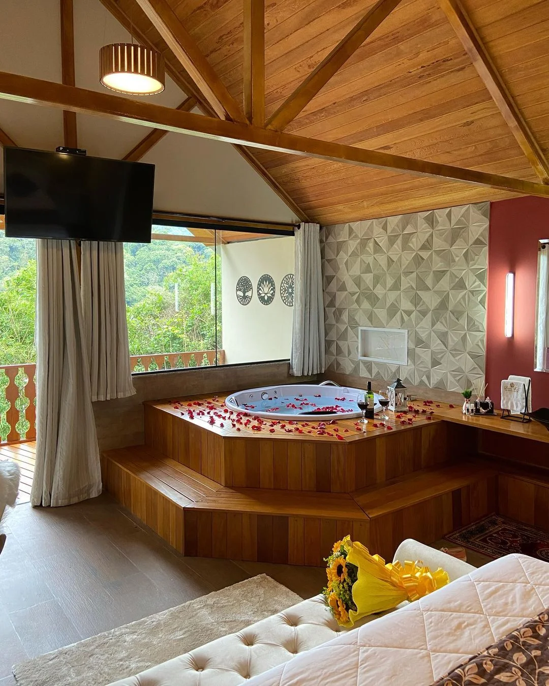 Ar condicionado Secador de cabelo TV a cabo / Smart TV Jacuzzi / Ofurô / Banheira Coberta Frigobar Lareira Máquina de Café Enxoval de Luxo (+ Roupão e Pantufa) Sauna Cozinha Estação de trabalho (mesa e cadeira) Piscina Aquecida ou climatizada Borda Infinita Coberta