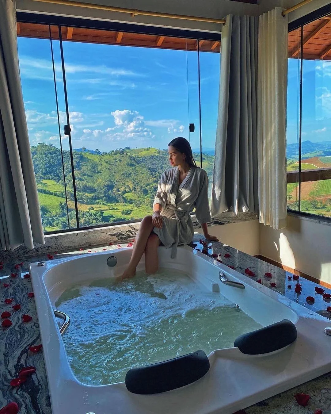 No alto de uma colina com uma vista lindíssima para as montanhas, tanto da varanda quanto da banheira de hidromassagem.