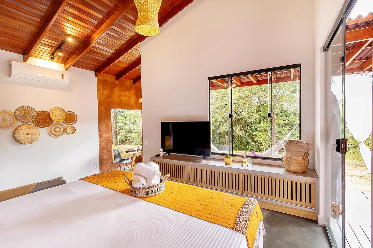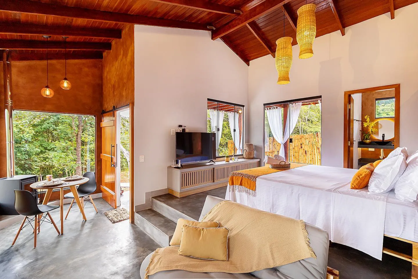 O bangalô especial para quem deseja desfrutar do melhor da natureza ao lado de quem ama. A área interna possui cozinha completa e um espaço com lareira para vivenciar momentos incríveis. A área externa conta com banheira, rede, fogueira de chão, trilha para lagoa, além de passeios de canoa e a cavalo disponíveis no local.