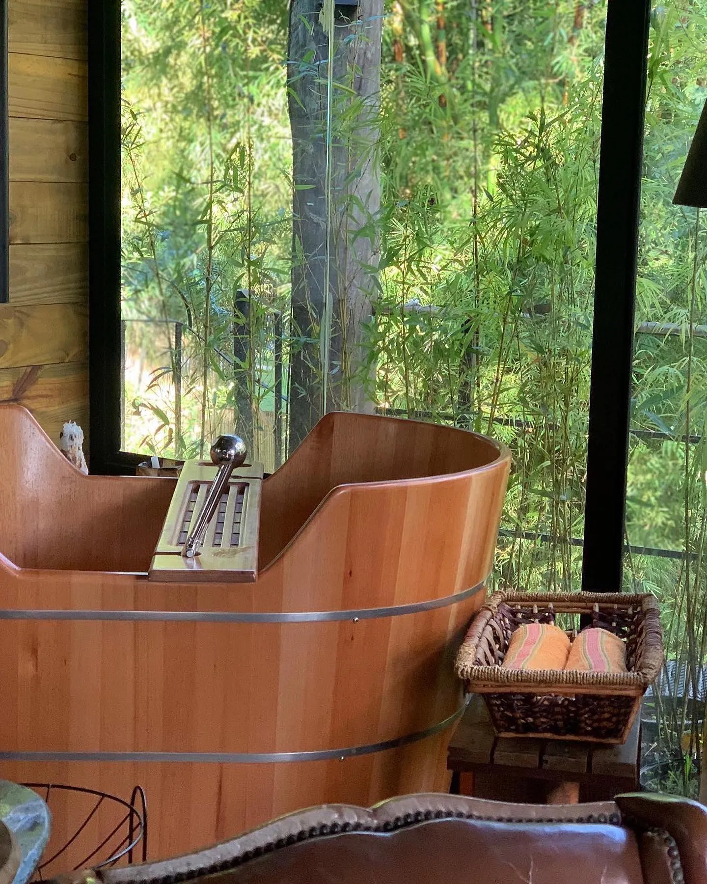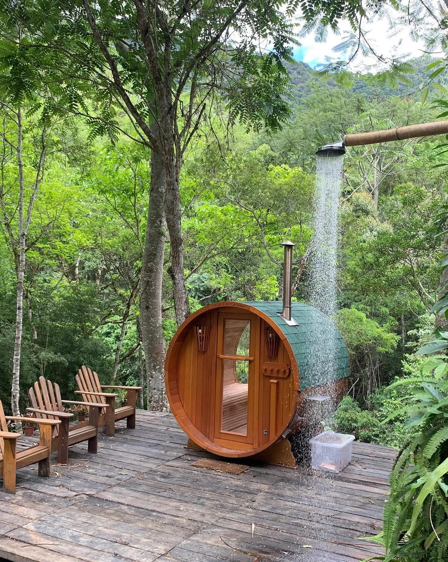 Destaque para a sauna rústica na parte externa, que possui um vidro voltado para a mata e um chuveirão, além das diversas opções de trilhas ao redor.