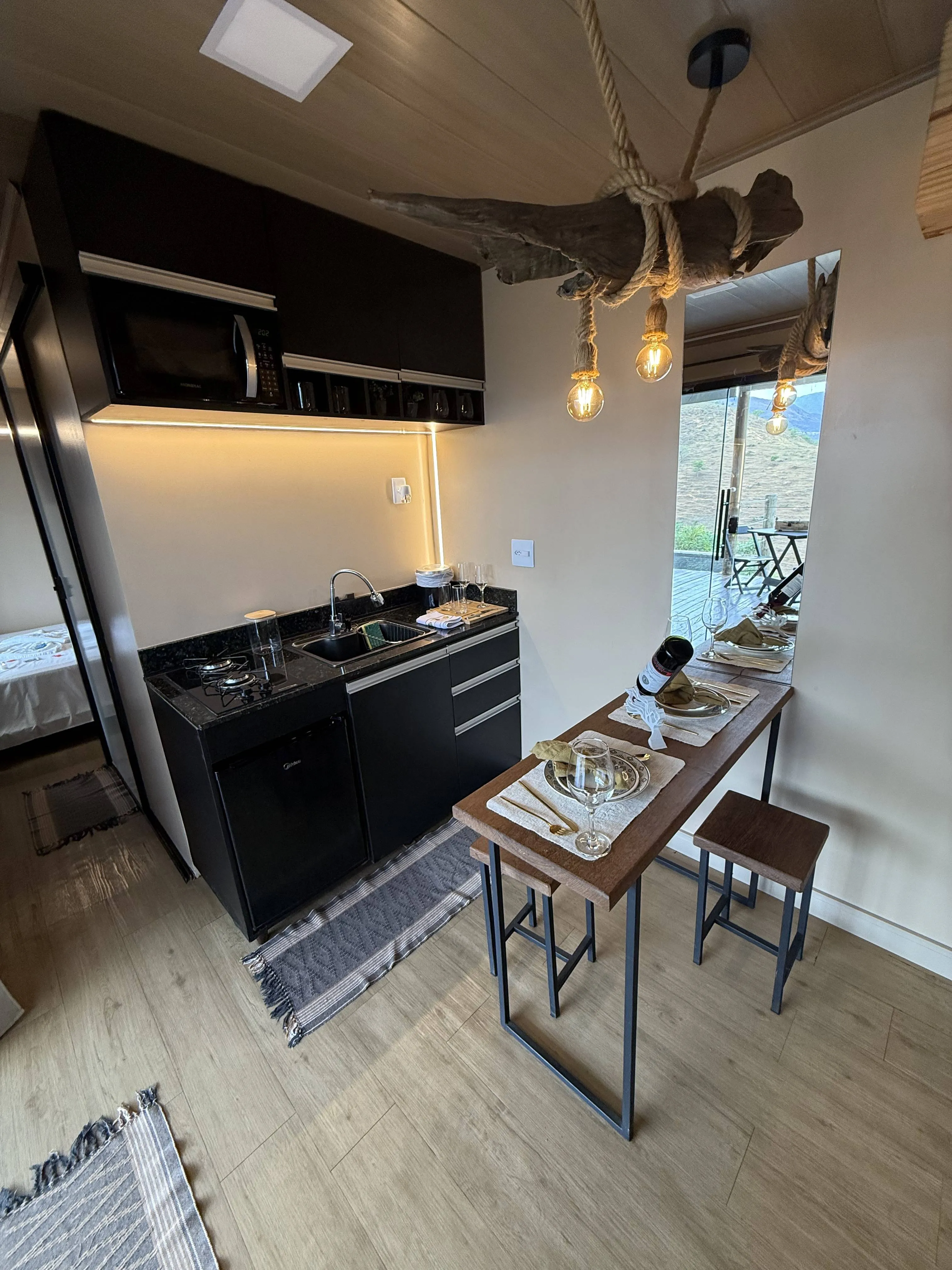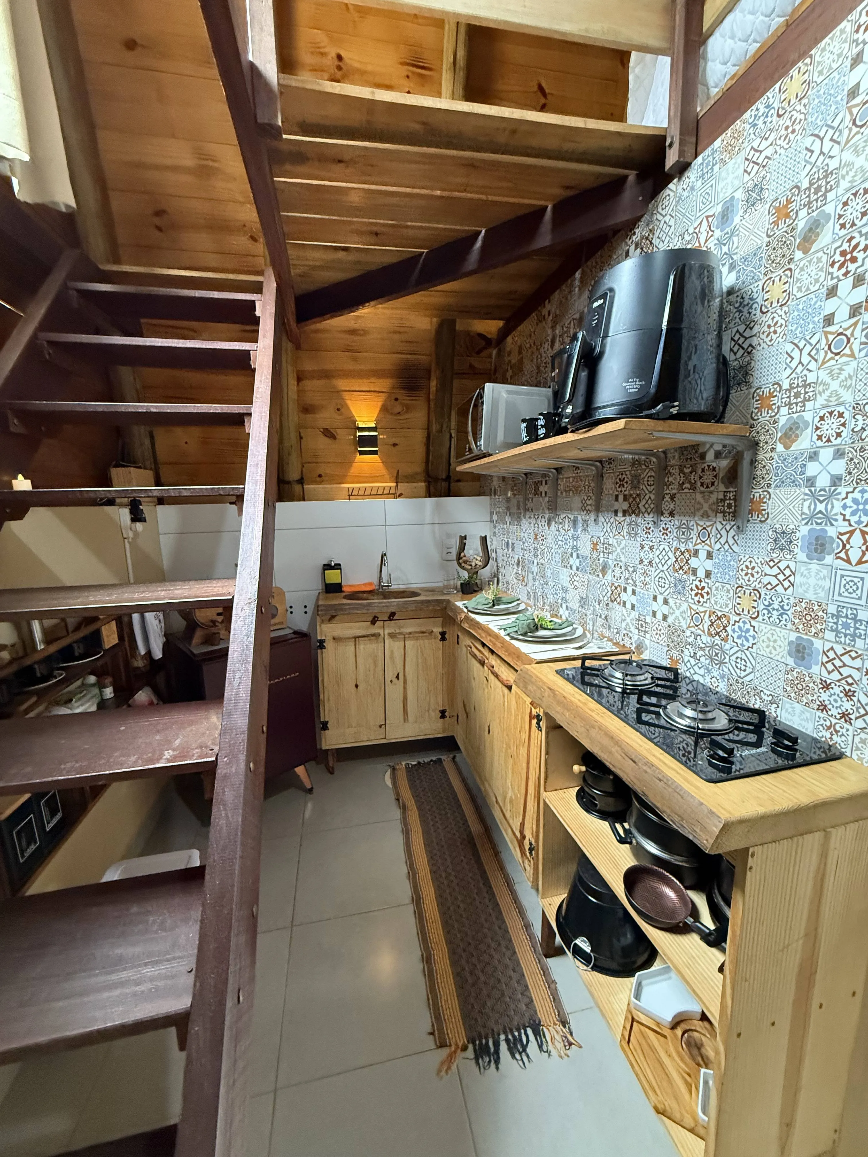 O espaço dispõe de cozinha completa, equipada com cooktop e utensílios essenciais para preparo das refeições, além de frigobar, air fryer, micro-ondas, cafeteira, sanduicheira e churrasqueira. São disponibilizados enxoval completo de cama e banho, edredons, itens de higiene pessoal e secador de cabelo, garantindo praticidade e comodidade durante toda a estadia.