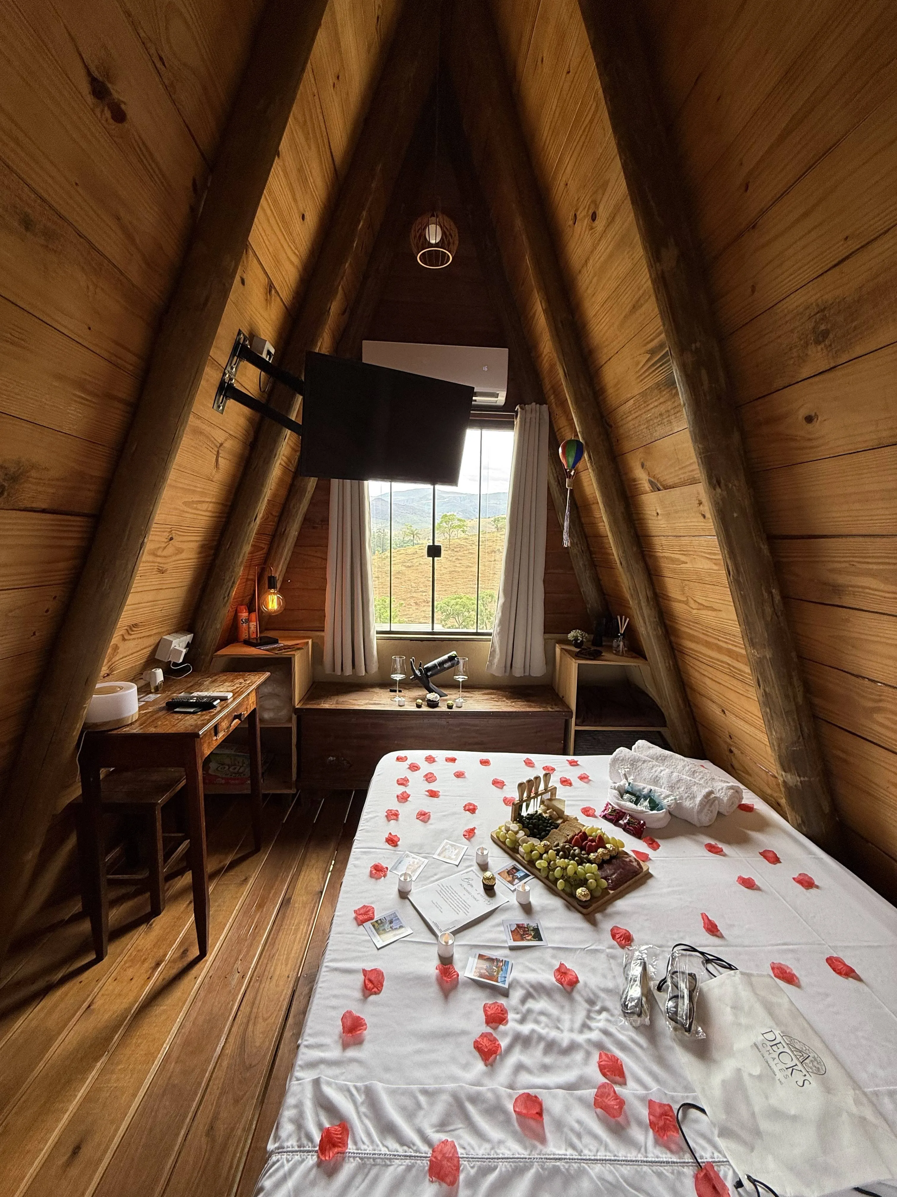 O Deck’s Chalés oferece uma experiência aconchegante em meio à serra, ideal para casais que buscam conforto, privacidade e contato com a natureza. A acomodação conta com banheira de hidromassagem com vista, climatização, televisão e cama box casal, proporcionando um ambiente pensado para descanso e momentos especiais.