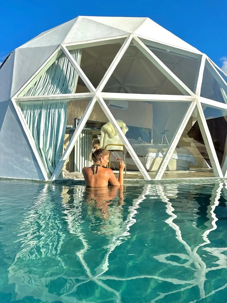 O Domo Bananeiras tem uma linda vista panorâmica do pôr do sol. Dentro, há um banheiro luxuoso, cama, mesa, cozinha completa e, na área externa, uma piscina aquecida, iluminada e com hidromassagem esperando pelos hóspedes. Há também uma lareira para assar marshmallows ou se aquecer tomando um vinho. Além disso, uma rede suspensa para contemplar o céu e uma churrasqueira para preparar um churrasco. Surpreendentemente, uma passagem secreta dá acesso ao cinema privativo, sala de jogos e uma suíte master integrada. Nesse segundo pavimento, podem ser acomodados mais três hóspedes. Uma cesta romântica servida no Domo leva o café da manhã dos sonhos, que está incluso na estadia.