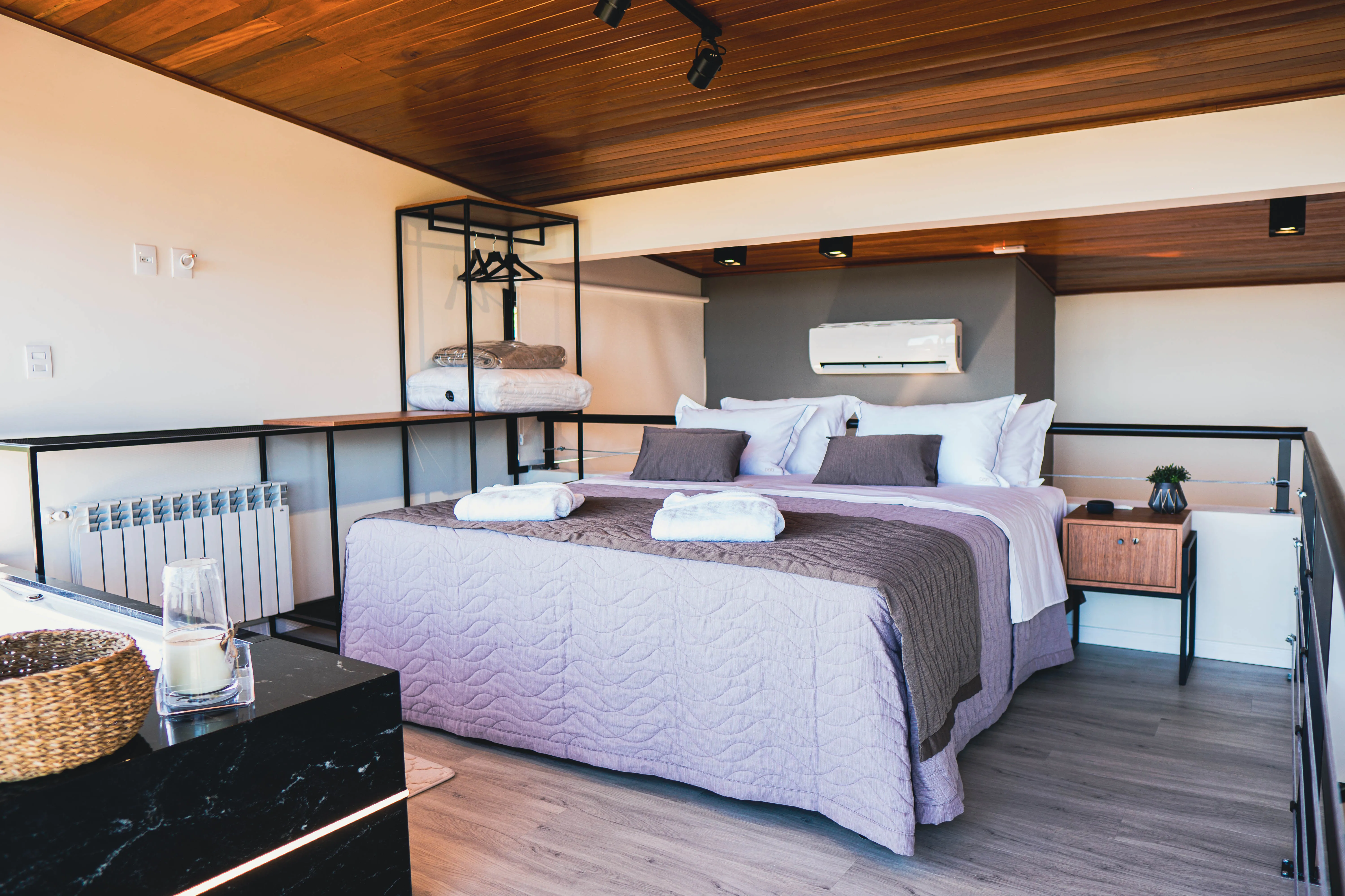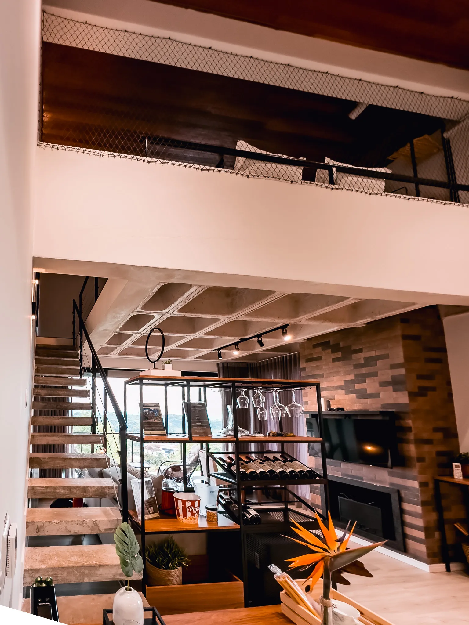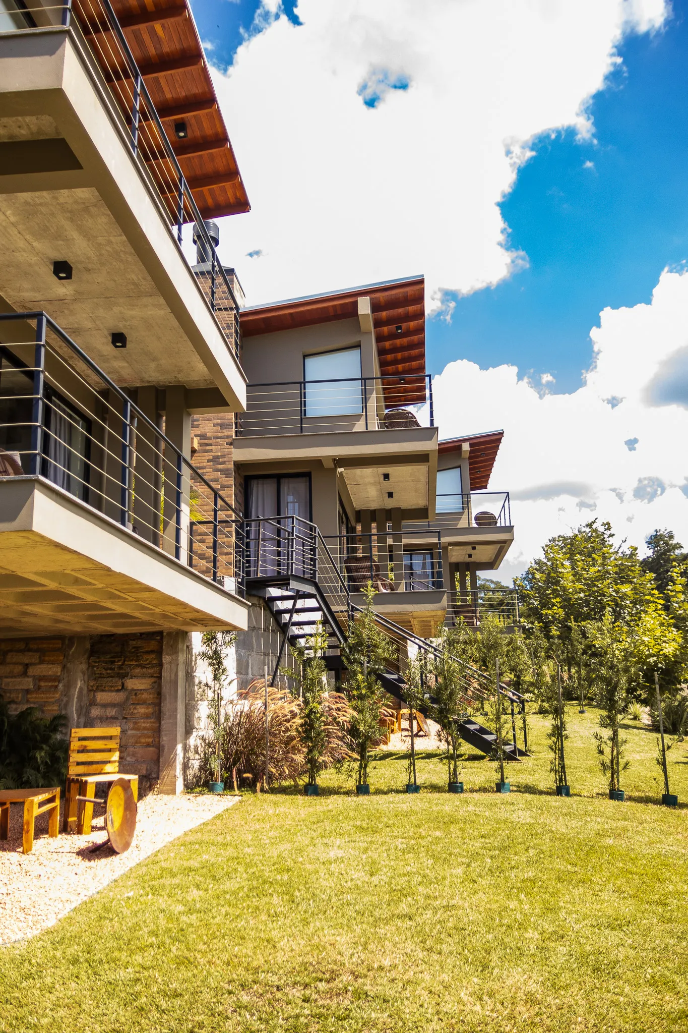 As pousadas contam com construções independentes e completas, distribuídas em dois andares, com varandas externas em ambos os pisos e vista encantadora do pôr do sol. A combinação entre autonomia, conforto e cenário inspirador transforma a estadia em uma vivência exclusiva, perfeita para quem deseja desfrutar do melhor que a terra dos vinhedos tem a oferecer.