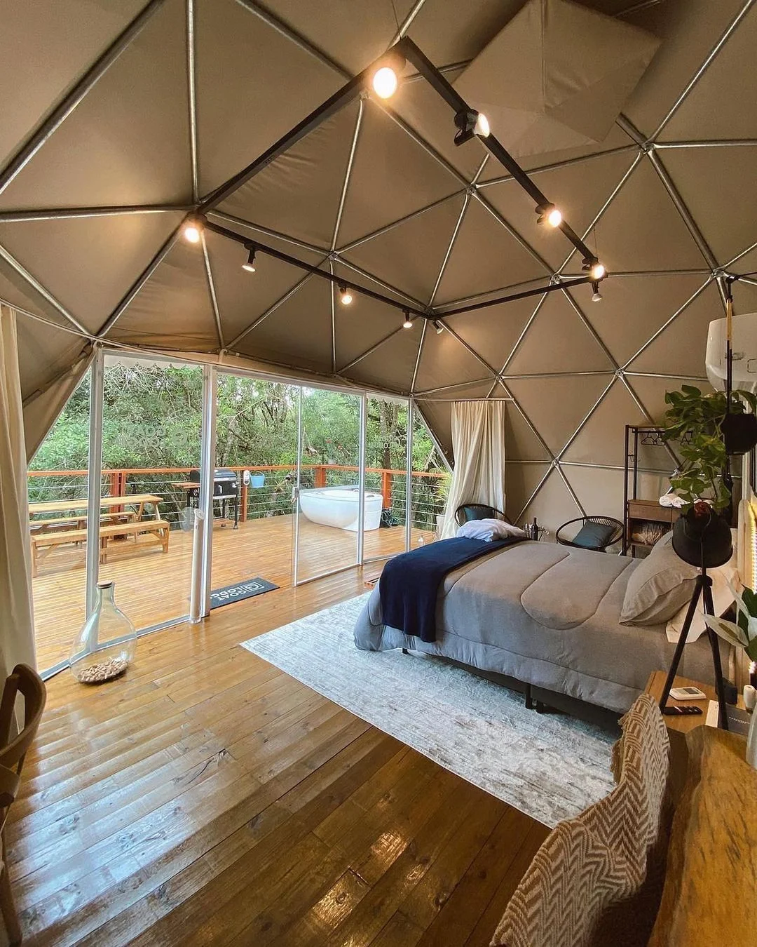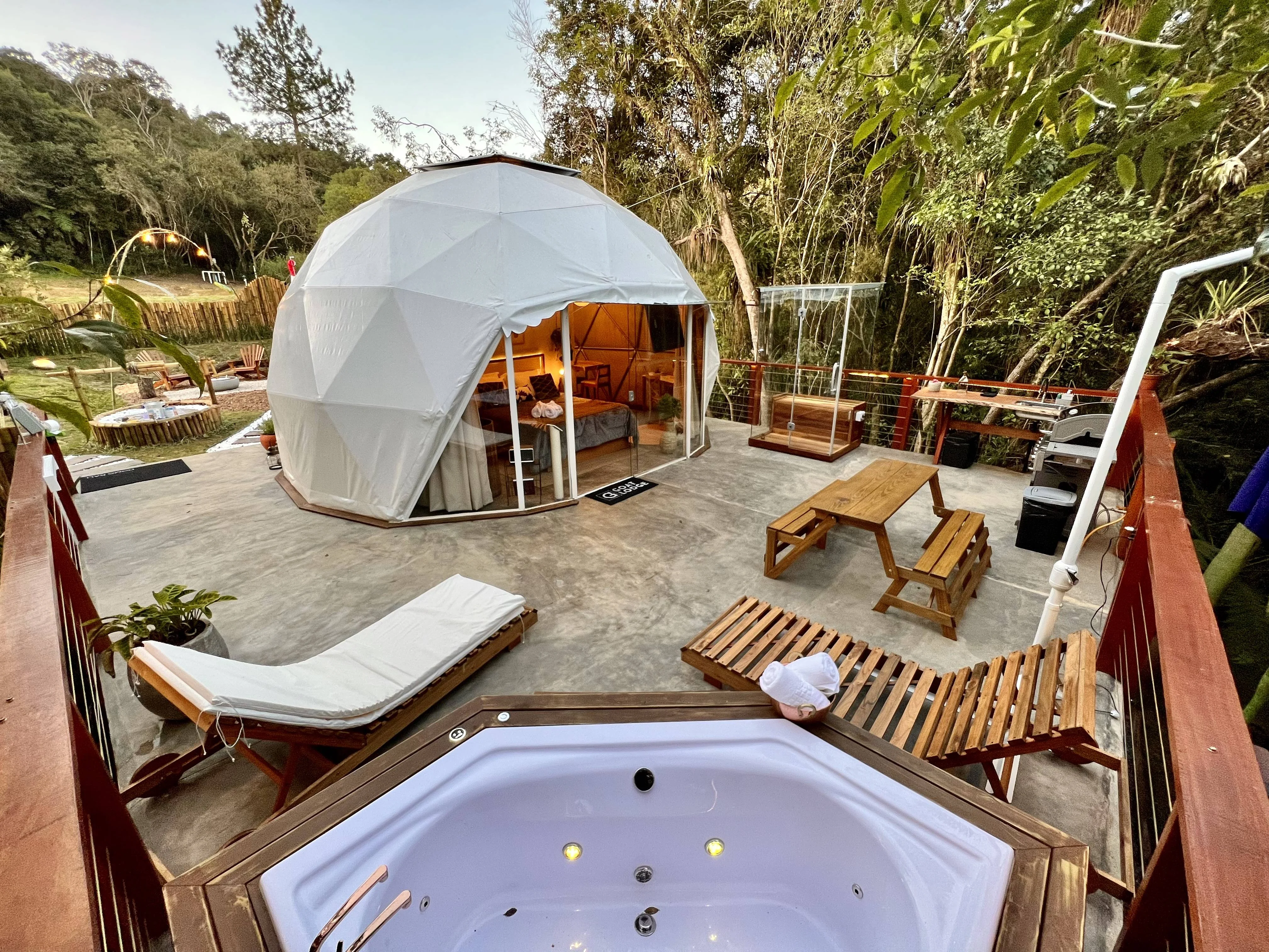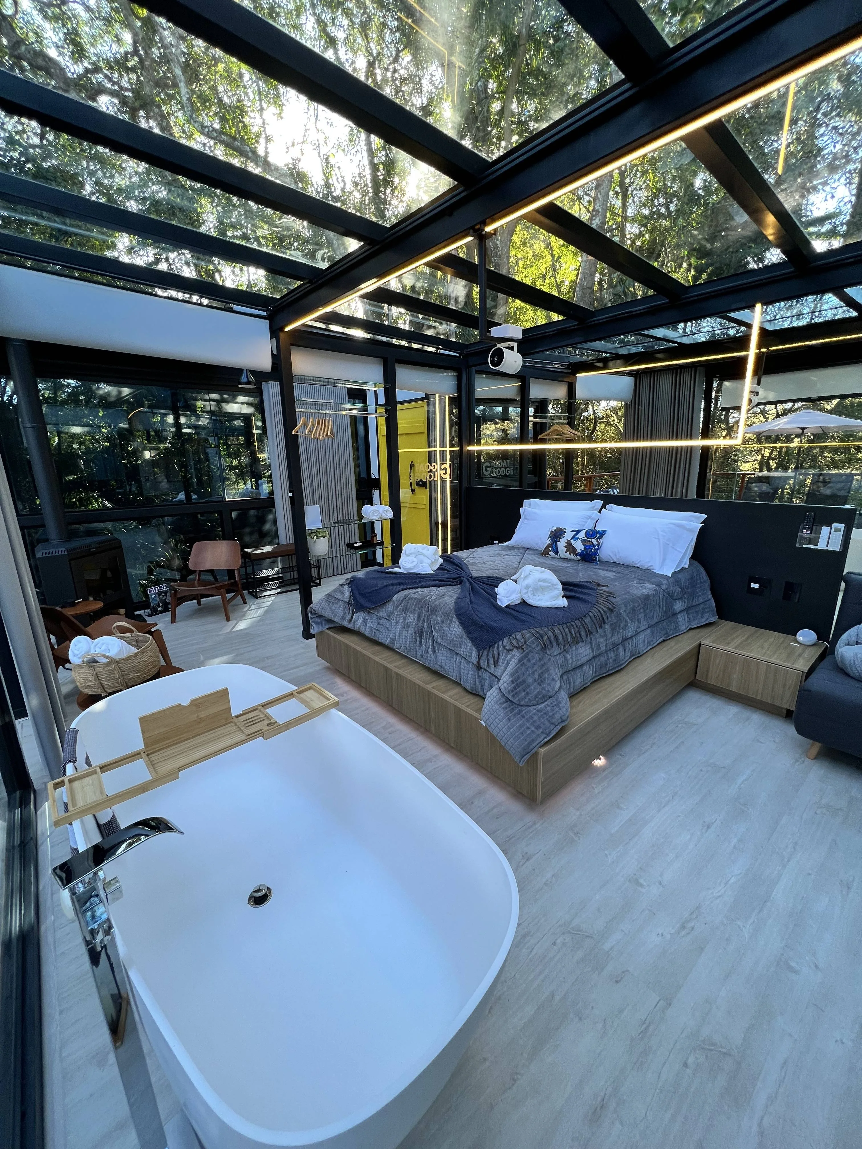 O LOFT São José proporciona uma experiência luxuosa e privativa em meio à natureza, oferecendo conforto e exclusividade em um ambiente único. Com 40 m² e totalmente envidraçado, o loft está localizado em uma área cercada, com entrada segura através de sistema digital. Construído sobre um deck de madeira rodeado pela mata, o local inclui um lago privativo, criando um ambiente perfeito para relaxamento. O espaço conta com uma cama Queen Size com pillow top, smart TV na área externa, projetor de 100”, Amazon Alexa, som Bluetooth, além de roupas de cama e banho de qualidade. A internet de alta velocidade e o ar-condicionado quente e frio garantem o conforto em todas as estações. A lareira interna a lenha, banheira de imersão interna e o chuveiro com água quente proporcionam momentos de aconchego. A cozinha completa, com máquina de café Nespresso e máquina de gelo, oferece praticidade para quem deseja preparar suas refeições. Na área externa, o loft conta com uma banheira de hidromassagem aquecida com cromoterapia, lareira a álcool, churrasqueira a gás, sauna úmida transparente e espreguiçadeiras para aproveitar o ambiente ao máximo. O gazebo com redário, a área externa coberta com pia e mesa, e o estacionamento ao lado do loft, completam a estrutura do local. Além disso, o espaço é pet friendly, tornando-o ainda mais acolhedor para todos.