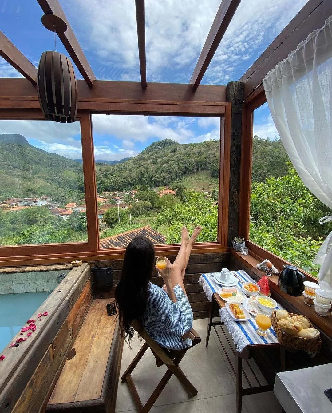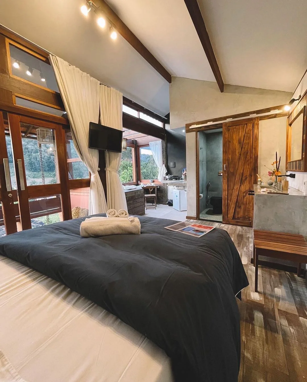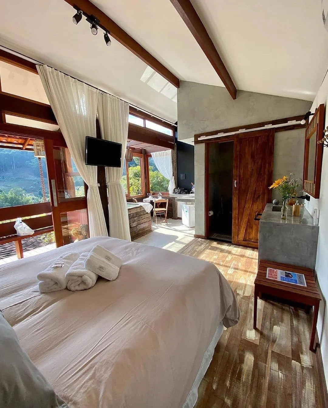 A acomodação oferece cama Queen, frigobar, cooktop, ofurô com teto de vidro e vista para o céu, varanda com rede, água da nascente, chuveirão e um delicioso café da manhã completo.