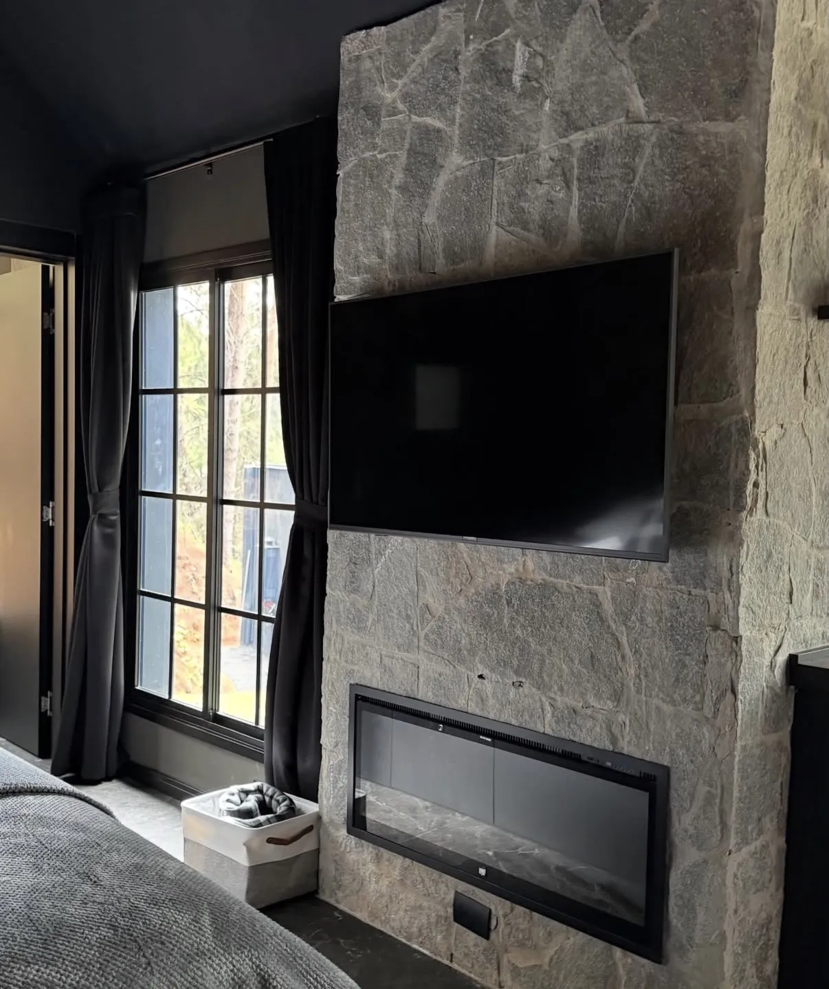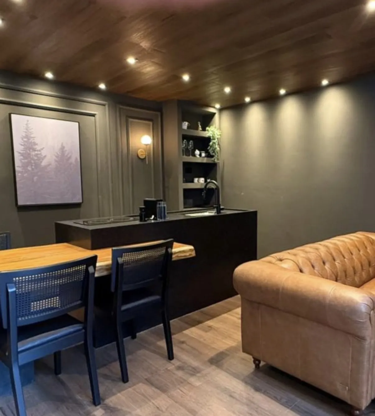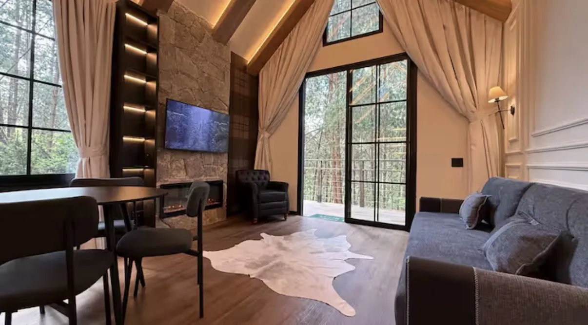 A hospedagem conta com suíte com cama king no pavimento superior e ambientes integrados no nível inferior, incluindo estar, jantar, dormitório adicional, banheiro e espaço de apoio. O deck externo com lareira suíça complementa a experiência, tornando a cabana ideal para casais e famílias que buscam conforto, tranquilidade e conexão com a natureza em Campos do Jordão.